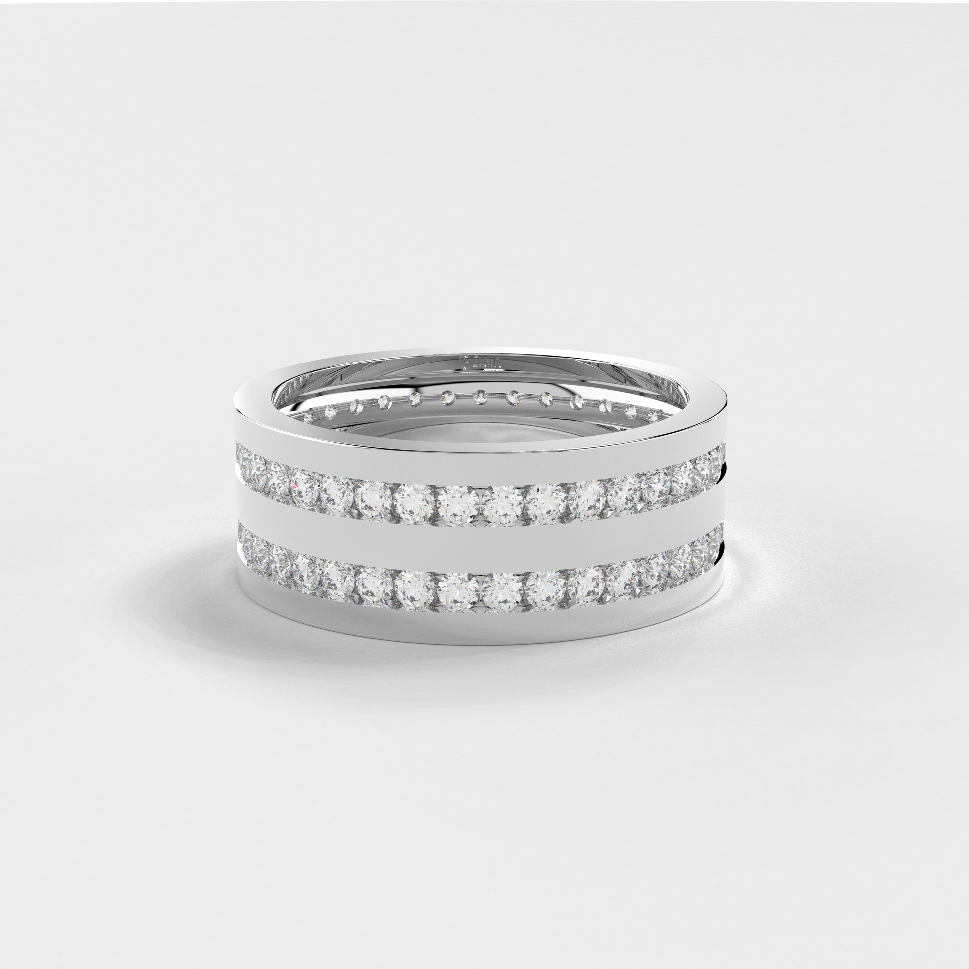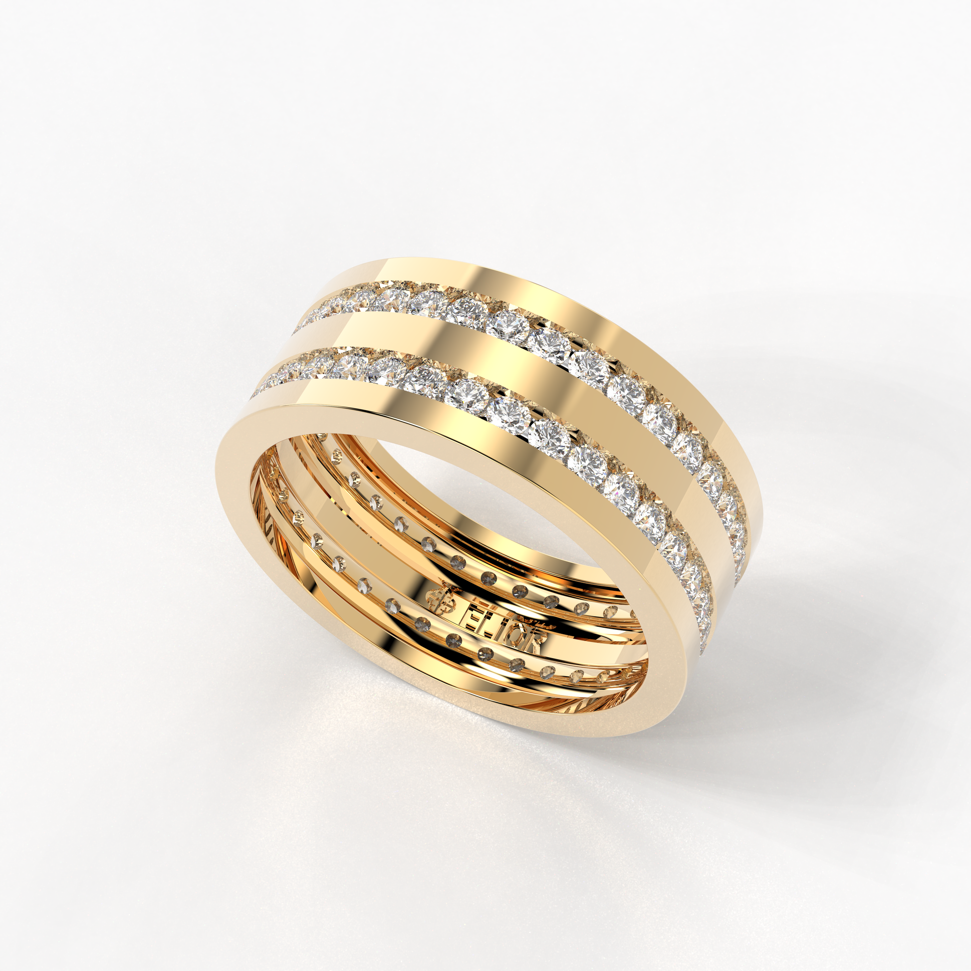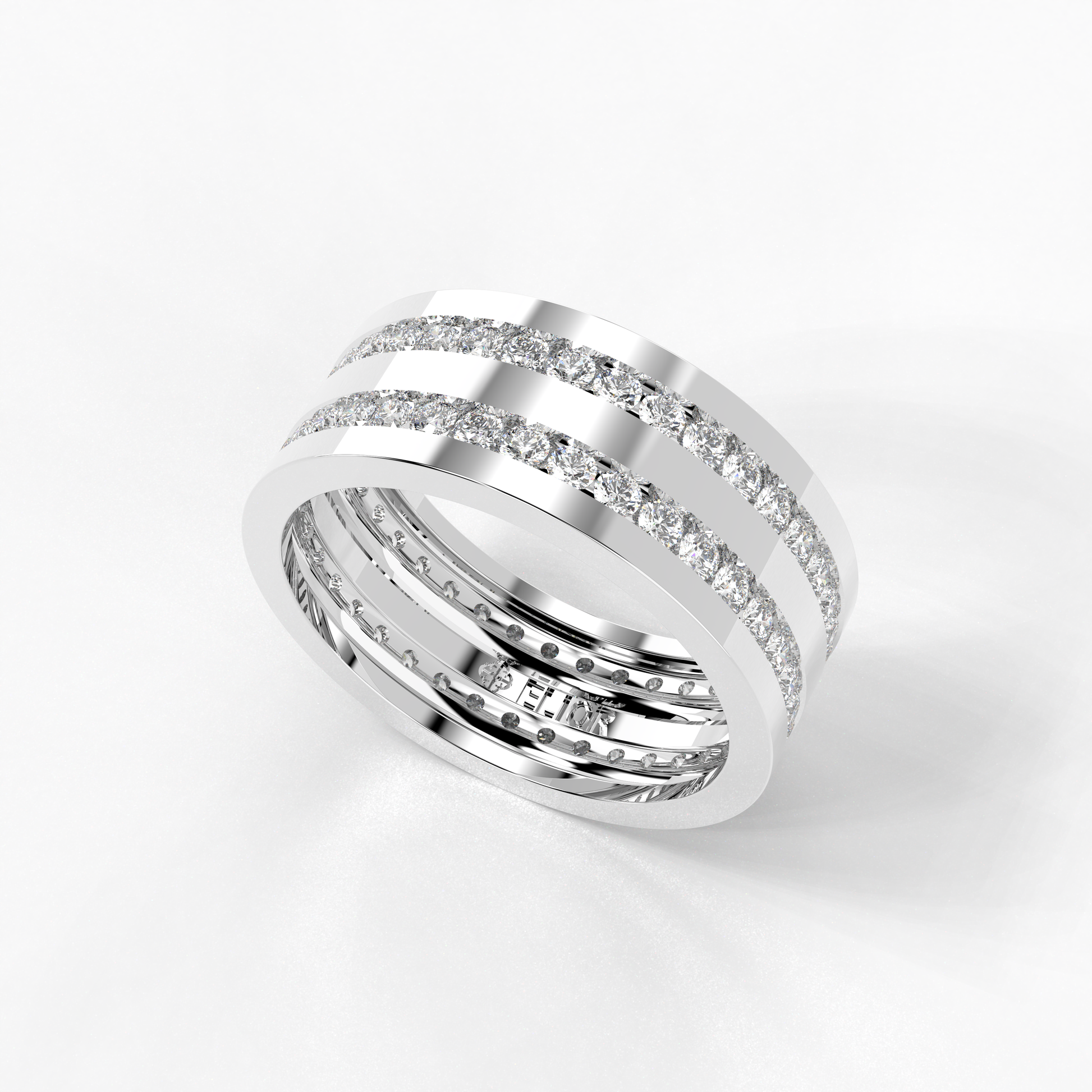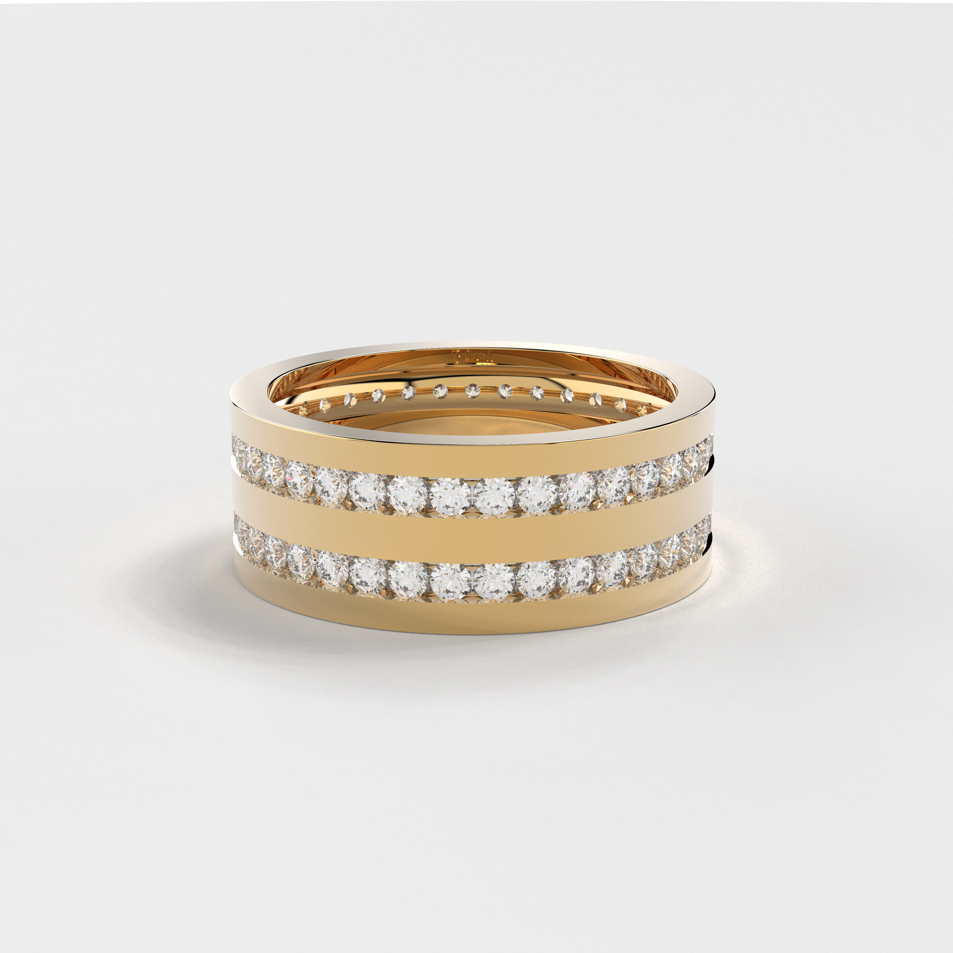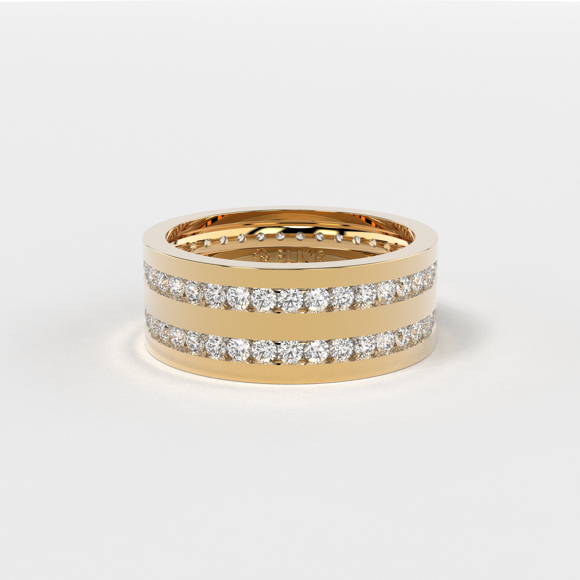 Embrace timeless elegance with the Double Row Brilliance Band, a masterpiece meticulously crafted by Elior Jewel. This striking ring features a bold and sophisticated design, showcasing two rows of dazzling round brilliant-cut diamonds that exude luxury and refinement.The diamonds, totaling 1.85 carats in weight and featuring 74 meticulously set stones,are expertly placed in a channel setting to maximize their brilliance and fire, creating a mesmerizing display of light that will catch the eye from every angle.the ring's band boasts a sleek and substantial silhouette, adding a touch of modern luxury to this classic piece. The smooth, polished surface of the gold complements the diamonds' fiery sparkle, creating a harmonious balance between contemporary design and timeless elegance.Whether worn as a statement piece or a symbol of commitment, the Double Row Brilliance Band is sure to become a cherished addition to any man's jewelry collection. Its versatile design and exquisite craftsmanship make it a perfect choice for the modern gentleman who appreciates both style and substance.