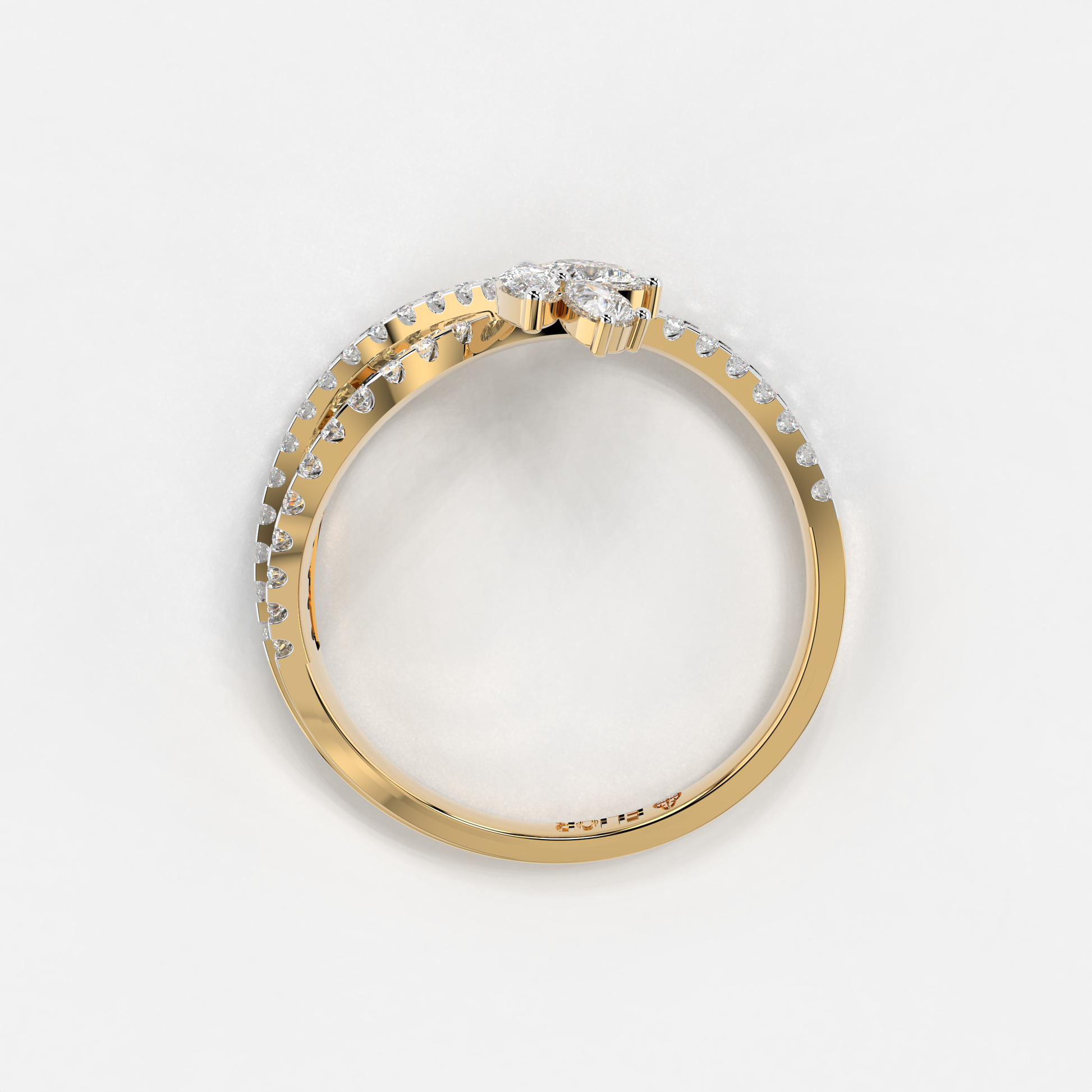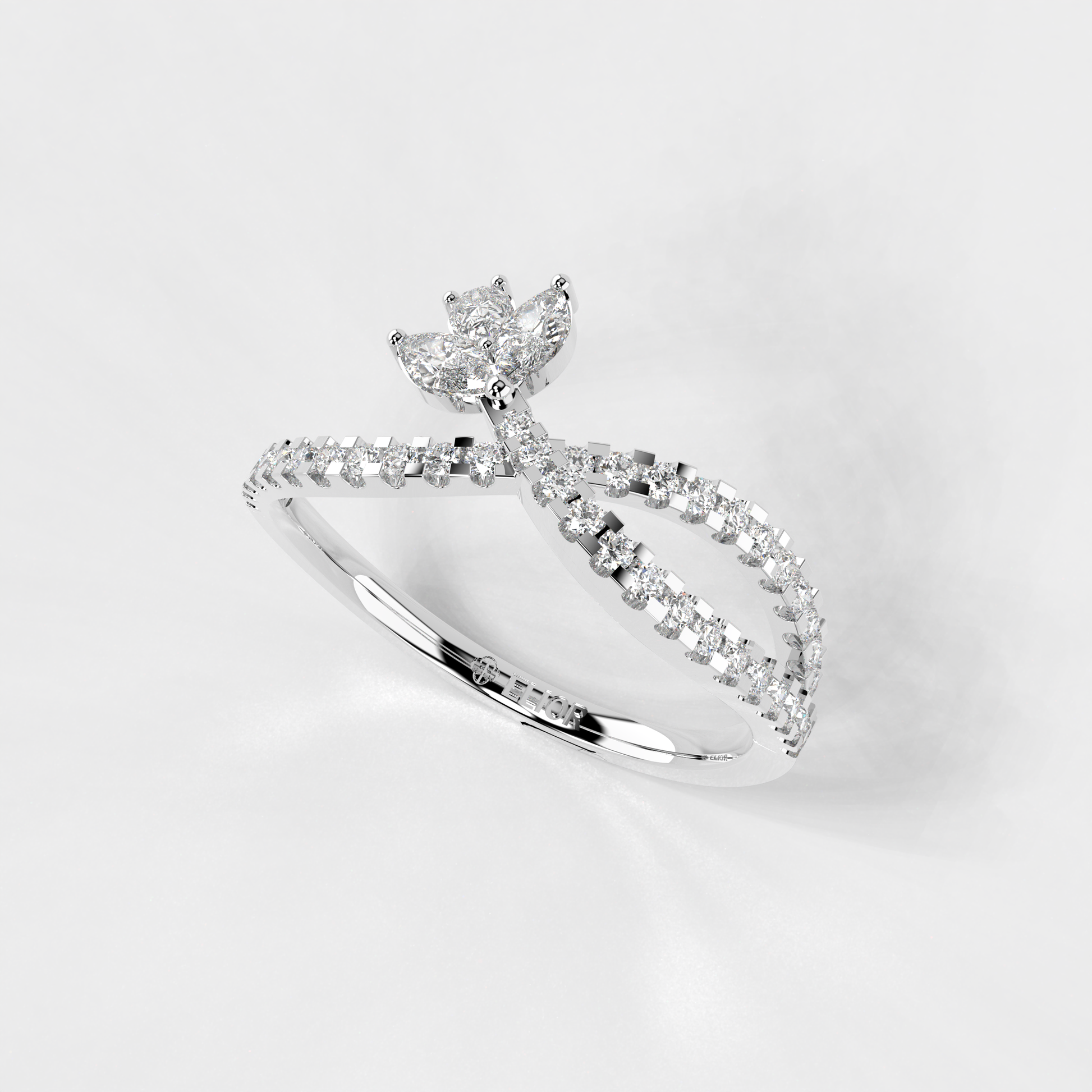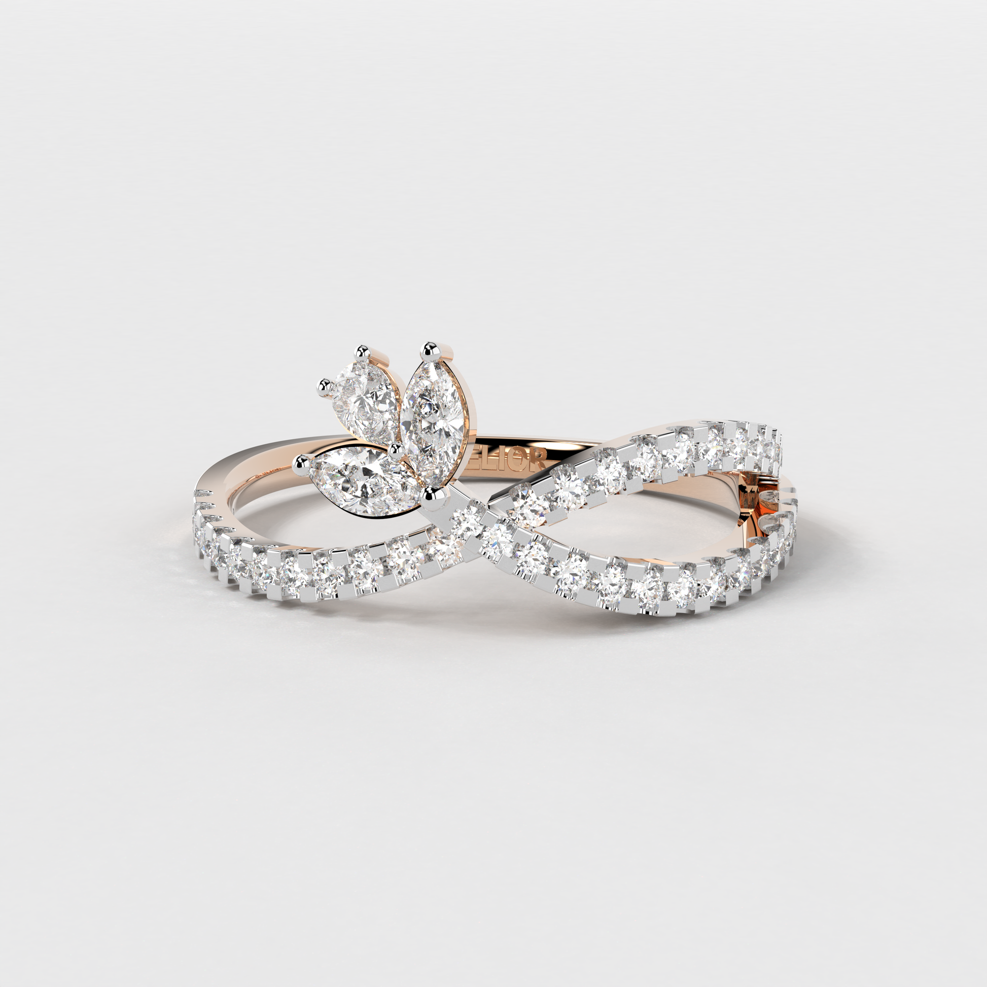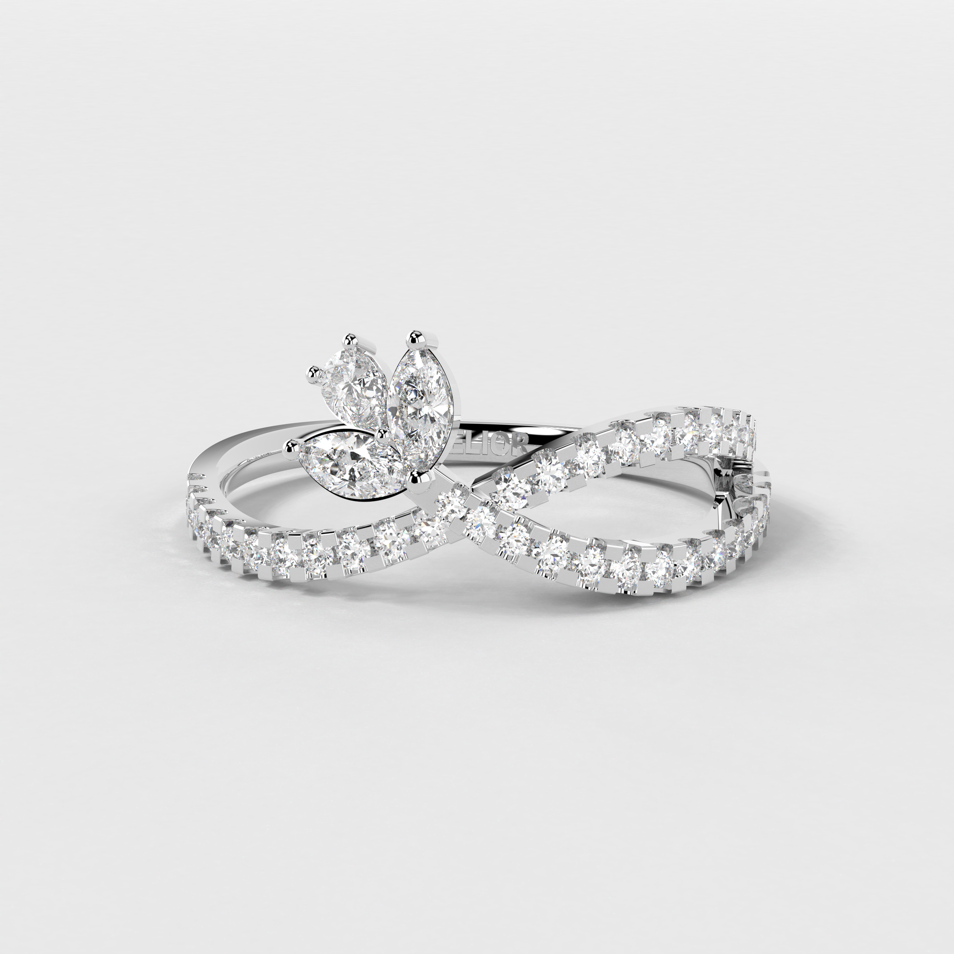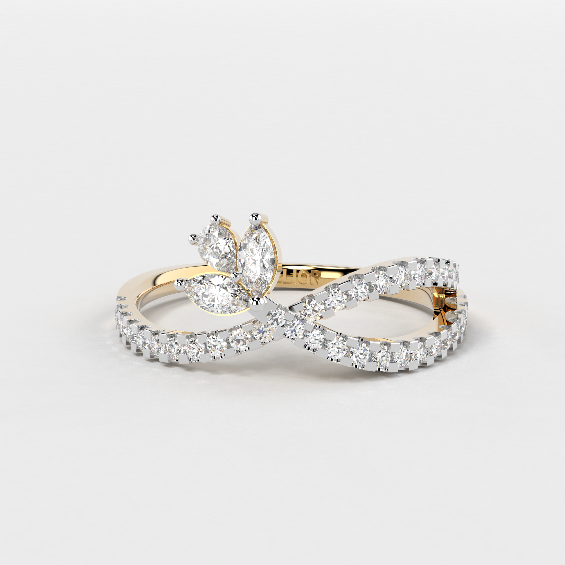 Introducing the 'Crossover Sparkle Ring' by Elior Jewel, a testament to innovative design and fine craftsmanship. This captivating ring features a unique crossover band adorned with a scintillating sequence of round-cut diamonds totaling 0.28 carats approximately. The band leads up to two marquise diamonds and a charming pear-shaped diamond at its center, weighing 0.16 carats, creating a mesmerizing focal point. This ring is a seamless blend of modern style and classic elegance, perfect for those who seek a standout piece to add to their collection. Whether it's an engagement, an anniversary, or just to add a touch of sparkle to your daily wear, the 'Crossover Sparkle Ring' is sure to shine.