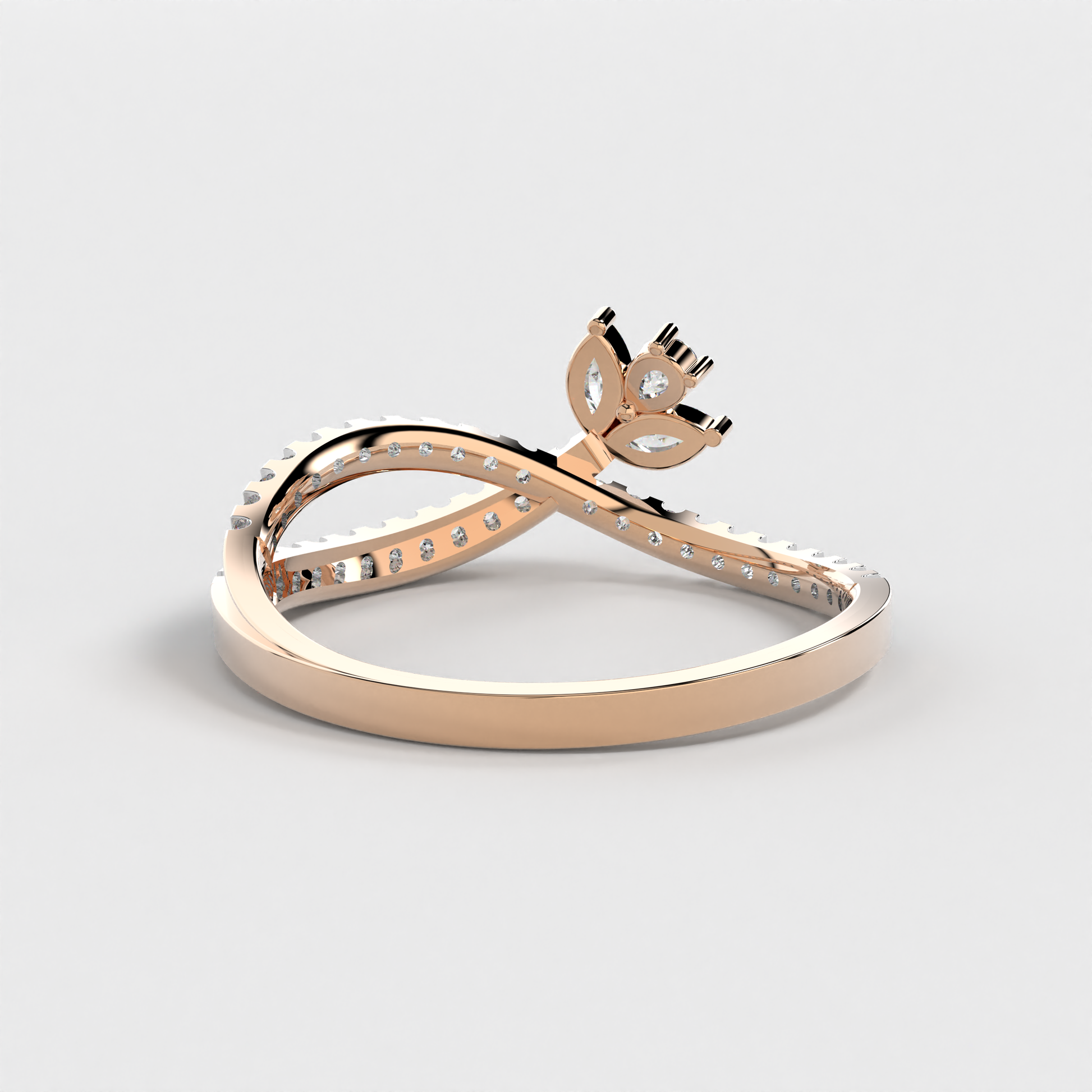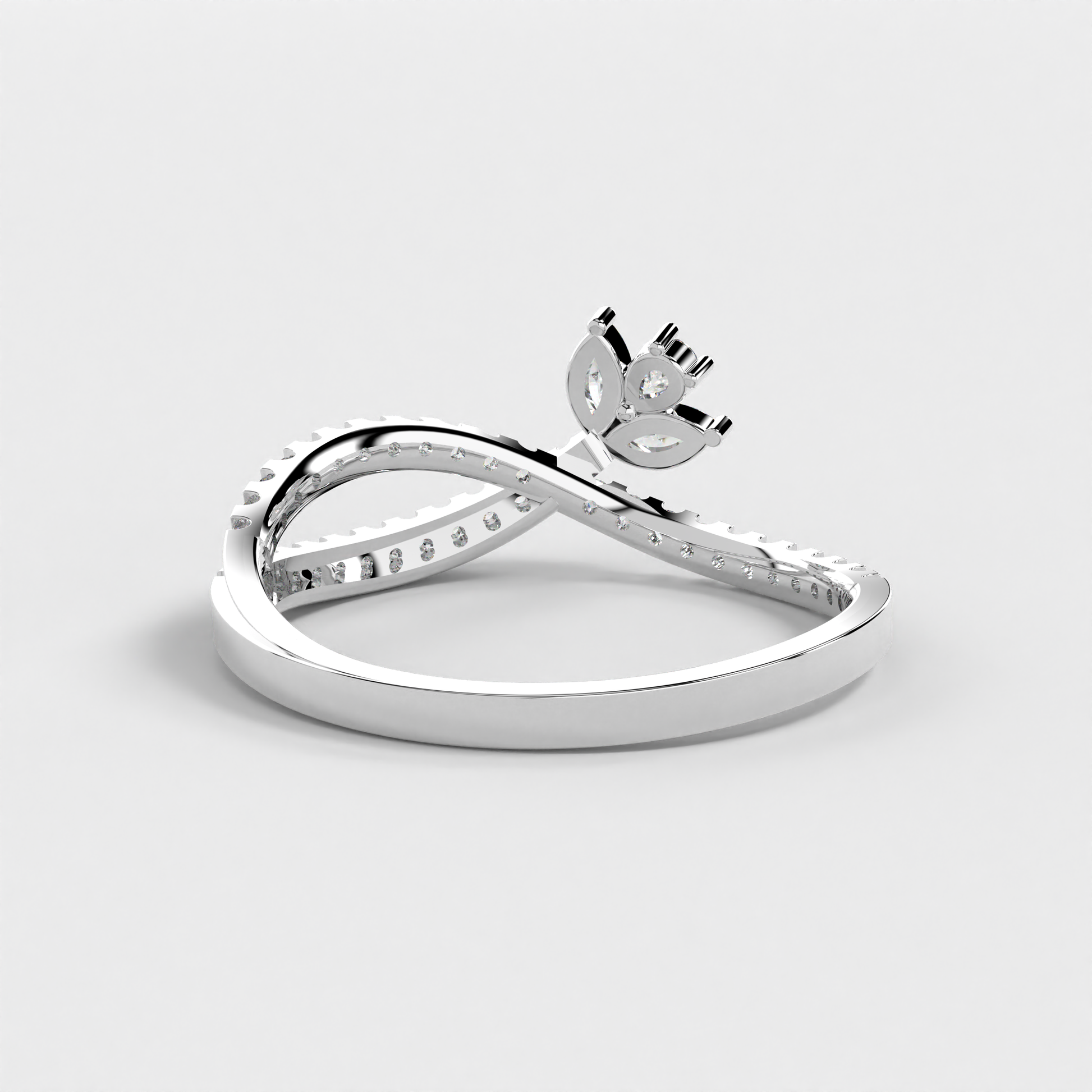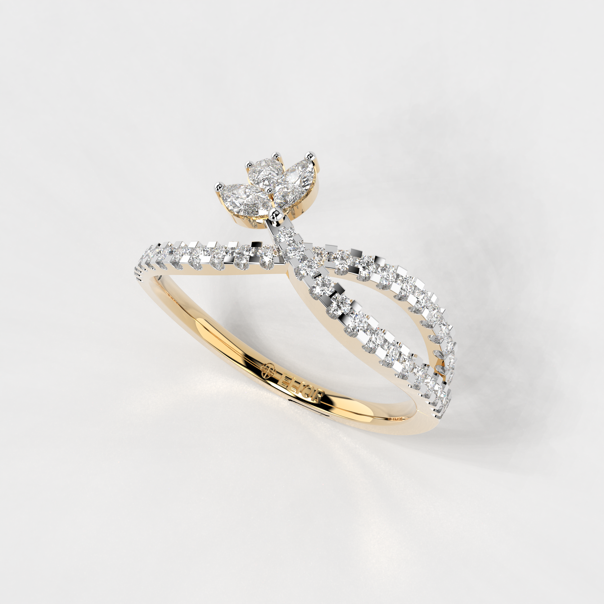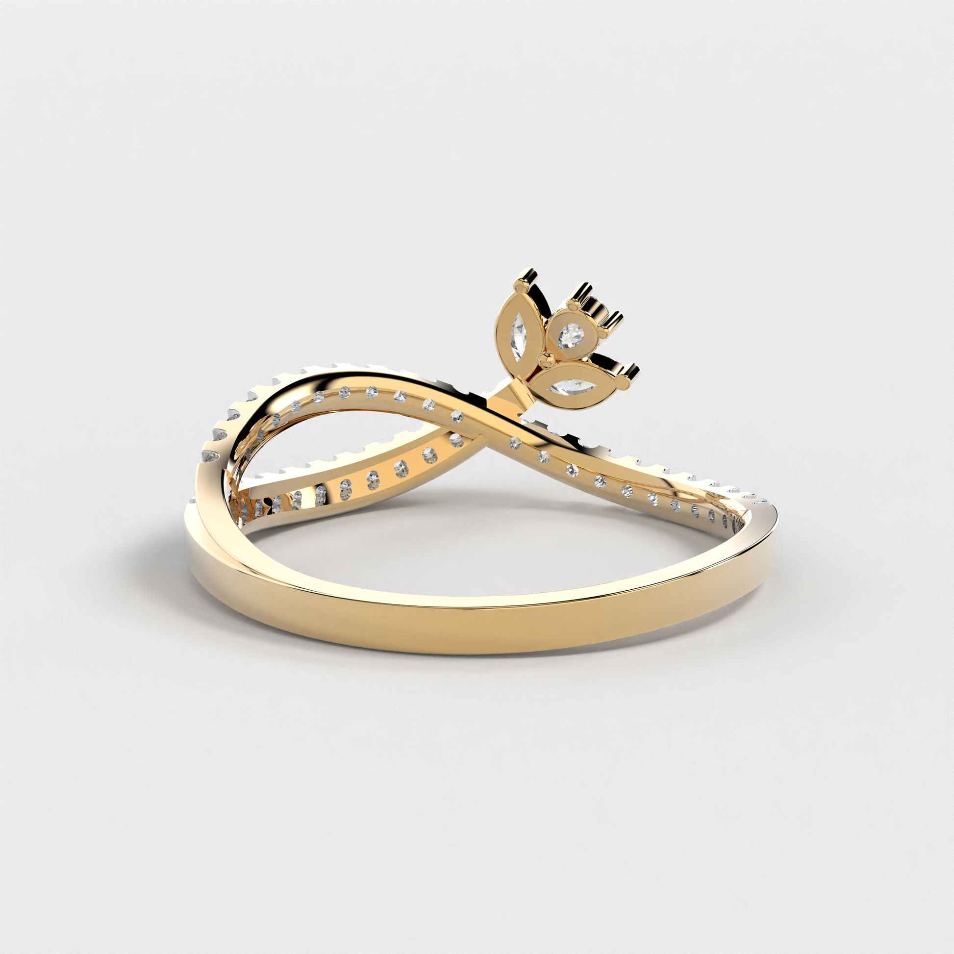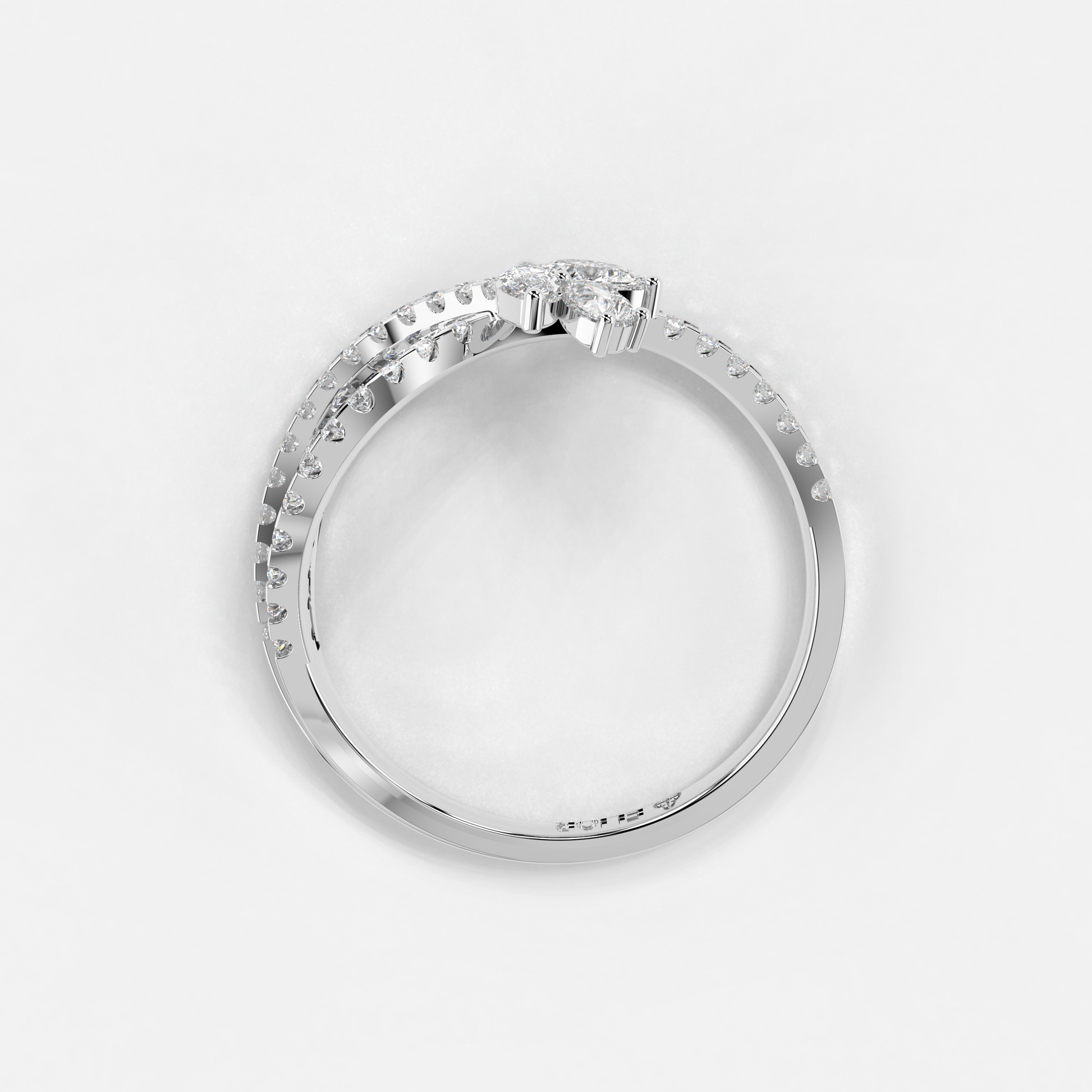 Introducing the 'Crossover Sparkle Ring' by Elior Jewel, a testament to innovative design and fine craftsmanship. This captivating ring features a unique crossover band adorned with a scintillating sequence of round-cut diamonds totaling 0.28 carats approximately. The band leads up to two marquise diamonds and a charming pear-shaped diamond at its center, weighing 0.16 carats, creating a mesmerizing focal point. This ring is a seamless blend of modern style and classic elegance, perfect for those who seek a standout piece to add to their collection. Whether it's an engagement, an anniversary, or just to add a touch of sparkle to your daily wear, the 'Crossover Sparkle Ring' is sure to shine.