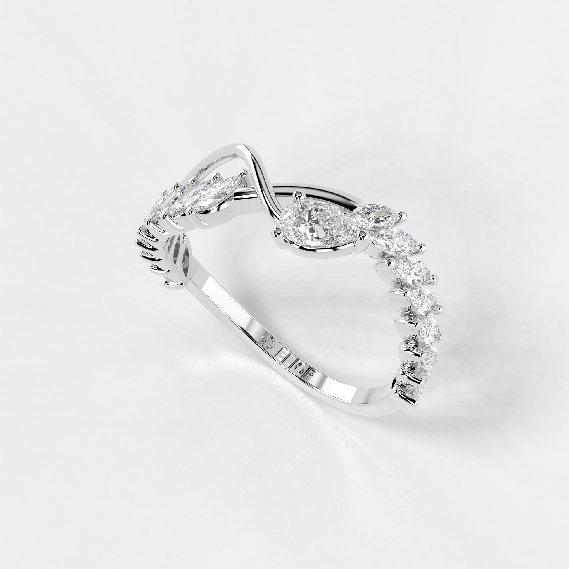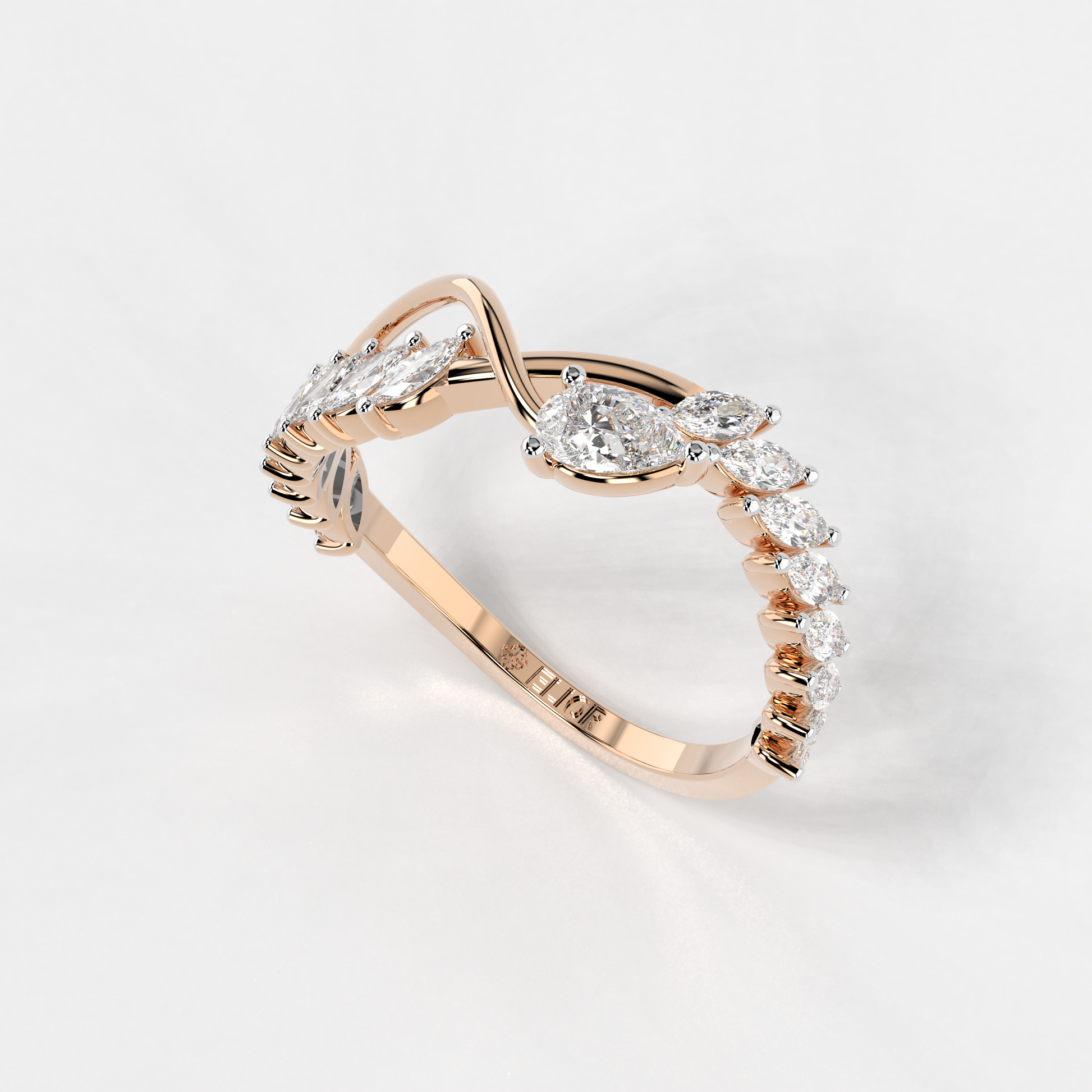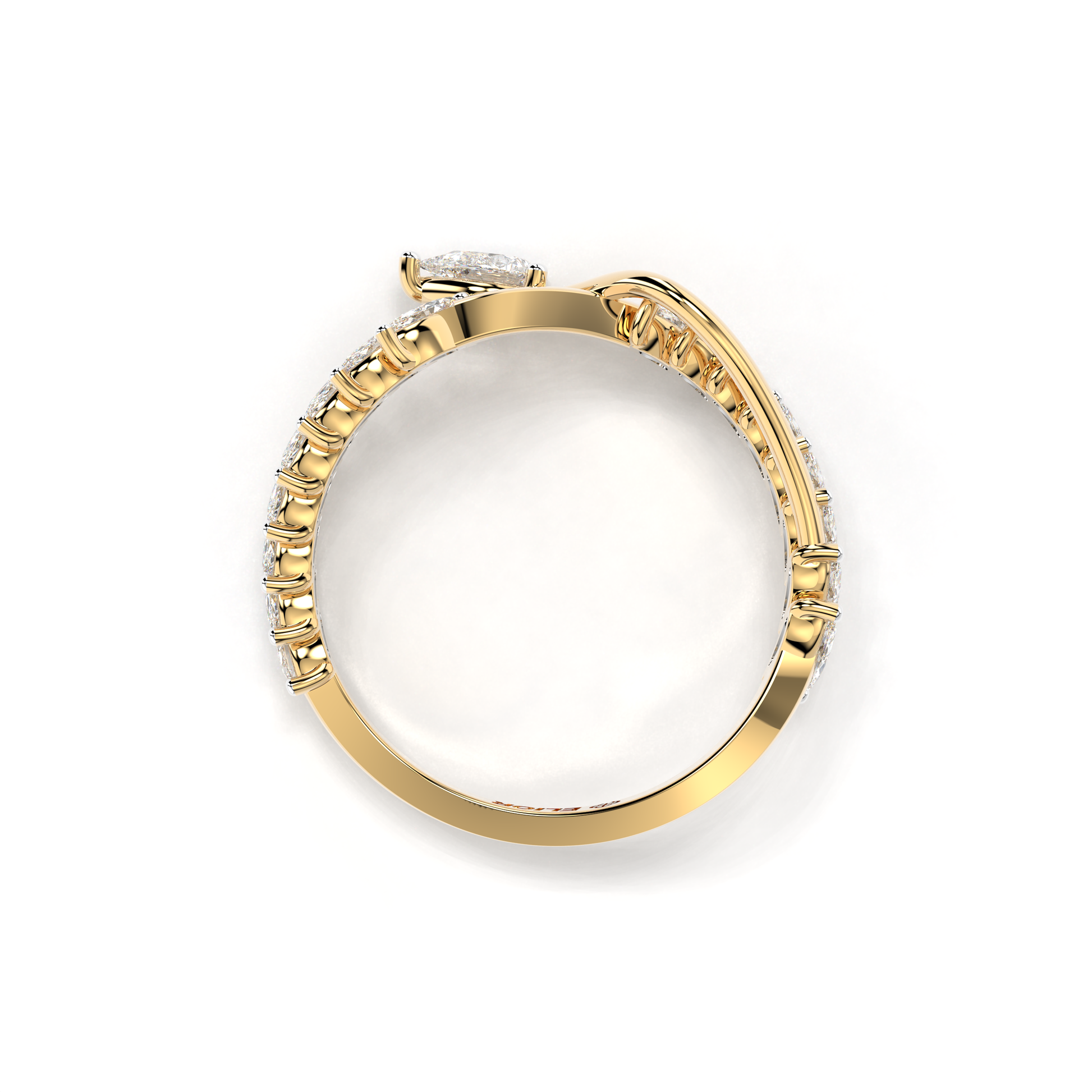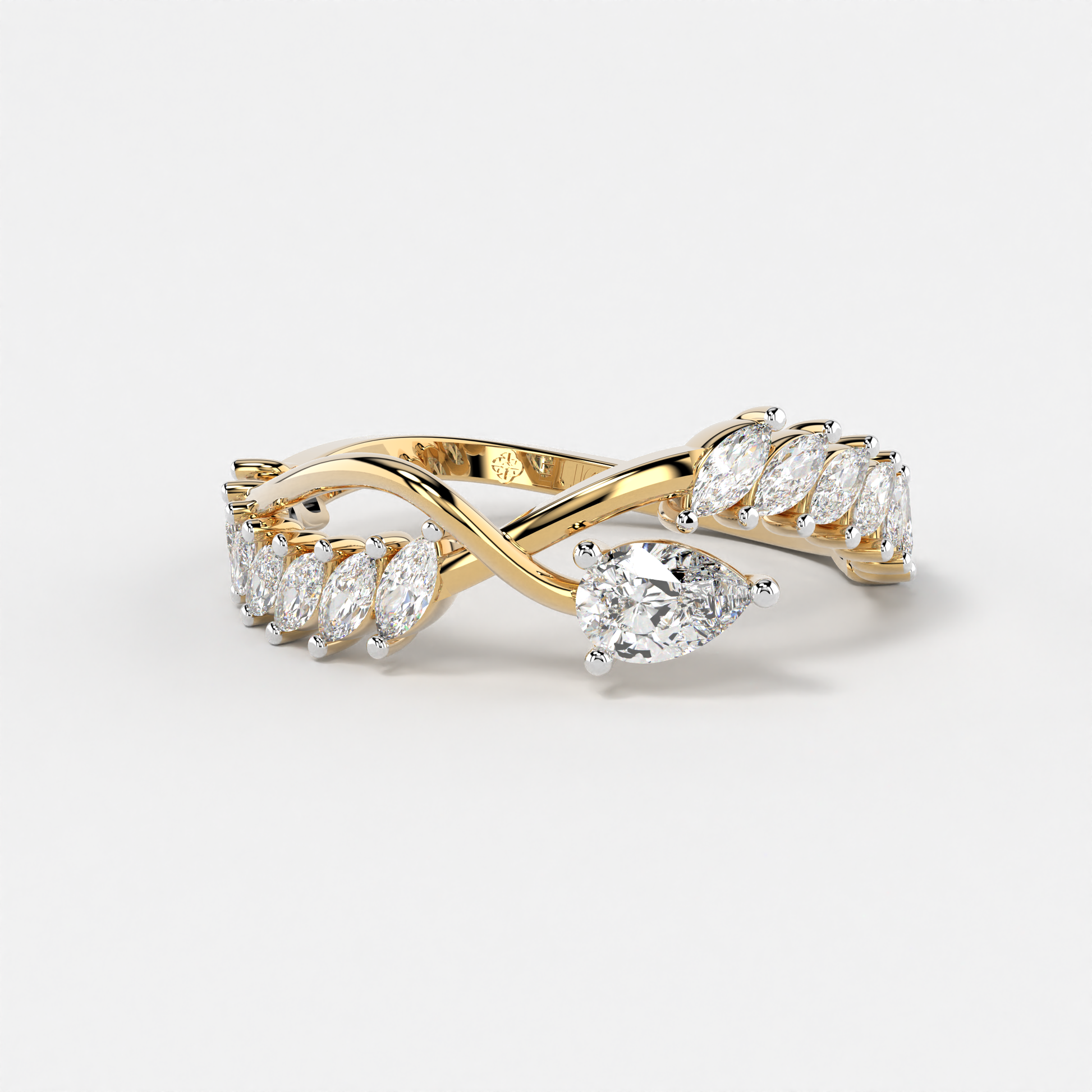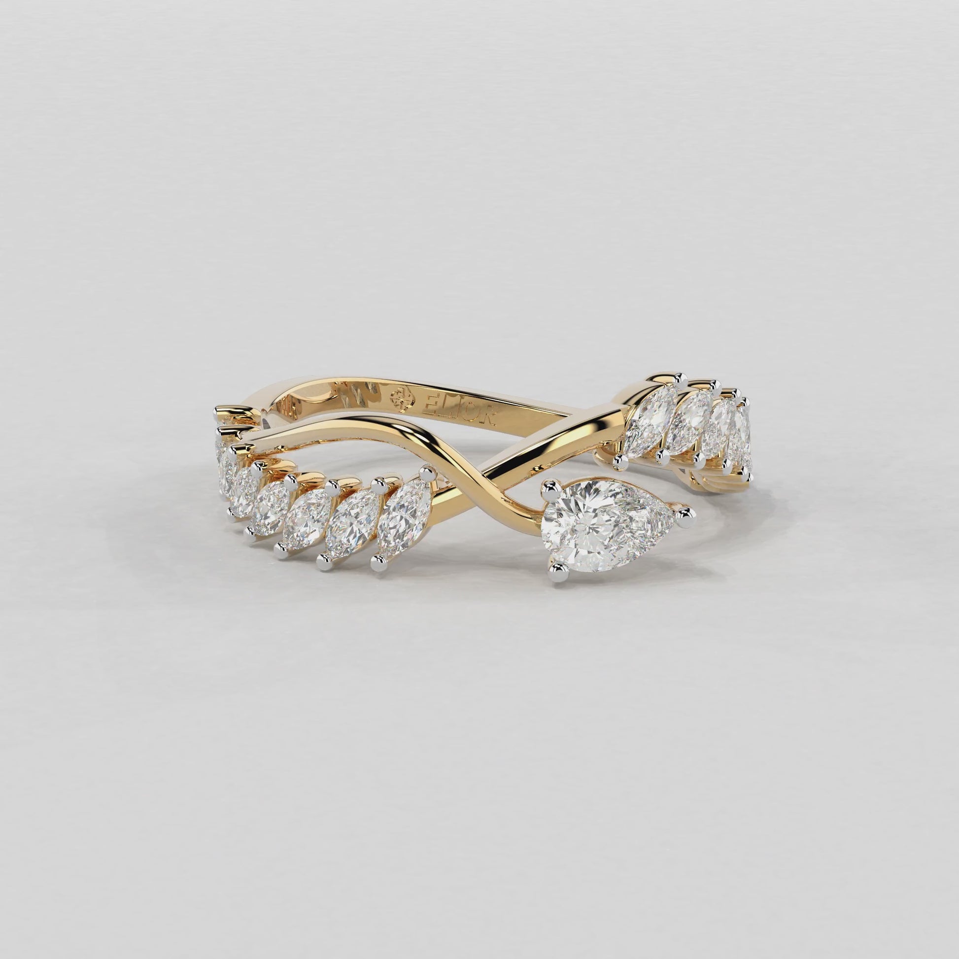 Presenting the 'Pearlescent Marquise Ring' from Elior Jewel, a creation where artistry meets luxury. This ring is a celebration of craftsmanship, featuring a graceful curve adorned with 16 marquise-cut diamonds, totaling 0.47 carats, which lead to a stunning pear-shaped centerpiece of 0.20 carats approximately. The diamonds are meticulously arranged to capture and reflect light from every angle. This ring, combines the warmth of gold with the fire of diamonds to create a piece that's not just a ring, but a statement. The 'Pearlescent Marquise Splendor Ring' is an epitome of refined elegance, designed to add a touch of brilliance to any occasion.
