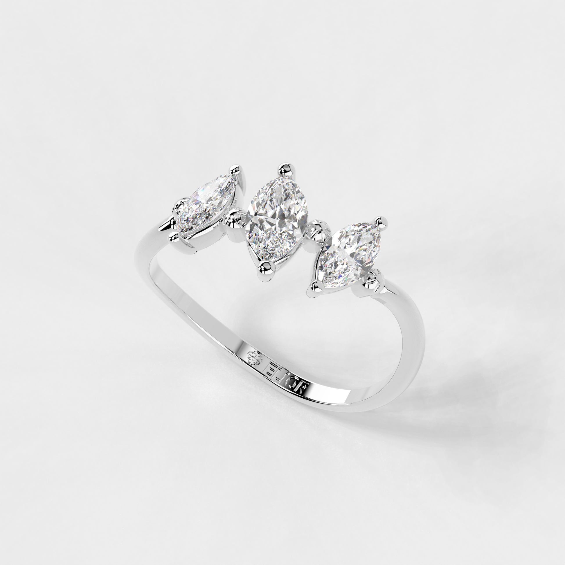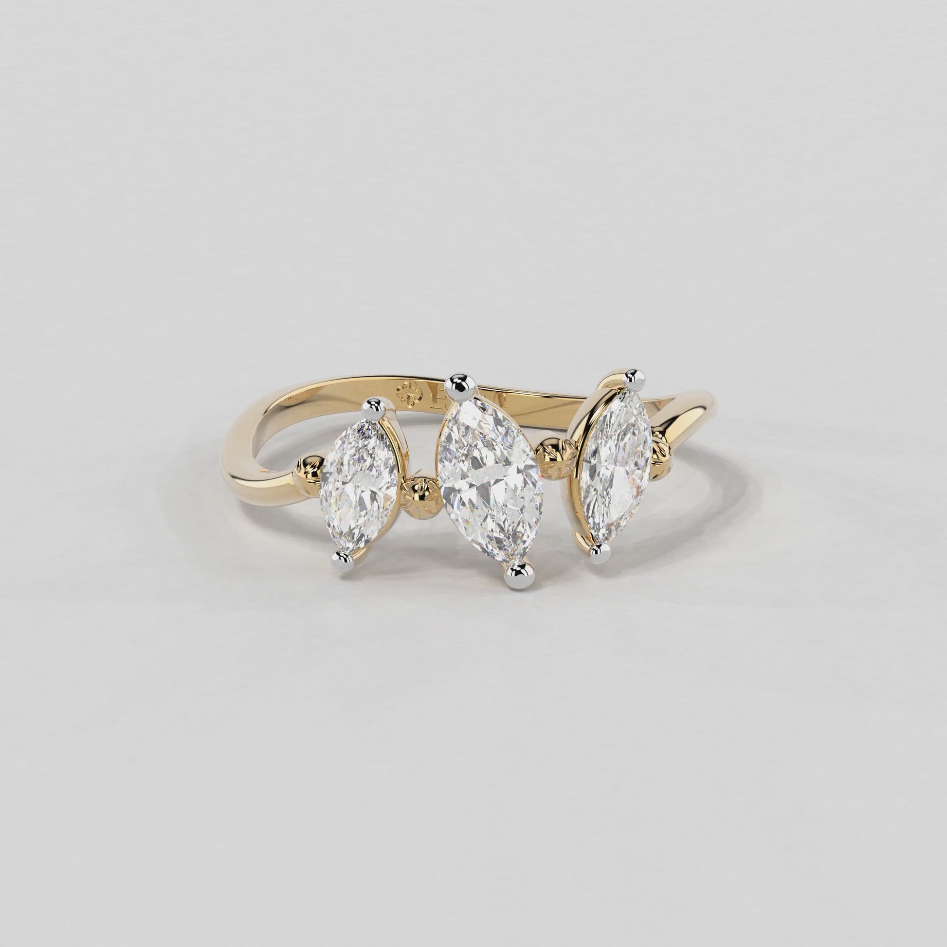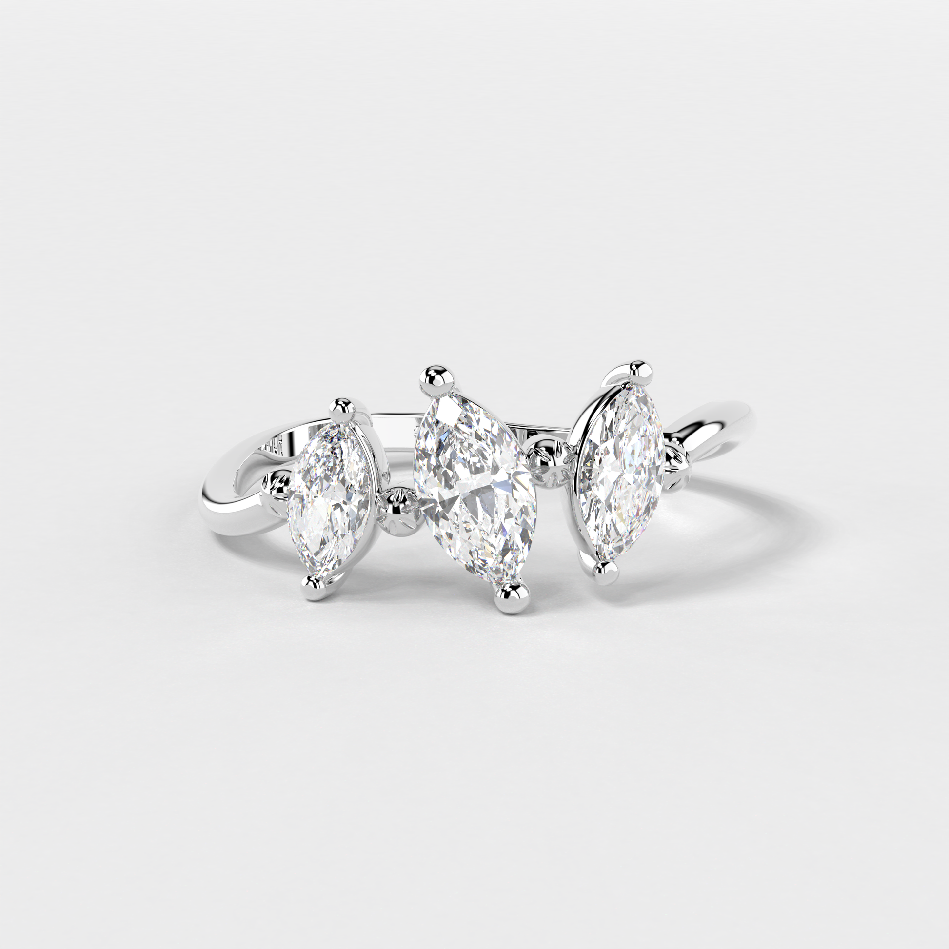 Introducing the 'Marquise Whisper Trio Ring' - a symphony of sophistication. This ring boasts an exquisite trio of marquise-cut diamonds, carefully selected to complement each other in size and brilliance. The centerpiece is a splendid diamond, accompanied by two slightly smaller side stones, culminating in a total diamond weight of 0.60 carats approximately. This creation is for those who seek elegance with a modern touch. Whether it's an engagement, anniversary, or a treat to self, the 'Marquise Whisper Trio Ring' promises to be a whispering statement of timeless luxury.