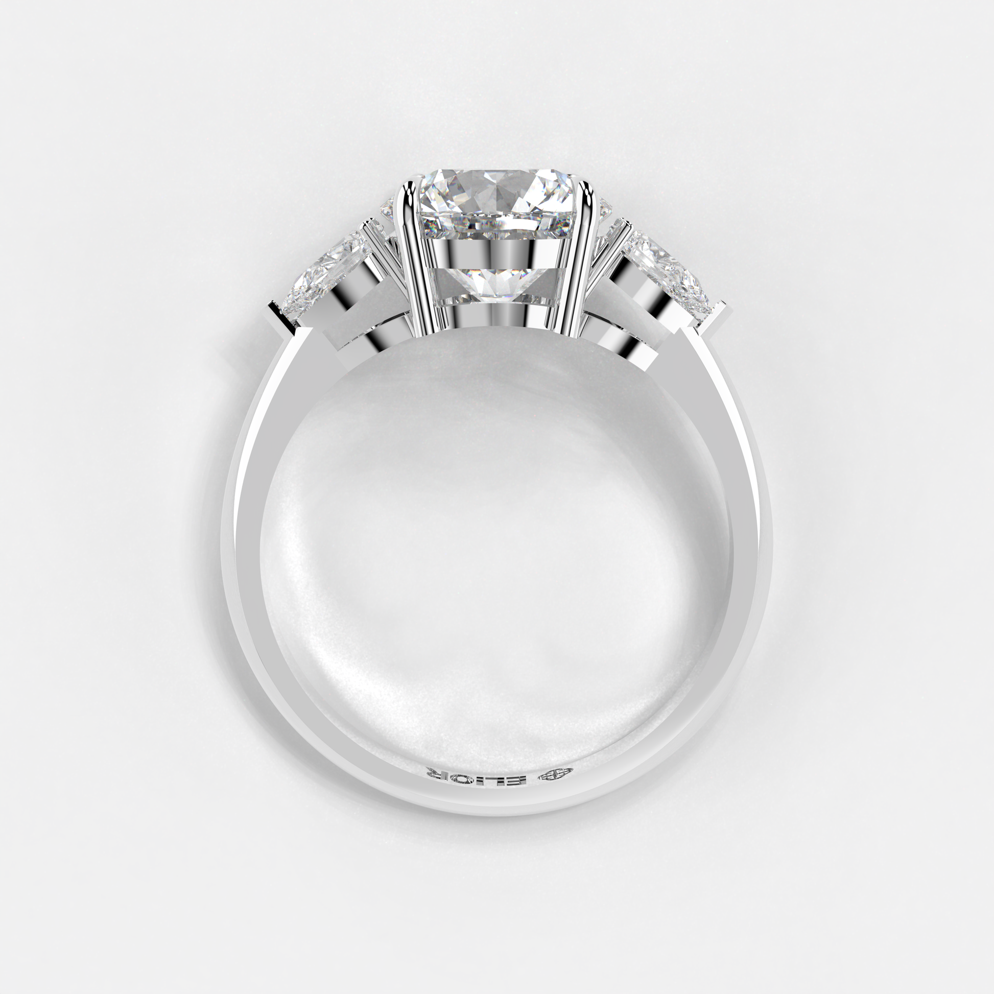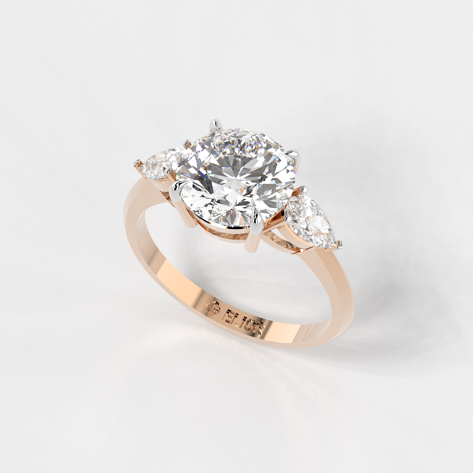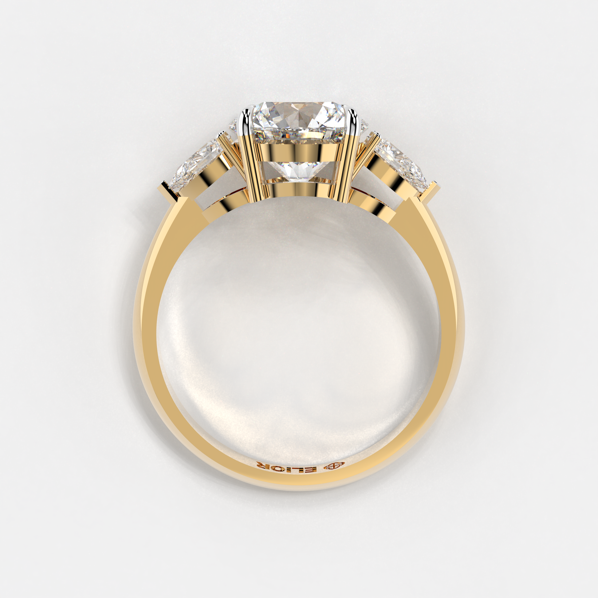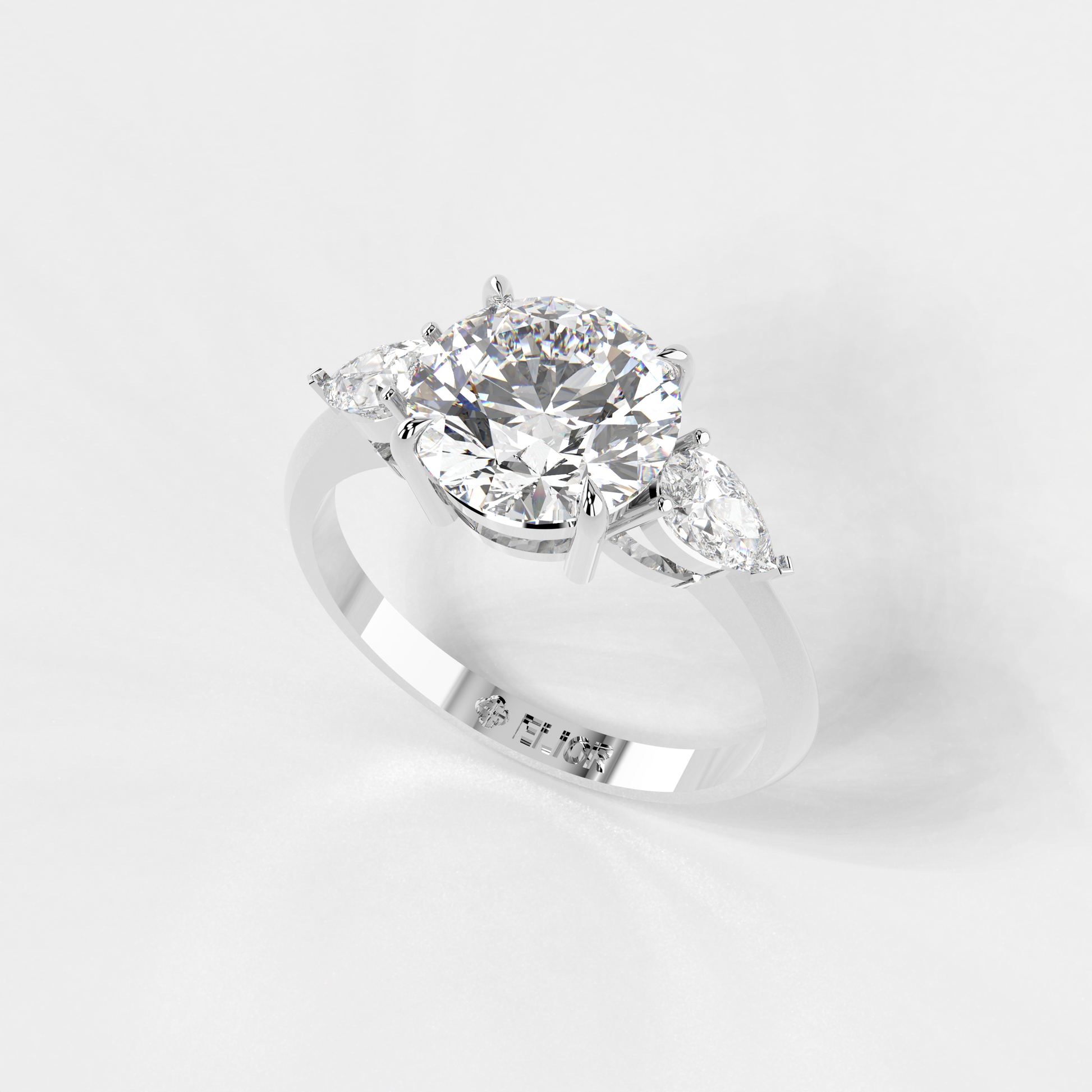 Celebrate the past, present, and future of your love story with the Trinity of Love Ring, a masterpiece meticulously crafted by Elior Jewel. This breathtaking ring showcases a magnificent round brilliant-cut diamond as its centerpiece, radiating an aura of sophistication and timeless beauty. The center diamond, measuring an impressive 8.20mm and weighing 2.00 carats, commands attention with its exceptional brilliance and fire.Flanking this dazzling centerpiece are two gracefully tapered pear-shaped diamonds, each measuring 5.00mm x 3.00mm and weighing 0.33 carats. These pear-shaped diamonds, symbolizing tears of joy and the enduring nature of love, add a touch of elegance and movement to the design. The three stones together represent the past, present, and future of your relationship, a beautiful reminder of your journey together.this ring is a testament to the enduring beauty of diamonds and the artistry of Elior Jewel. Whether symbolizing a promise of forever, celebrating a milestone anniversary, or simply expressing your deep affection, the Trinity of Love Ring is sure to become a cherished heirloom for generations to come.