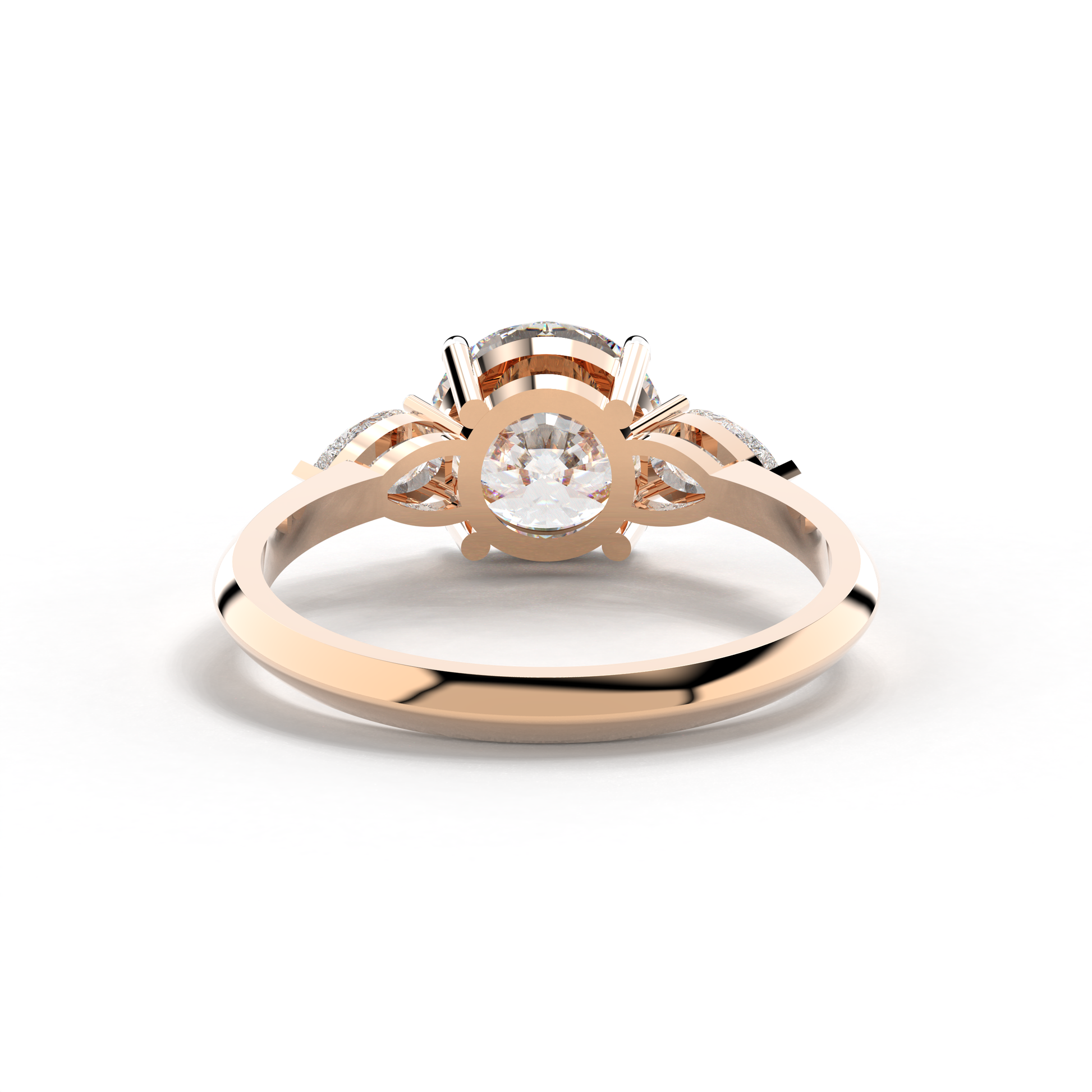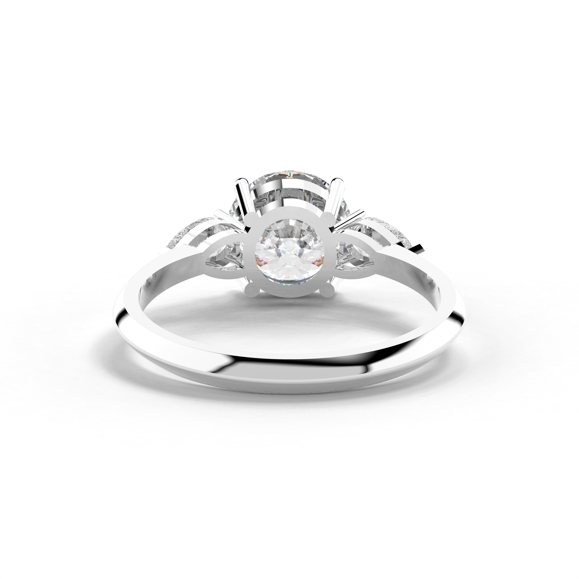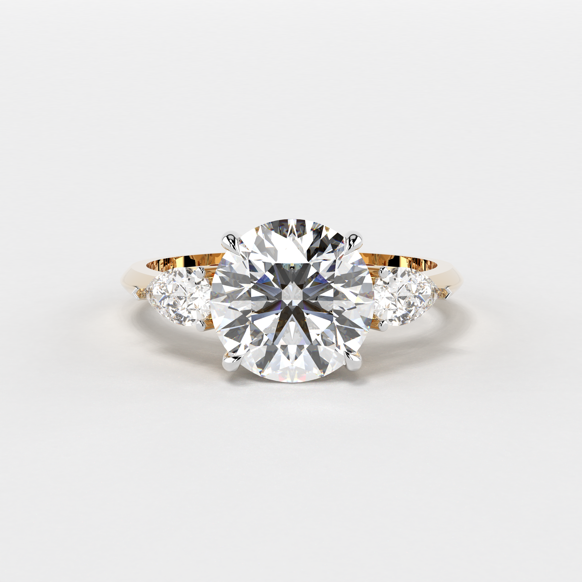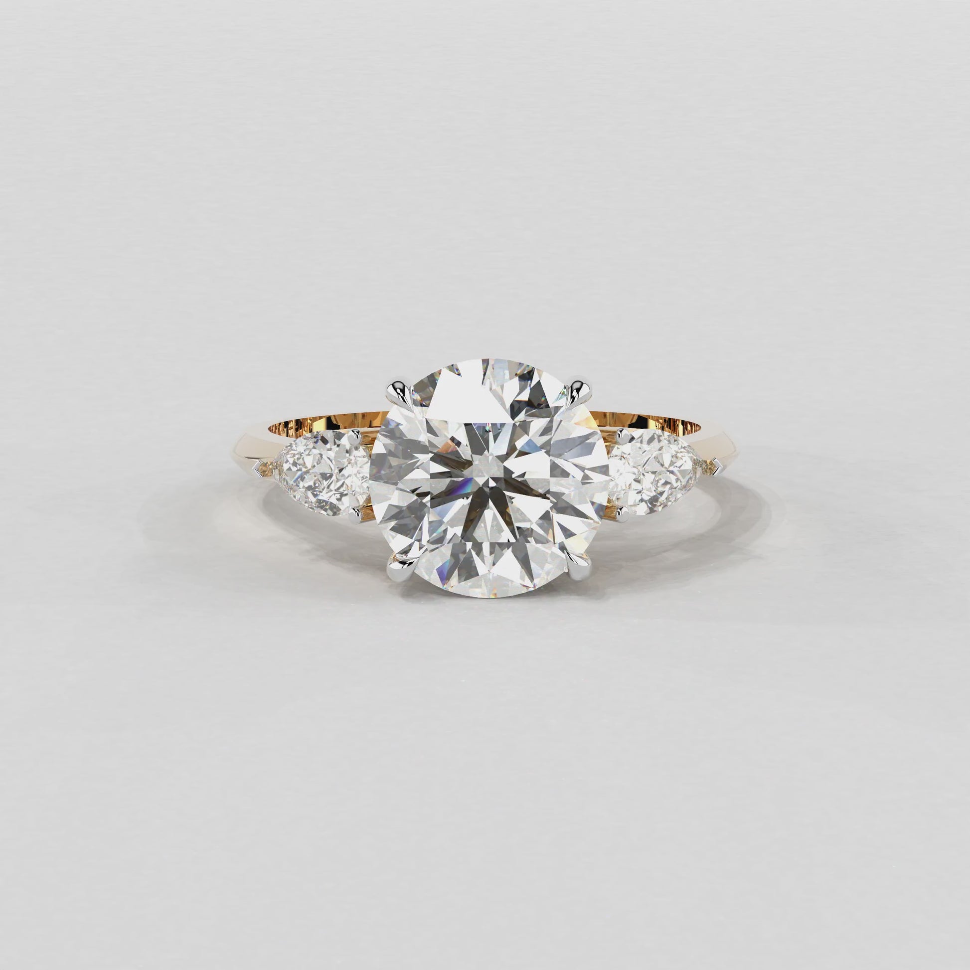 Celebrate the past, present, and future of your love story with the Trinity of Love Ring, a masterpiece meticulously crafted by Elior Jewel. This breathtaking ring showcases a magnificent round brilliant-cut diamond as its centerpiece, radiating an aura of sophistication and timeless beauty. The center diamond, measuring an impressive 8.20mm and weighing 2.00 carats, commands attention with its exceptional brilliance and fire.Flanking this dazzling centerpiece are two gracefully tapered pear-shaped diamonds, each measuring 5.00mm x 3.00mm and weighing 0.33 carats. These pear-shaped diamonds, symbolizing tears of joy and the enduring nature of love, add a touch of elegance and movement to the design. The three stones together represent the past, present, and future of your relationship, a beautiful reminder of your journey together.this ring is a testament to the enduring beauty of diamonds and the artistry of Elior Jewel. Whether symbolizing a promise of forever, celebrating a milestone anniversary, or simply expressing your deep affection, the Trinity of Love Ring is sure to become a cherished heirloom for generations to come.