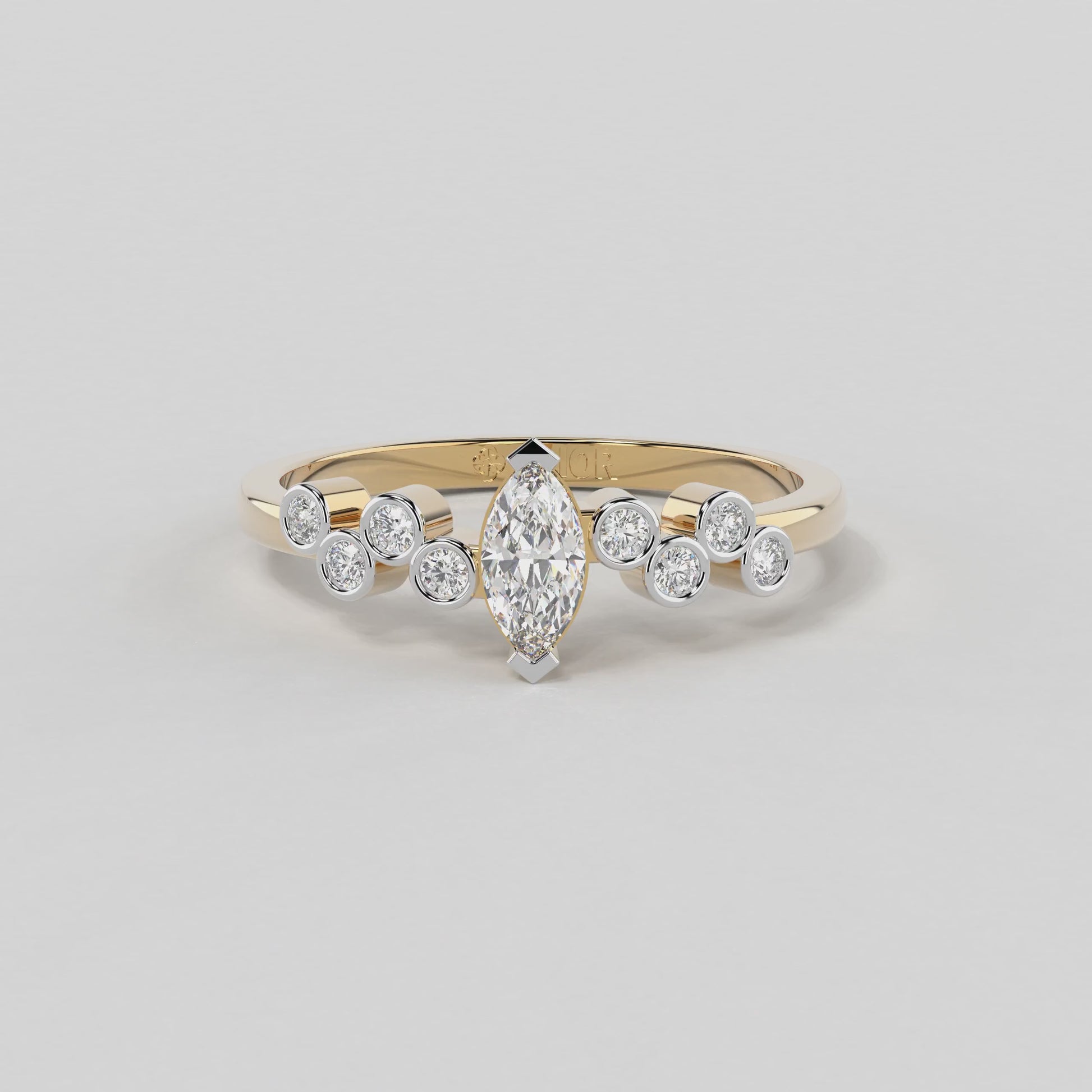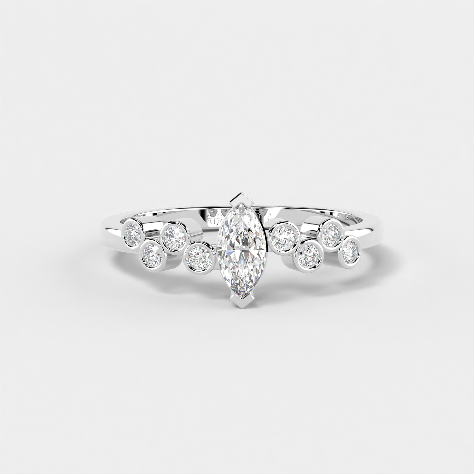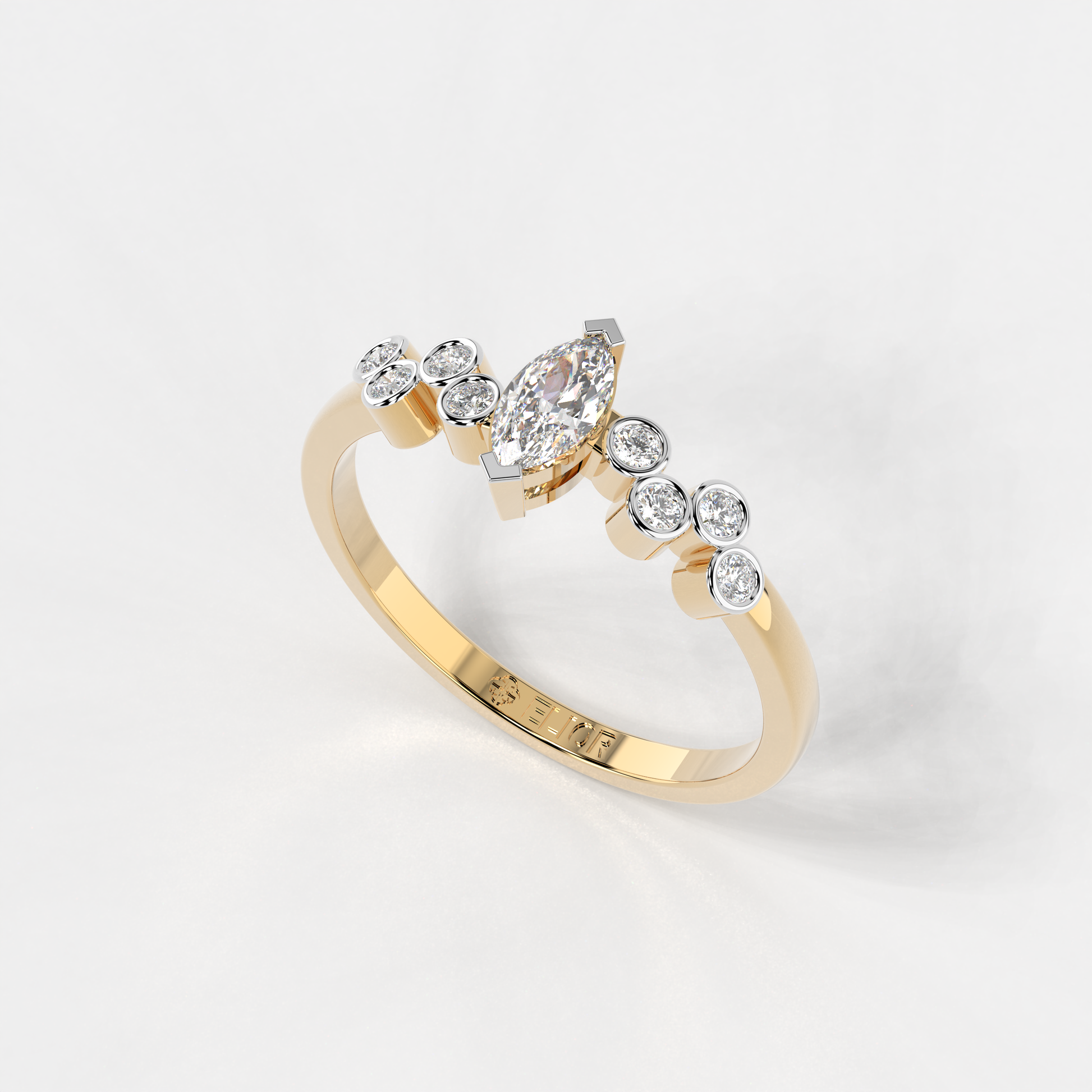 Introducing the 'Nova Marquise Ring' by Elior Jewel, a sleek embodiment of modern sophistication. This design highlights a striking marquise diamond, exquisitely framed by eight round-cut diamonds that echo the celestial sparkle of a nova. The total diamond weight of 0.28 carats approximately is meticulously set to catch the light at every turn, ensuring that the ring dazzles with a stellar radiance. The 'Nova Marquise Ring' is the perfect accessory for those who wish to add a touch of cosmic elegance to their everyday style or special occasions.