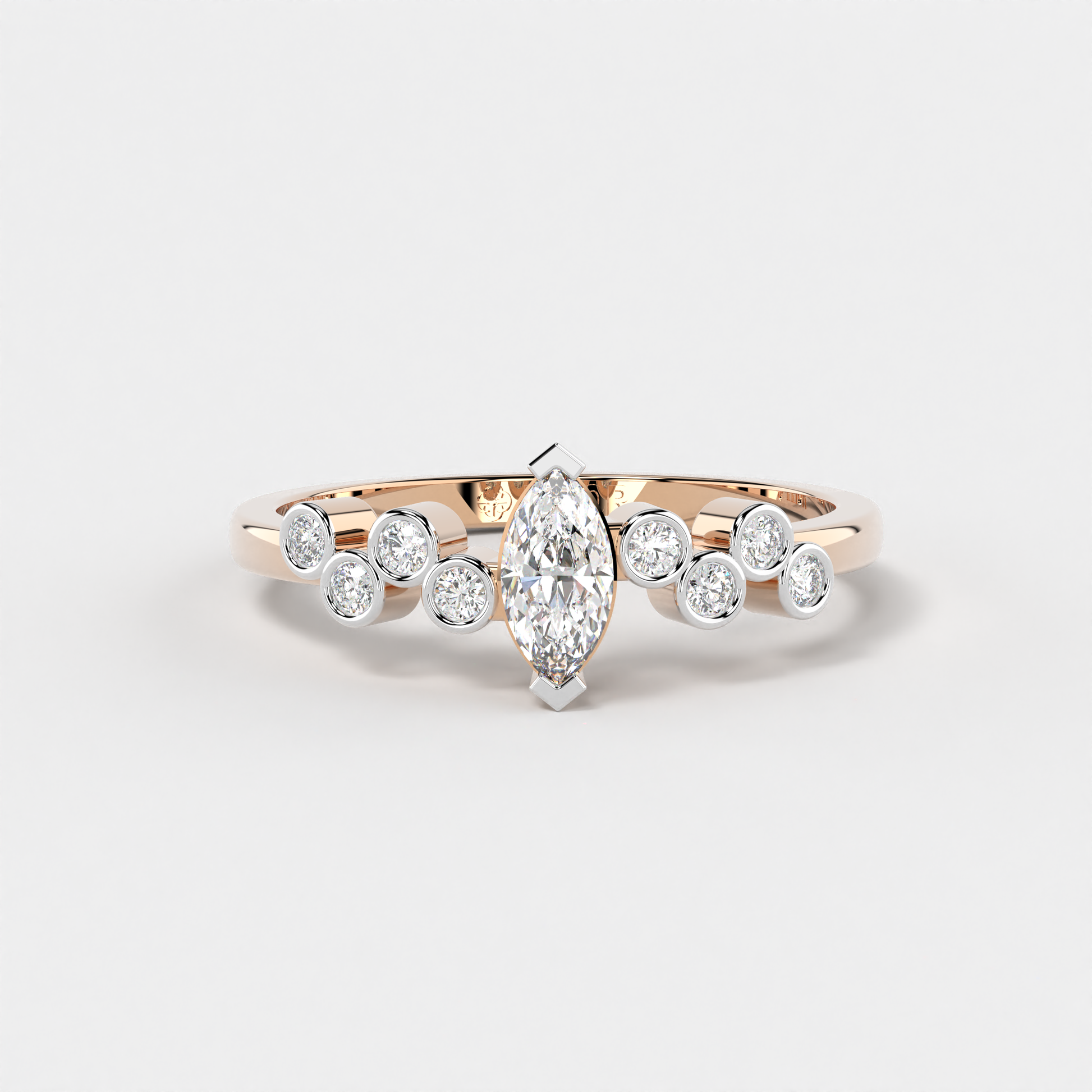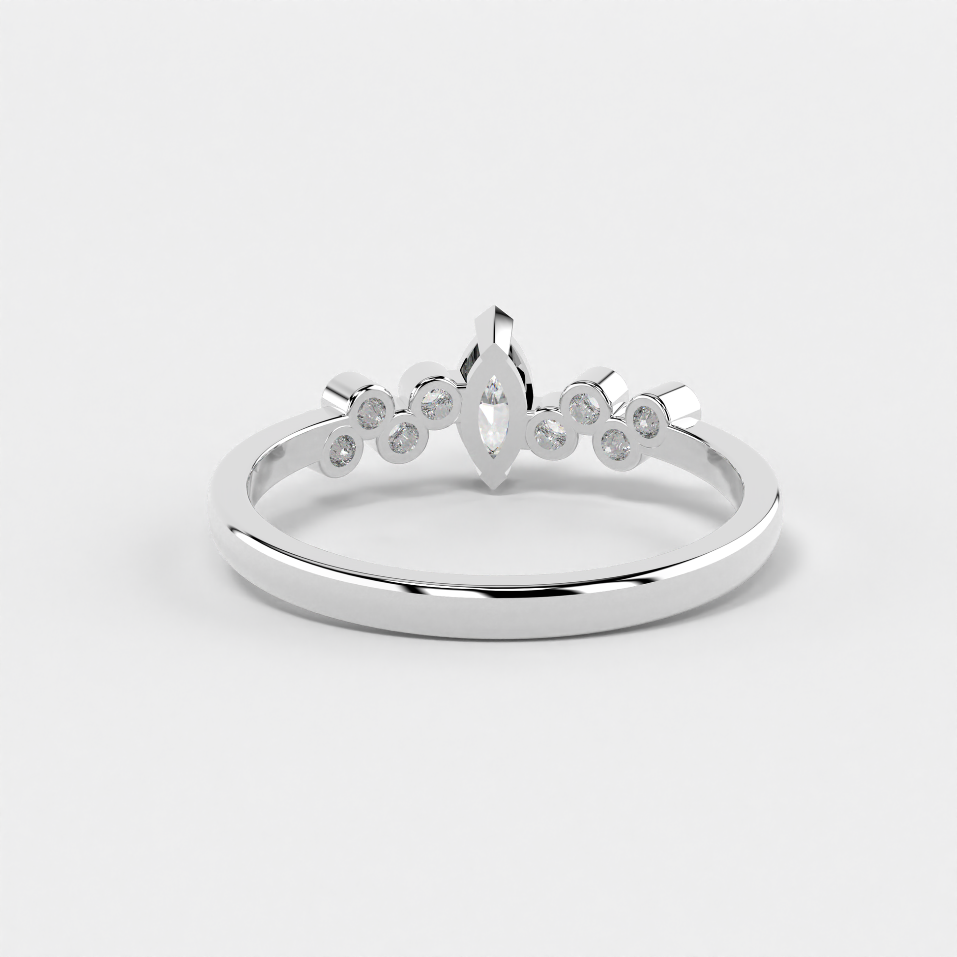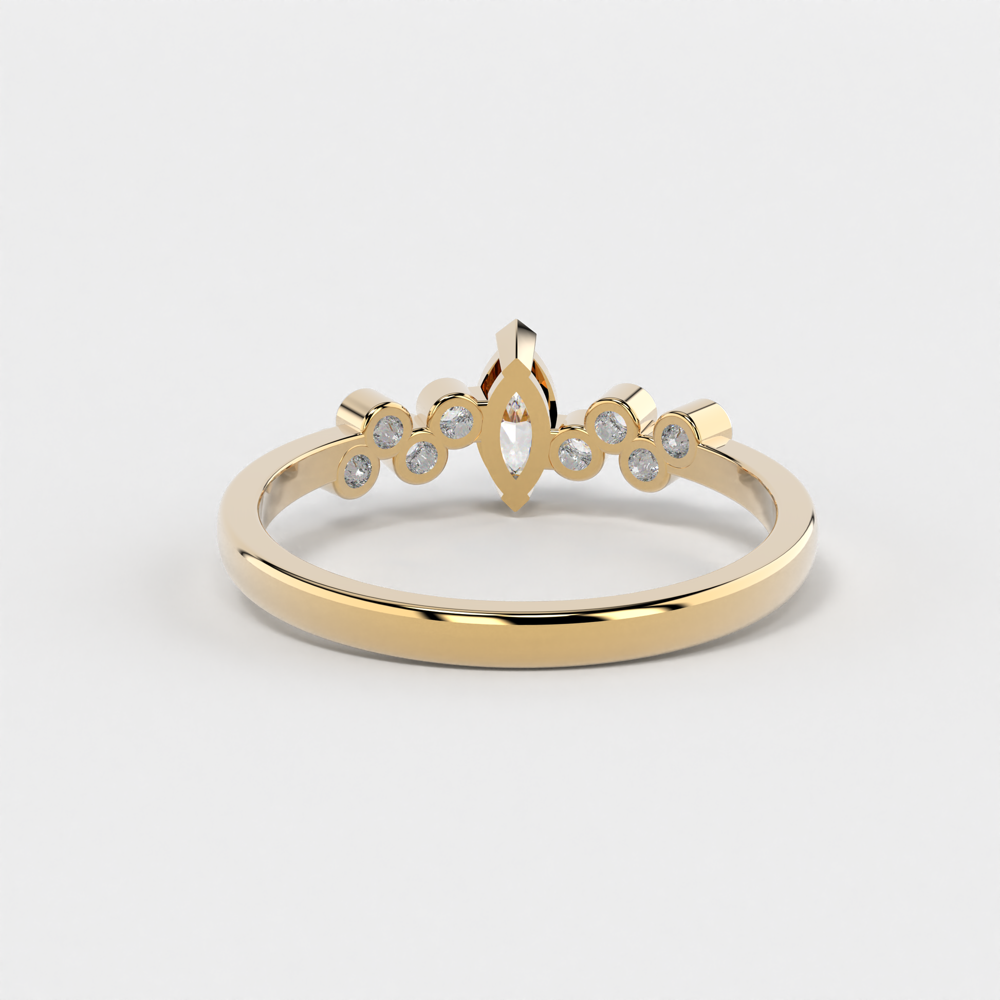 Introducing the 'Nova Marquise Ring' by Elior Jewel, a sleek embodiment of modern sophistication. This design highlights a striking marquise diamond, exquisitely framed by eight round-cut diamonds that echo the celestial sparkle of a nova. The total diamond weight of 0.28 carats approximately is meticulously set to catch the light at every turn, ensuring that the ring dazzles with a stellar radiance. The 'Nova Marquise Ring' is the perfect accessory for those who wish to add a touch of cosmic elegance to their everyday style or special occasions.