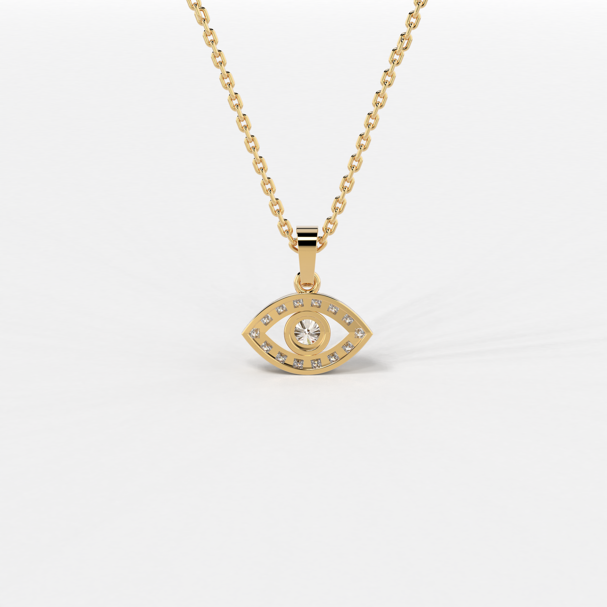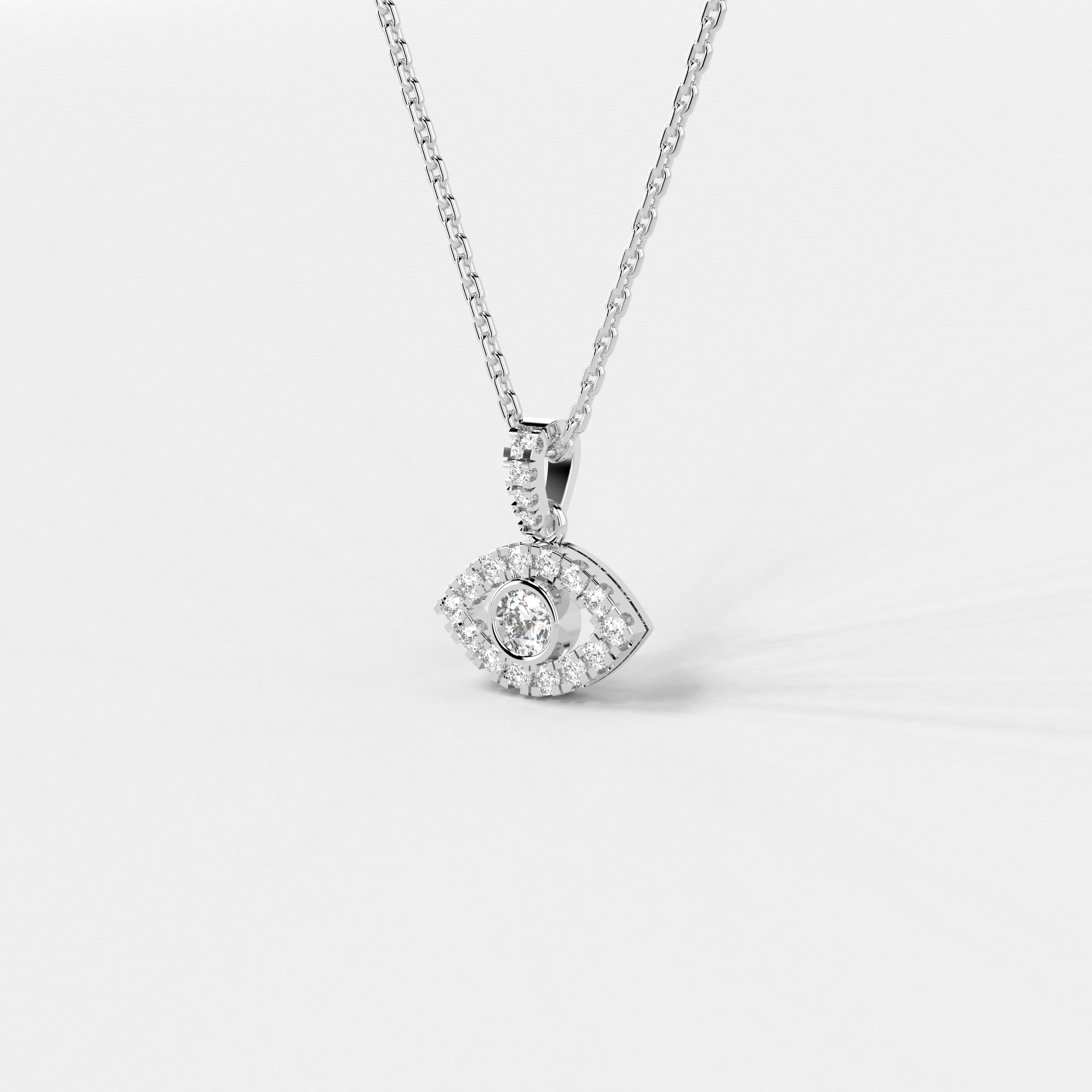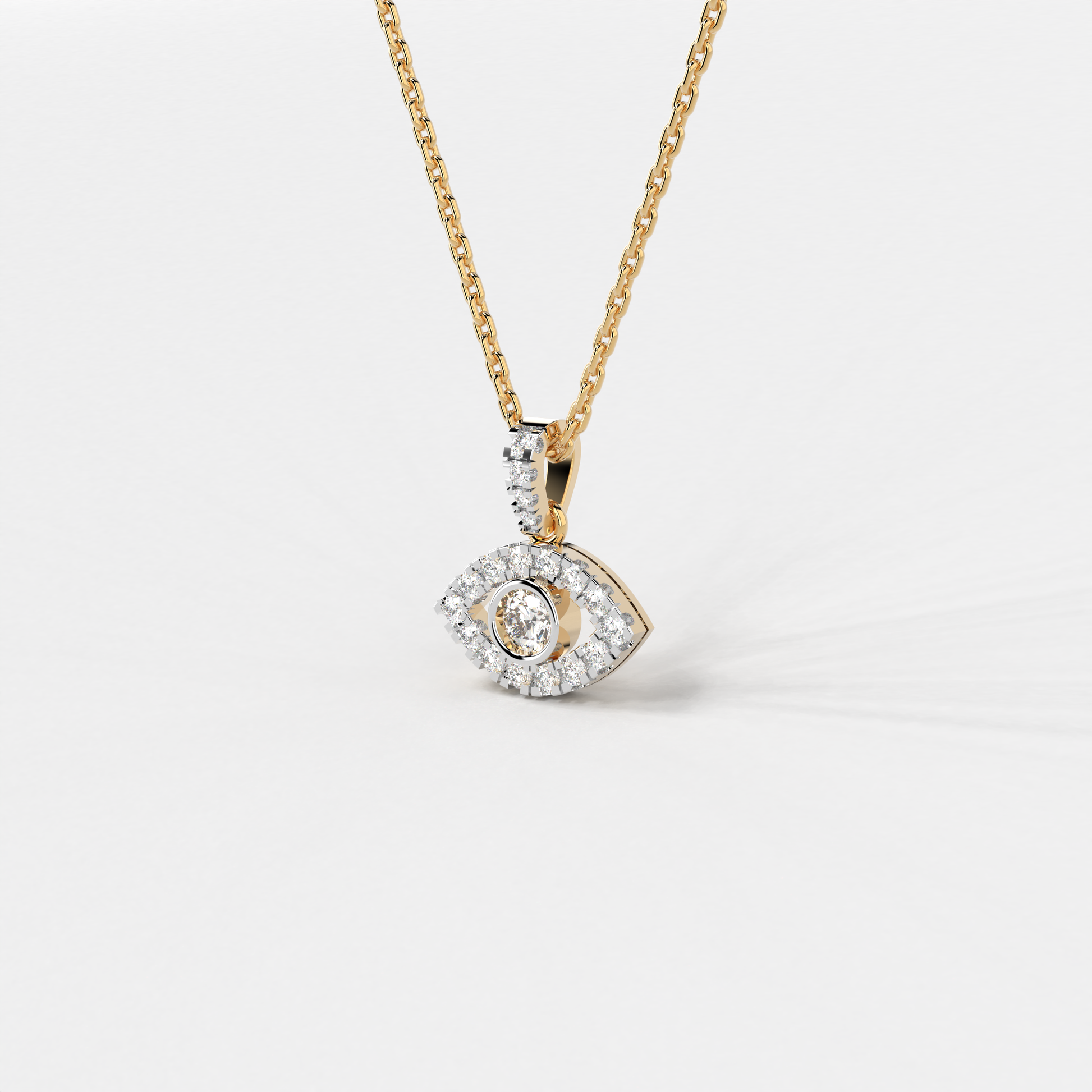 The "Azure Gaze Pendant" from Elior Jewel is a stunning fusion of bold modernity and classic allure, designed to captivate and enchant. This exquisite piece features a mesmerizing deep blue sapphire at its core, encased within a brilliantly crafted eye-shaped design. The sapphire, weighing 0.66 carats, serves as the focal point, surrounded by a luminous halo of diamonds that accentuate its rich color and add to the pendant's overall sparkle. This eye-catching design not only symbolizes protection and wisdom but also adds a touch of mysterious elegance to any attire. With a total diamond weight of 0.26 carats approximately and a pendant size of 16.80 mm, the "Azure Gaze Pendant" balances intricate detailing with a statement-making presence. This pendant is a perfect choice for those seeking a piece that combines the vibrancy of sapphire with the timeless beauty of diamonds in a unique and eye-catching design.