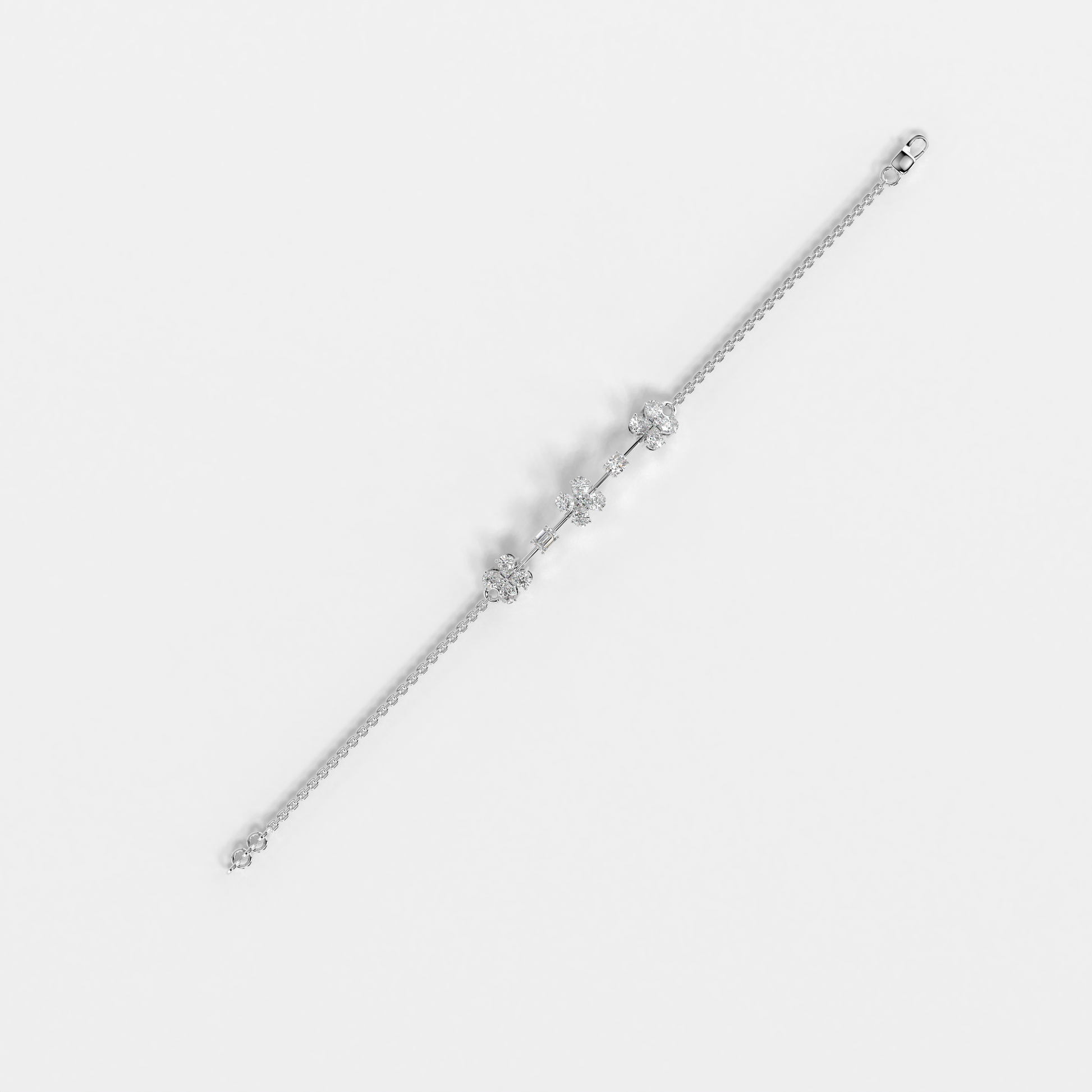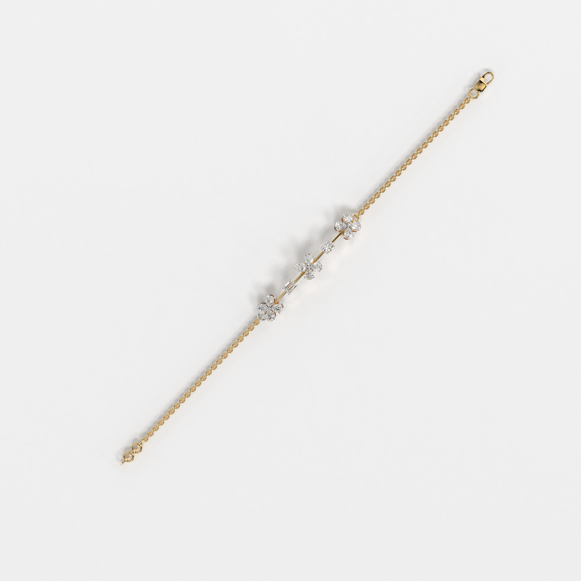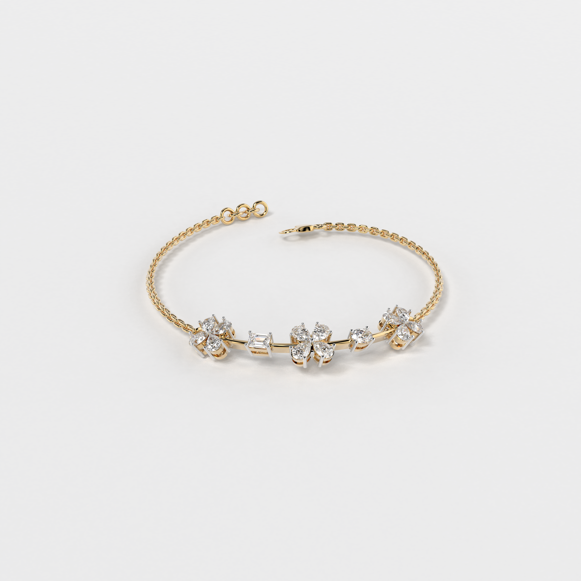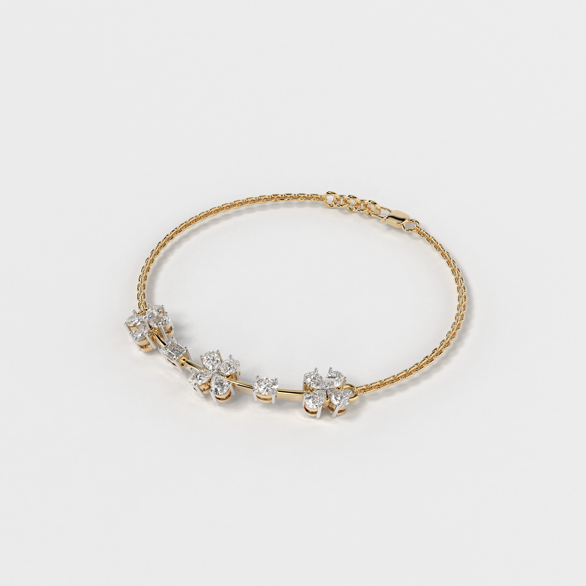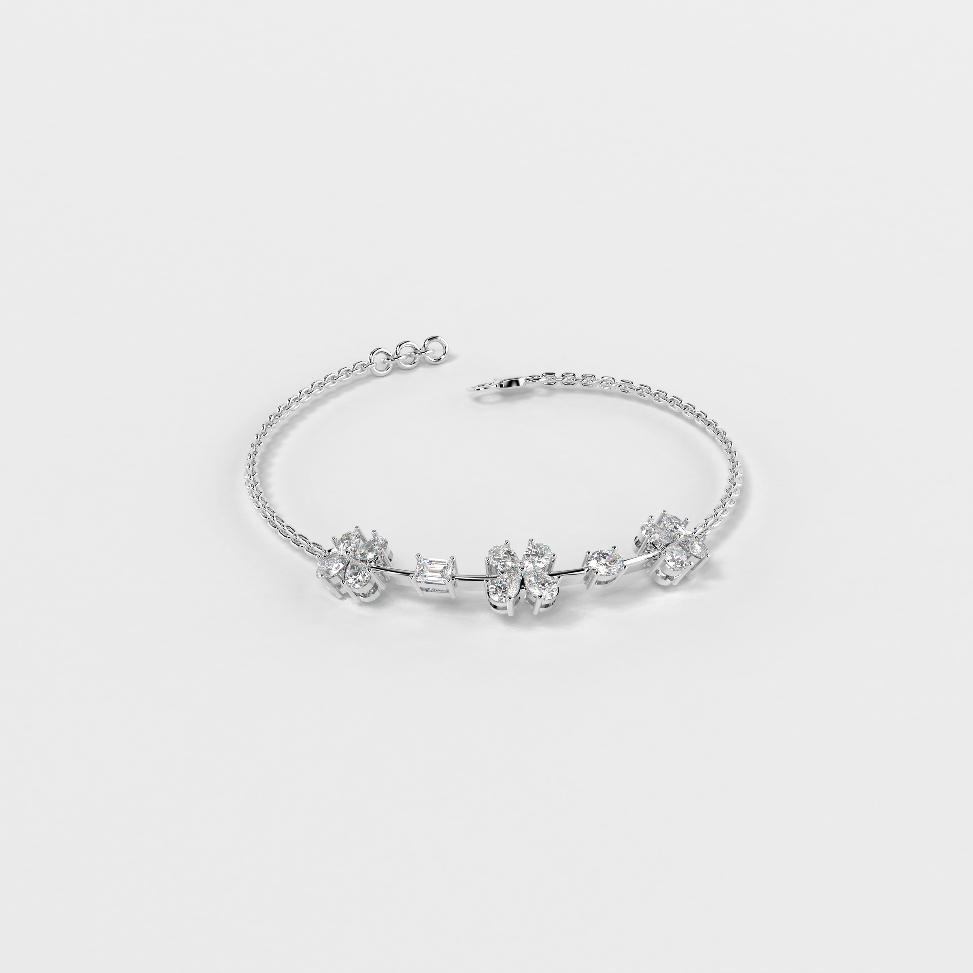 Elevate your style with the "Floral Whisper Bracelet" from Elior Jewel, where elegance meets contemporary charm. This delicate bracelet is beautifully crafted for those desiring a touch of extra sophistication. It is designed to enchant with its unique sequence of floral motifs, each bloom set with precision-cut diamonds that sparkle with every movement. The bracelet features a total of 12 pear-shaped diamonds, positioned to mimic gentle flowers. It also showcases an exquisite emerald cut stone, adding a subtle hint of color with its deep green hue, and an oval diamond that brings additional luster to the arrangement. This bracelet is perfect for those who appreciate the finer details and seek a piece that combines classic floral aesthetics with modern design elements. It's ideal for everyday elegance or as a standout accessory for special occasions
