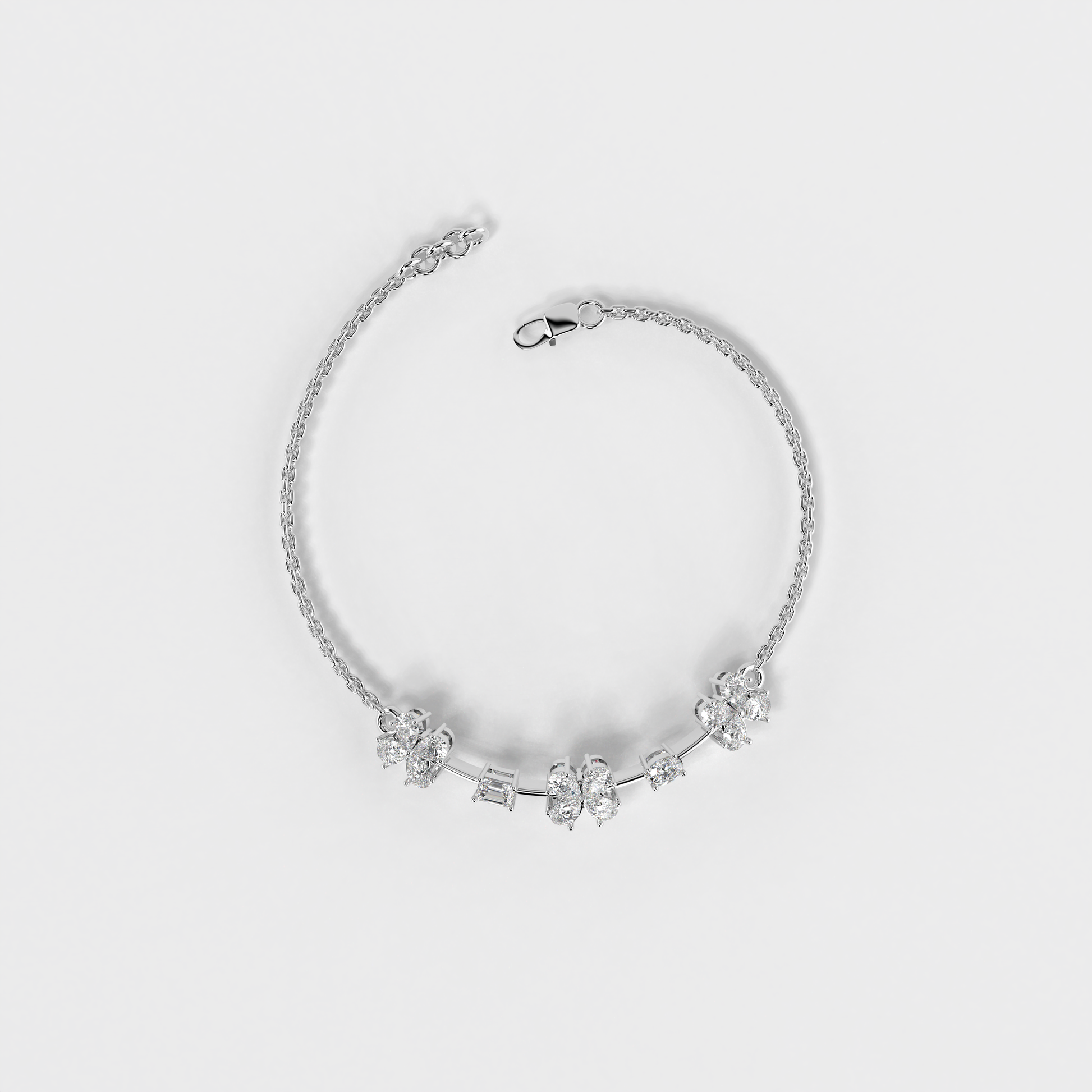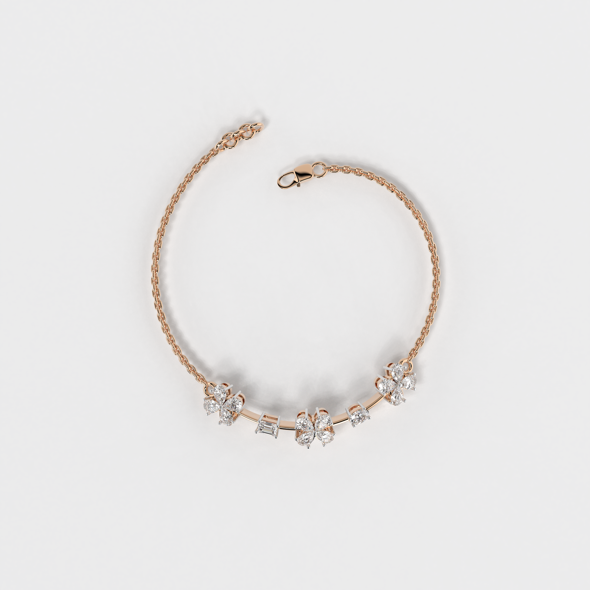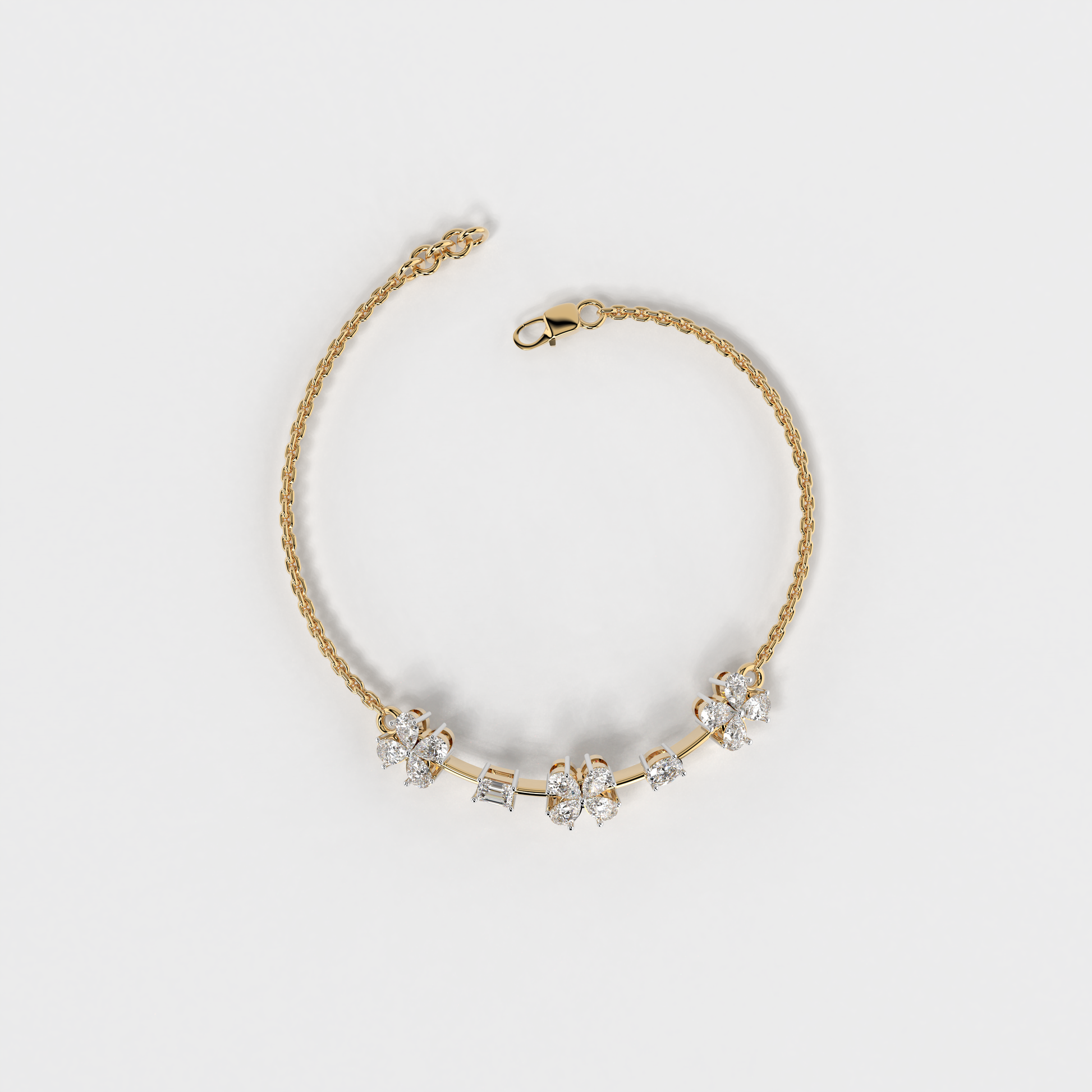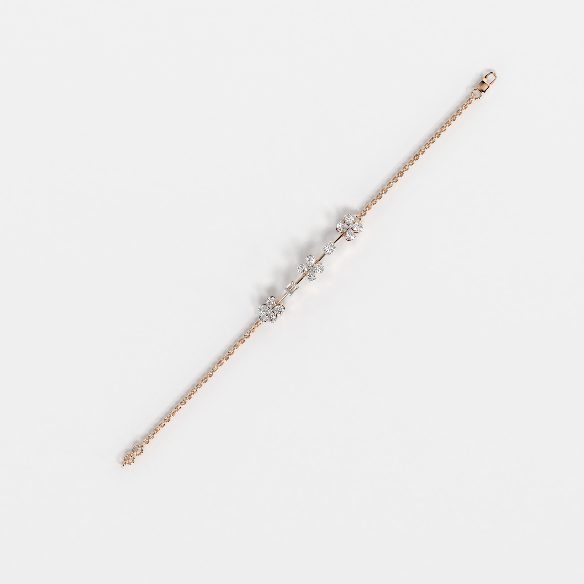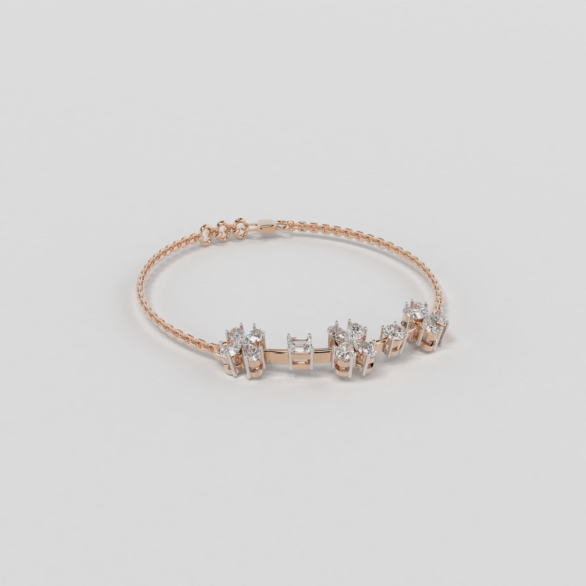 Elevate your style with the "Floral Whisper Bracelet" from Elior Jewel, where elegance meets contemporary charm. This delicate bracelet is beautifully crafted for those desiring a touch of extra sophistication. It is designed to enchant with its unique sequence of floral motifs, each bloom set with precision-cut diamonds that sparkle with every movement. The bracelet features a total of 12 pear-shaped diamonds, positioned to mimic gentle flowers. It also showcases an exquisite emerald cut stone, adding a subtle hint of color with its deep green hue, and an oval diamond that brings additional luster to the arrangement. This bracelet is perfect for those who appreciate the finer details and seek a piece that combines classic floral aesthetics with modern design elements. It's ideal for everyday elegance or as a standout accessory for special occasions