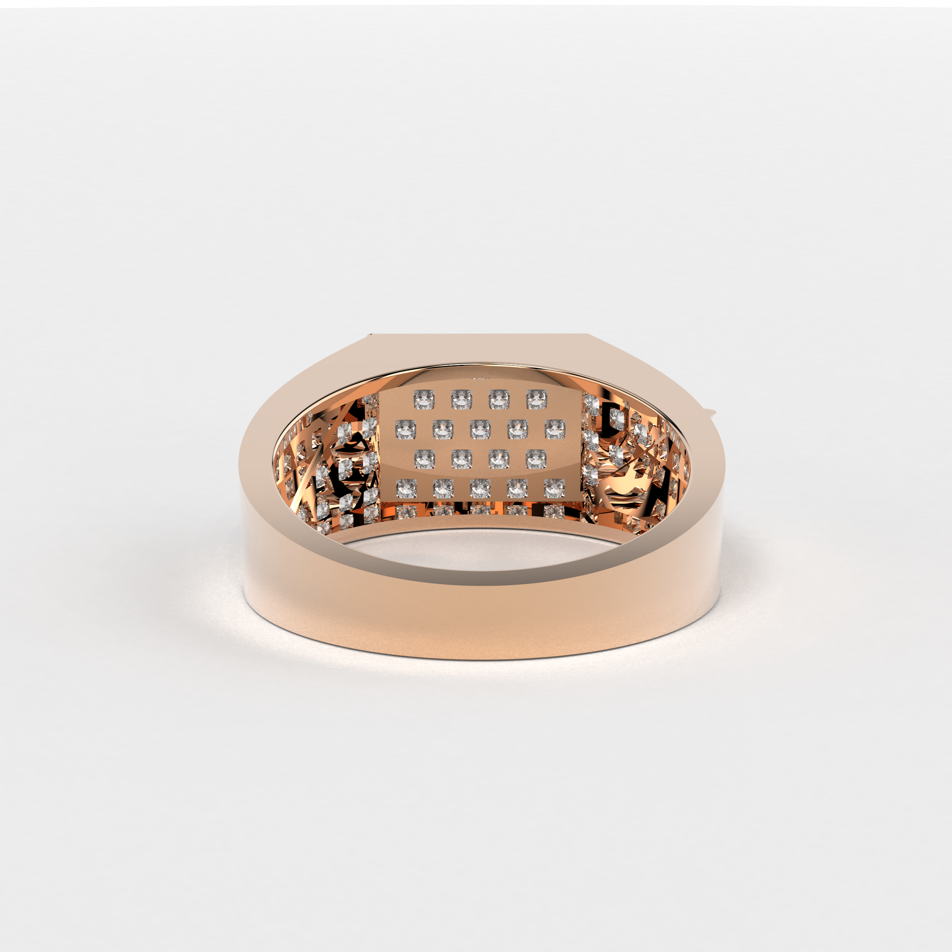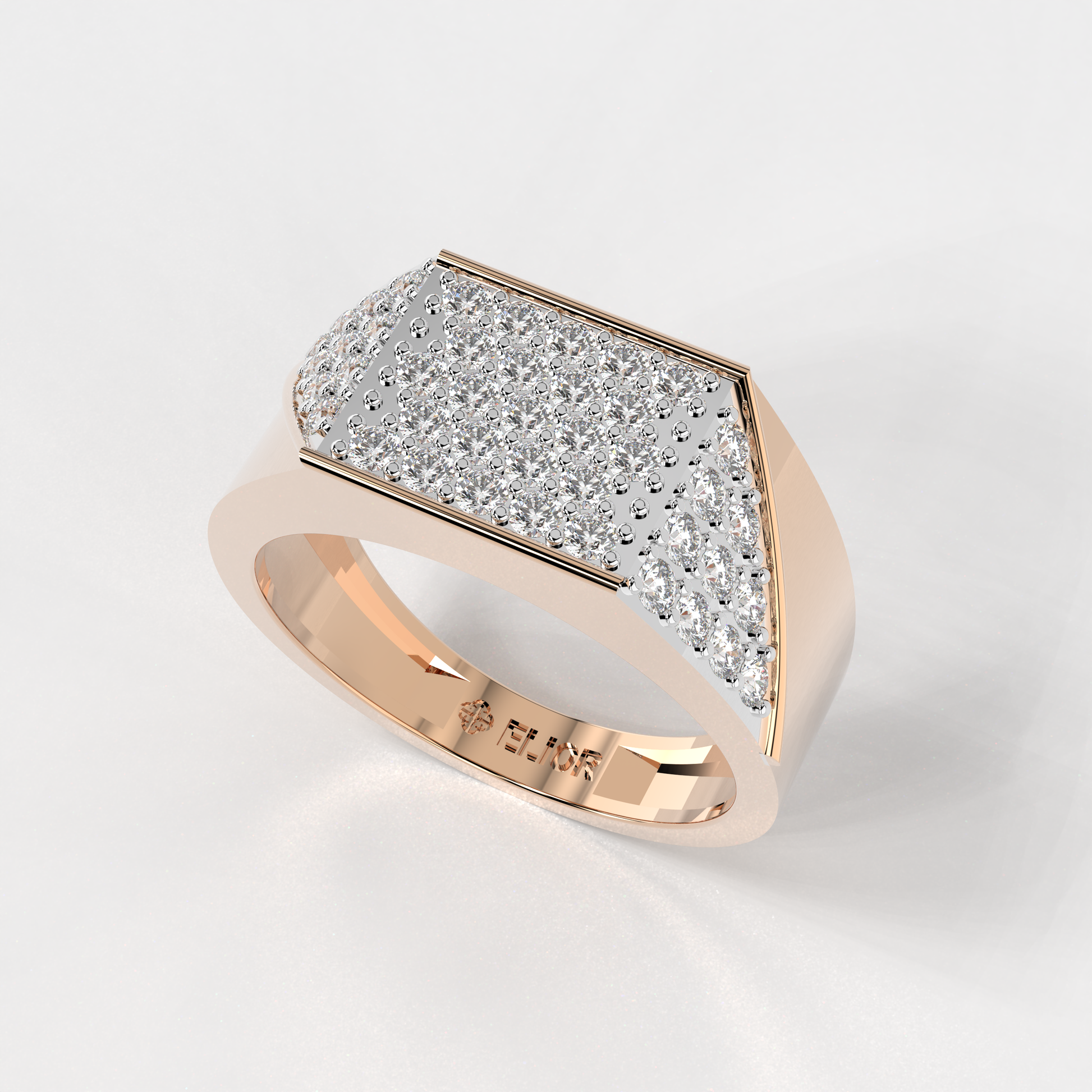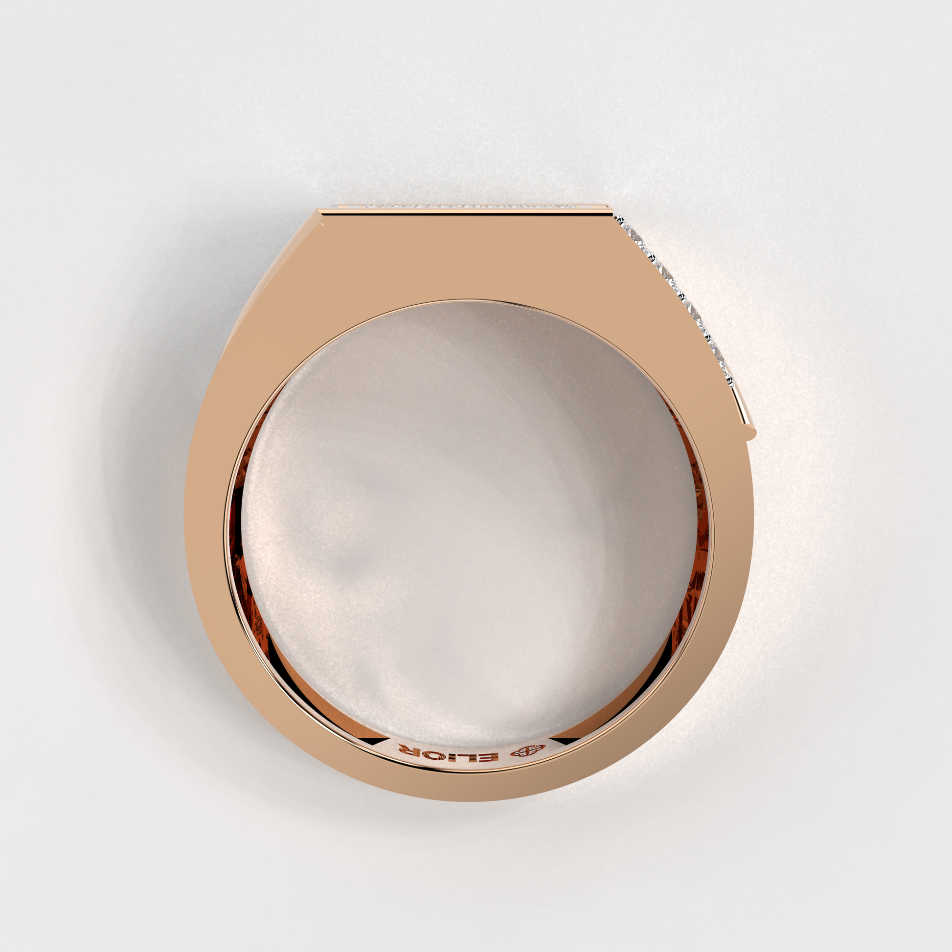 Embrace modern sophistication with the "Geometric Majesty" Diamond Ring, a masterpiece meticulously crafted by Elior Jewel. This striking ring features a bold and minimalist design, showcasing a captivating array of round brilliant-cut diamonds meticulously set in a pave setting to create a stunning geometric pattern. The diamonds, totaling 1.075 carats in weight with 43 carefully placed stones, are expertly showcased to maximize their brilliance and fire, creating a mesmerizing display of light that will catch the eye from every angle.the ring's band boasts a sleek and substantial silhouette, adding a touch of modern luxury to this classic piece. The smooth, polished surface of the rose gold complements the diamonds' fiery sparkle, creating a harmonious balance between contemporary design and timeless elegance.Whether worn as a statement piece, a wedding band, or an anniversary band, the Geometric Majesty Diamond Ring is sure to become a cherished addition to any man's jewelry collection. Its versatile design and exquisite craftsmanship make it a perfect choice for the modern gentleman who appreciates both style and substance.