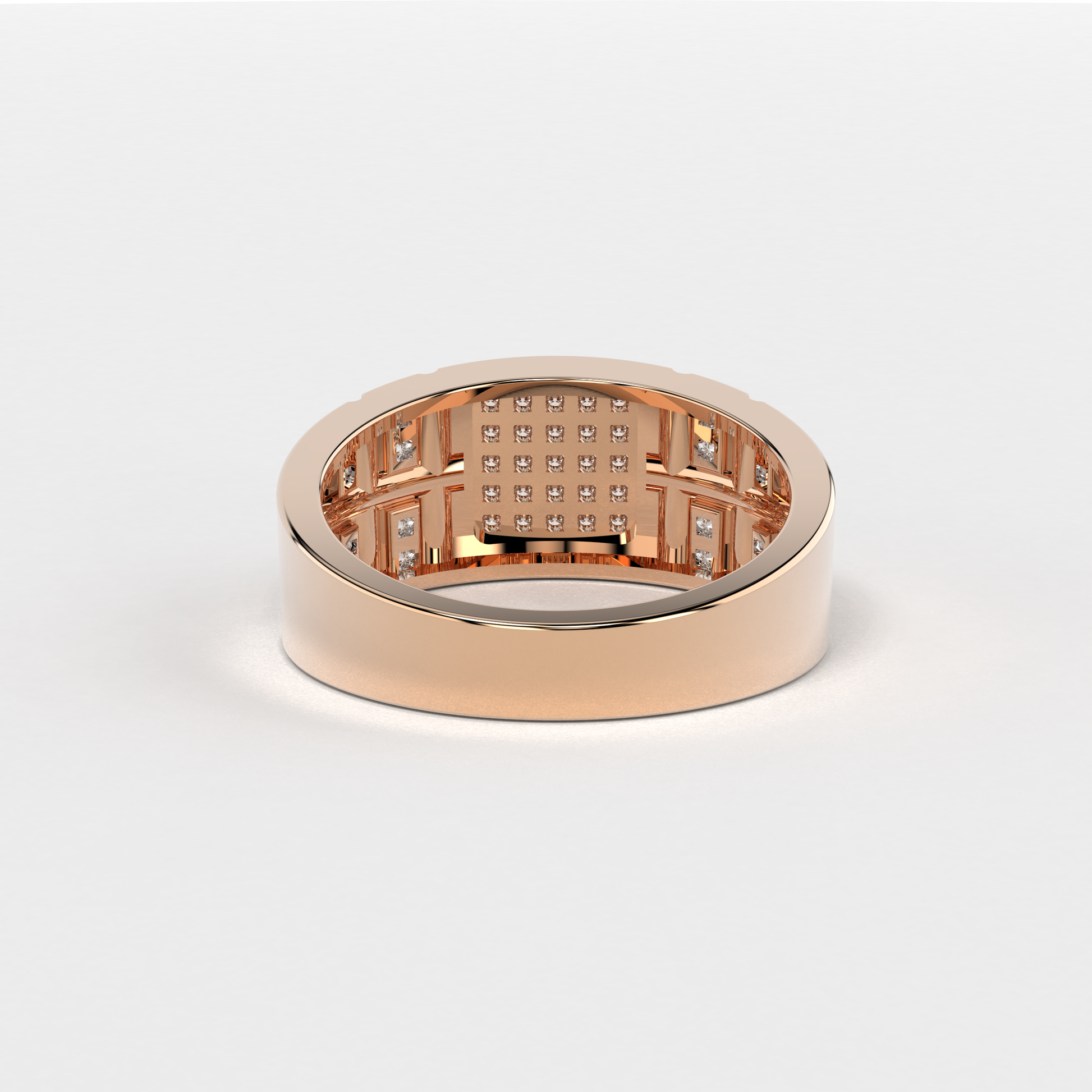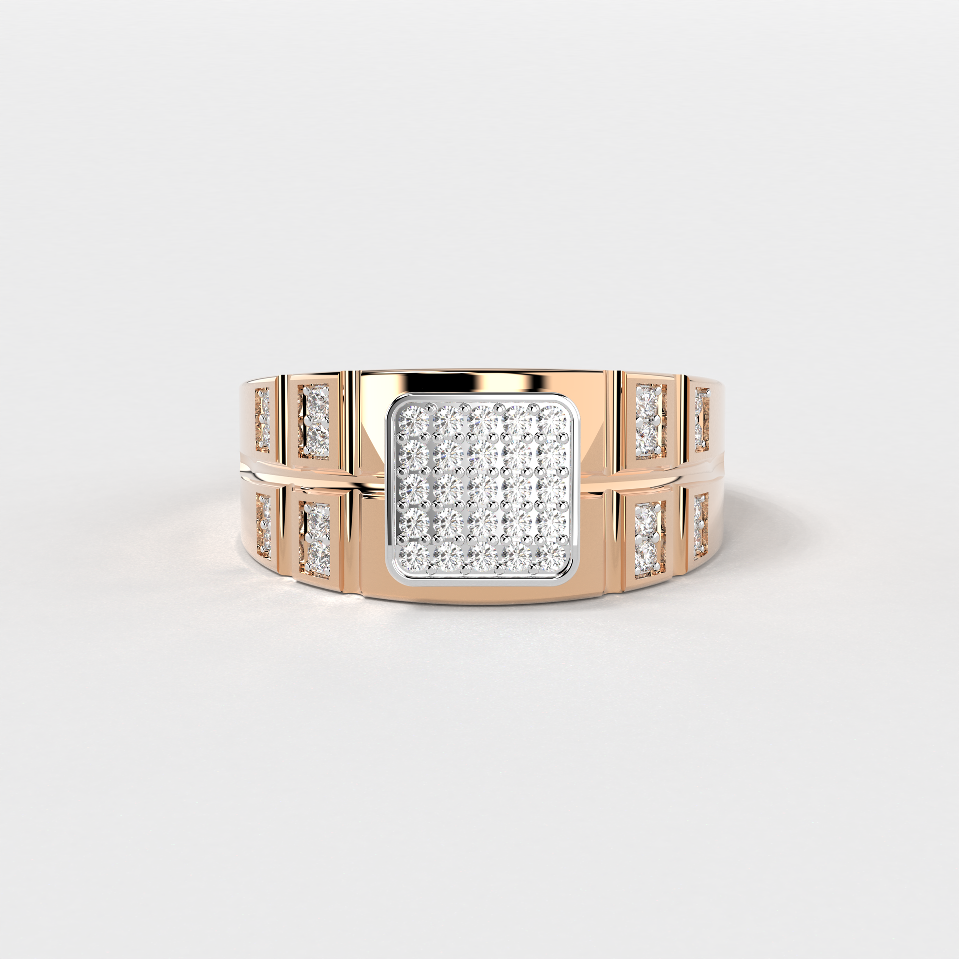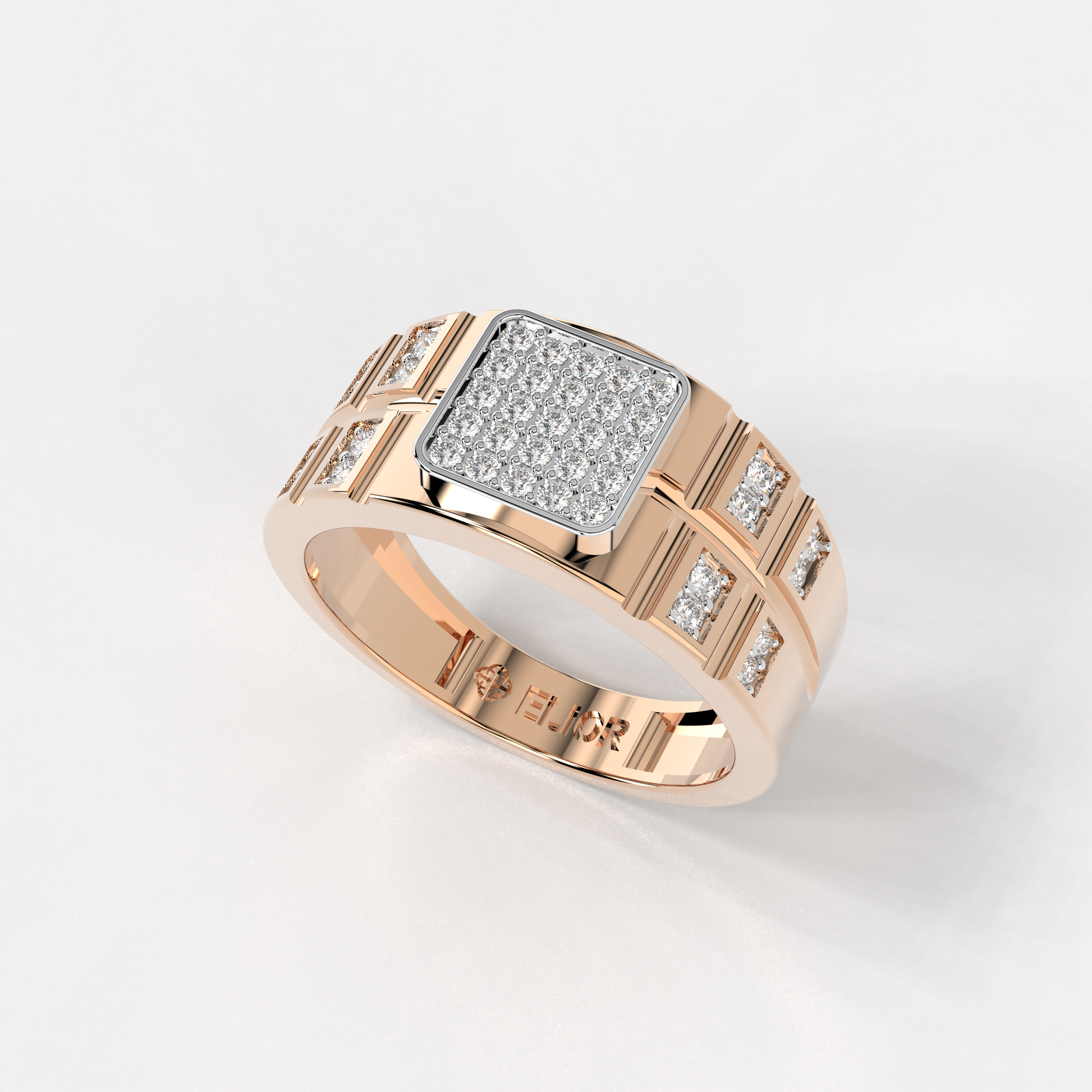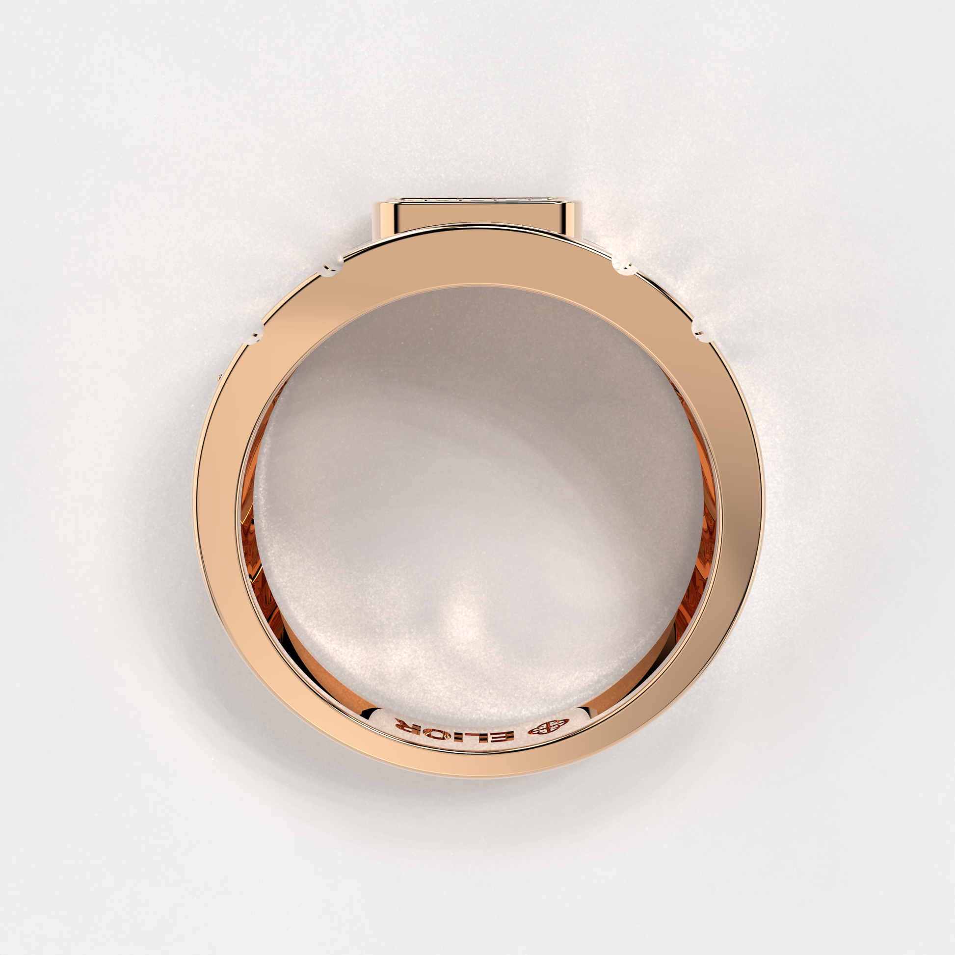 Embrace modern sophistication with the "Metropolitan Mosaic" Diamond Ring, a masterpiece meticulously crafted by Elior Jewel. This striking ring features a bold and geometric design, showcasing a captivating array of round brilliant-cut diamonds meticulously set in a pave and channel setting to create a stunning mosaic pattern.The ring boasts three distinct sections, each adorned with sparkling diamonds. The central section features a pave-set square cluster of diamonds, radiating outwards like a brilliant sunburst. Flanking this centerpiece are two rectangular sections, each showcasing a channel-set row of diamonds that add a touch of linear elegance to the design. The diamonds, totaling 0.427 carats in weight, are expertly showcased to maximize their brilliance and fire, creating a mesmerizing display of light that will catch the eye from every angle.the ring's band boasts a sleek and substantial silhouette, adding a touch of modern luxury to this classic piece. The smooth, polished surface of the rose gold complements the diamonds' fiery sparkle, creating a harmonious balance between contemporary design and timeless elegance.Whether worn as a statement piece, a wedding band, or an anniversary band, the Metropolitan Mosaic Diamond Ring is sure to become a cherished addition to any man's jewelry collection. Its versatile design and exquisite craftsmanship make it a perfect choice for the modern gentleman who appreciates both style and substance.