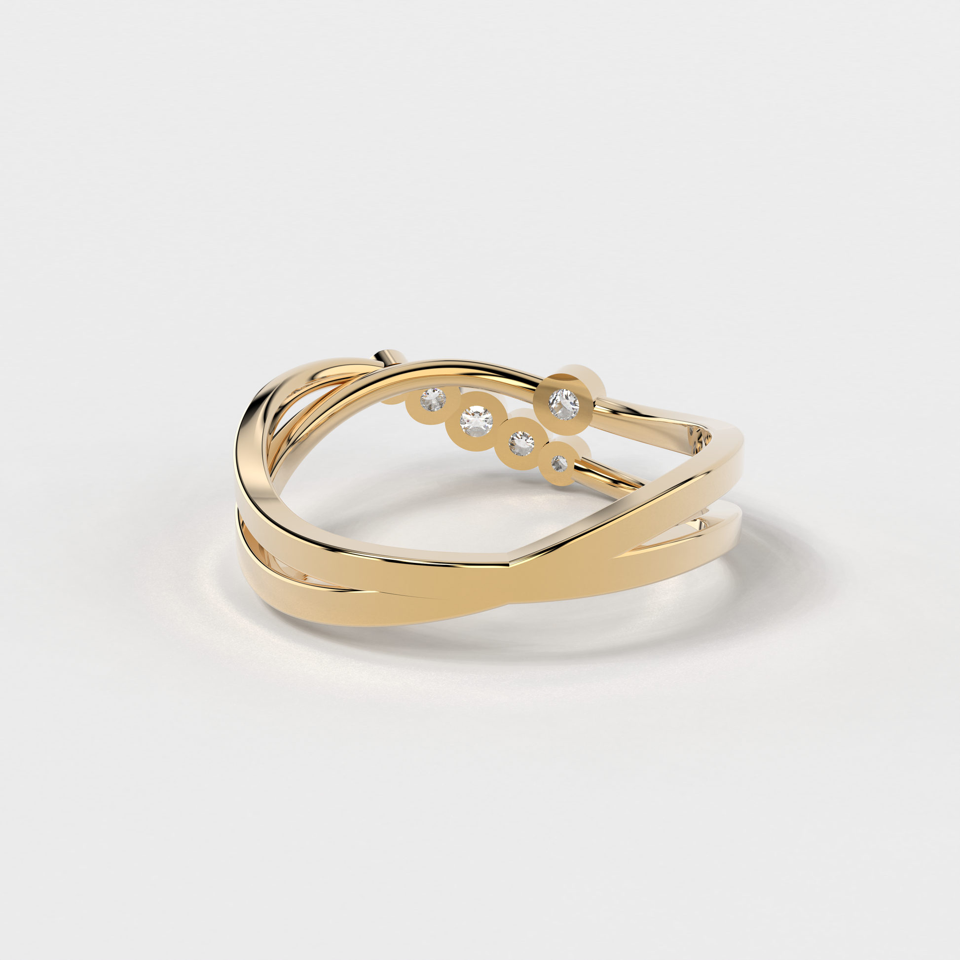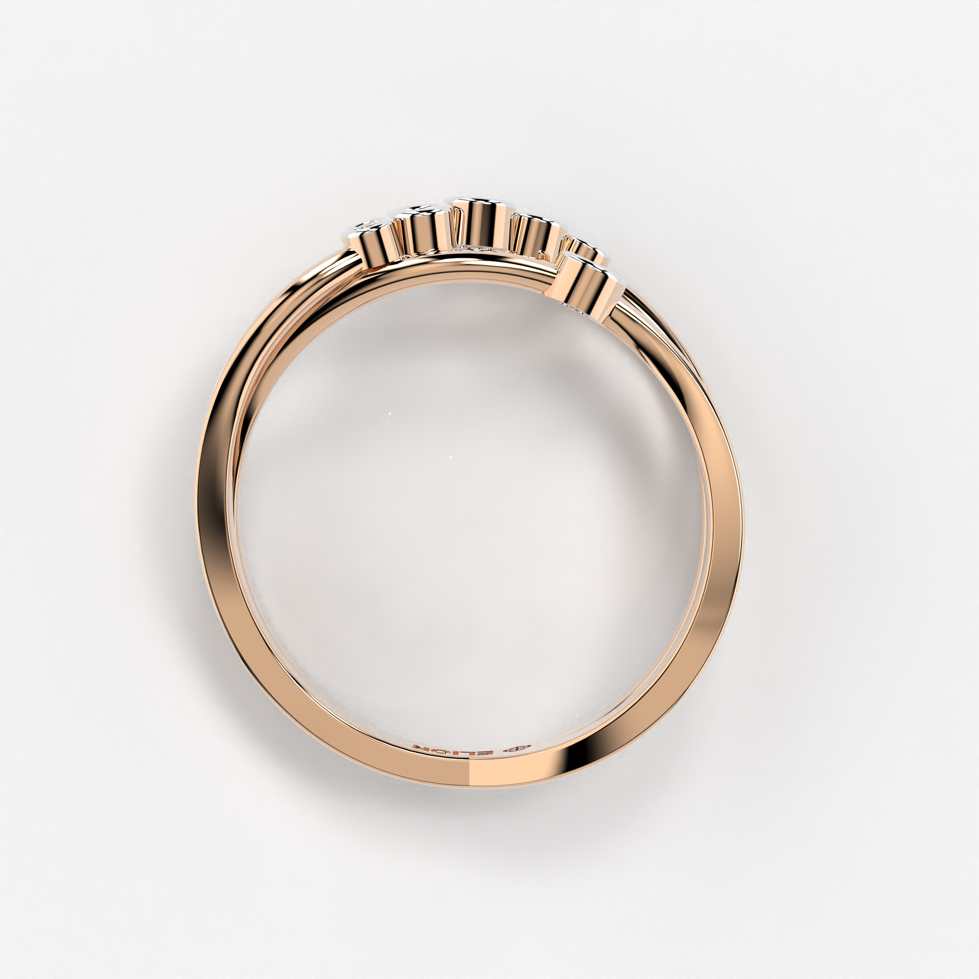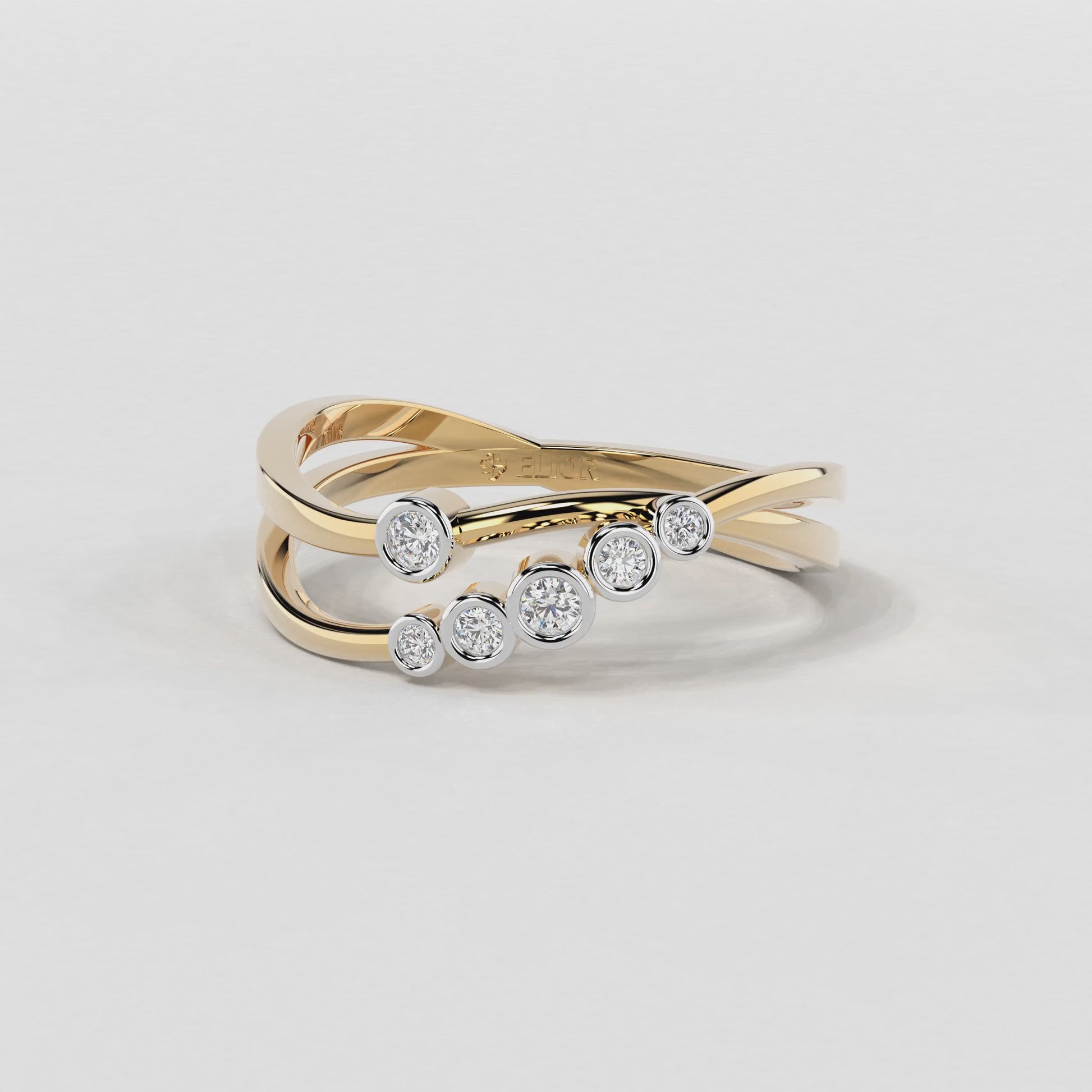 Meet the 'Sleek Harmony Ring' by Elior Jewel—a minimalist's dream. This ring is a study in understated elegance, with a dual-tone band that gently intertwines, showcasing six round-cut diamonds totaling 0.09 carats approximately. Each stone is nestled within the gold embrace, offering a subtle sparkle that's perfect for every day. The ring's sleek design embodies contemporary chic, making it a versatile piece for both casual and formal wear. Simple yet sophisticated, the 'Sleek Harmony Ring' is an ode to the beauty of clean lines and pure forms.