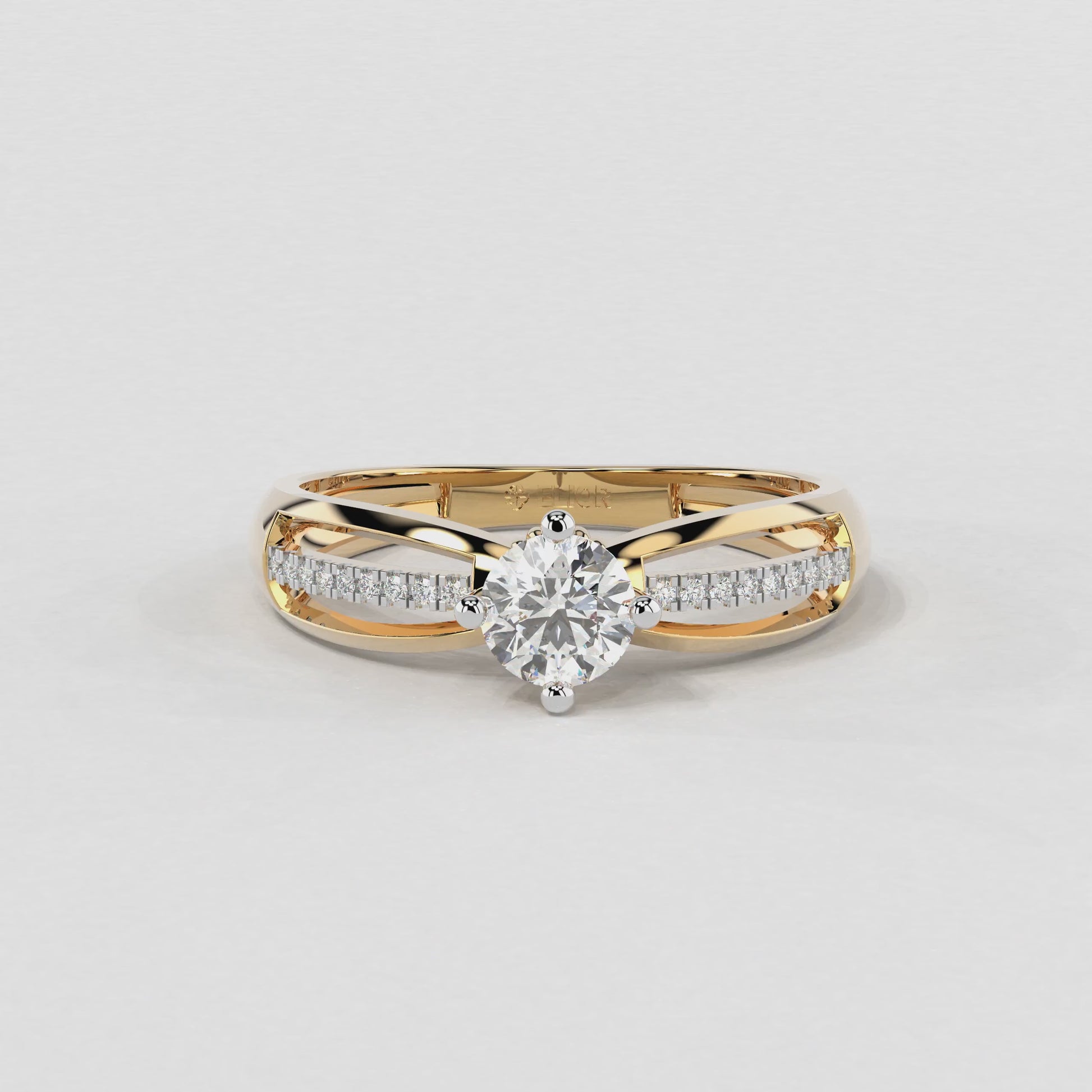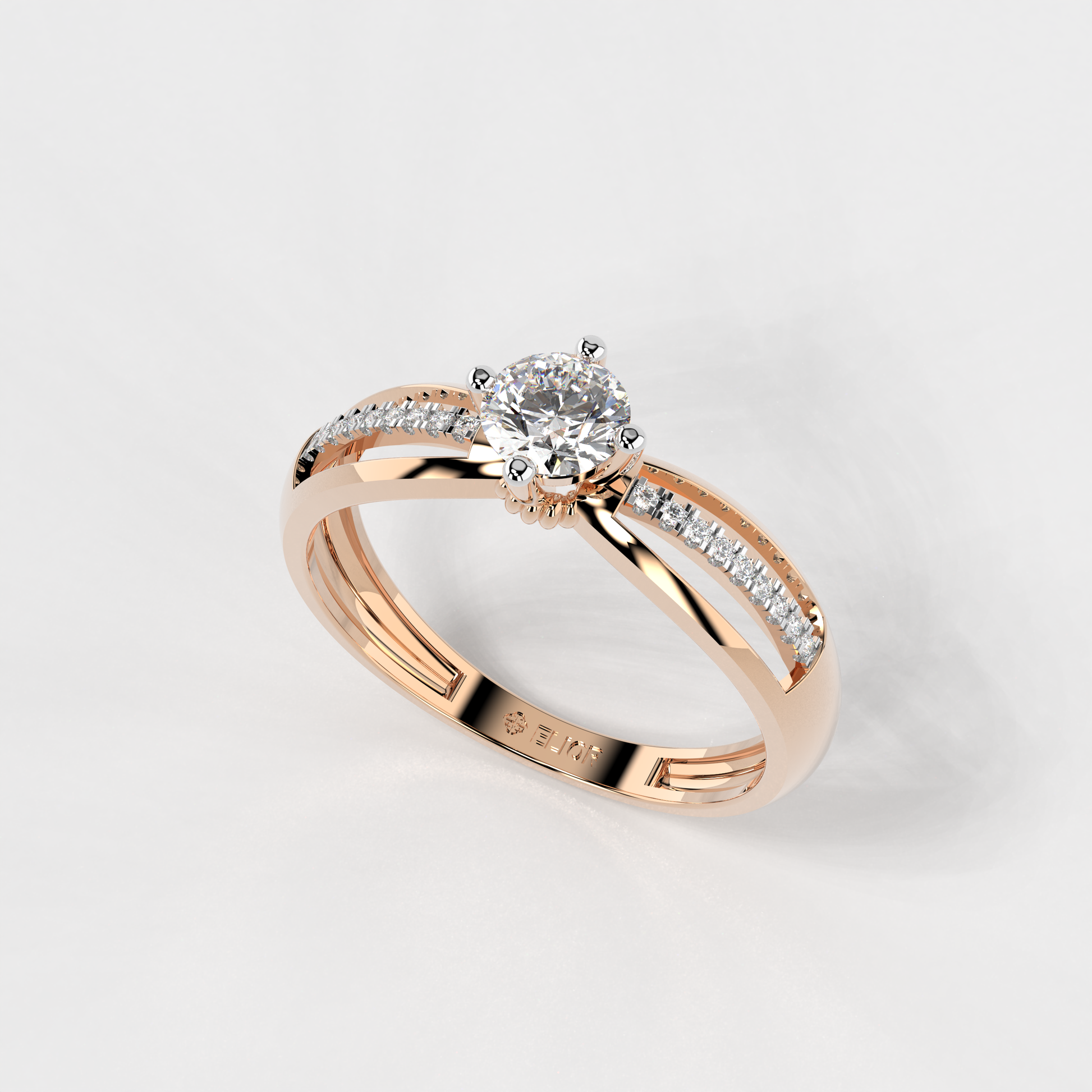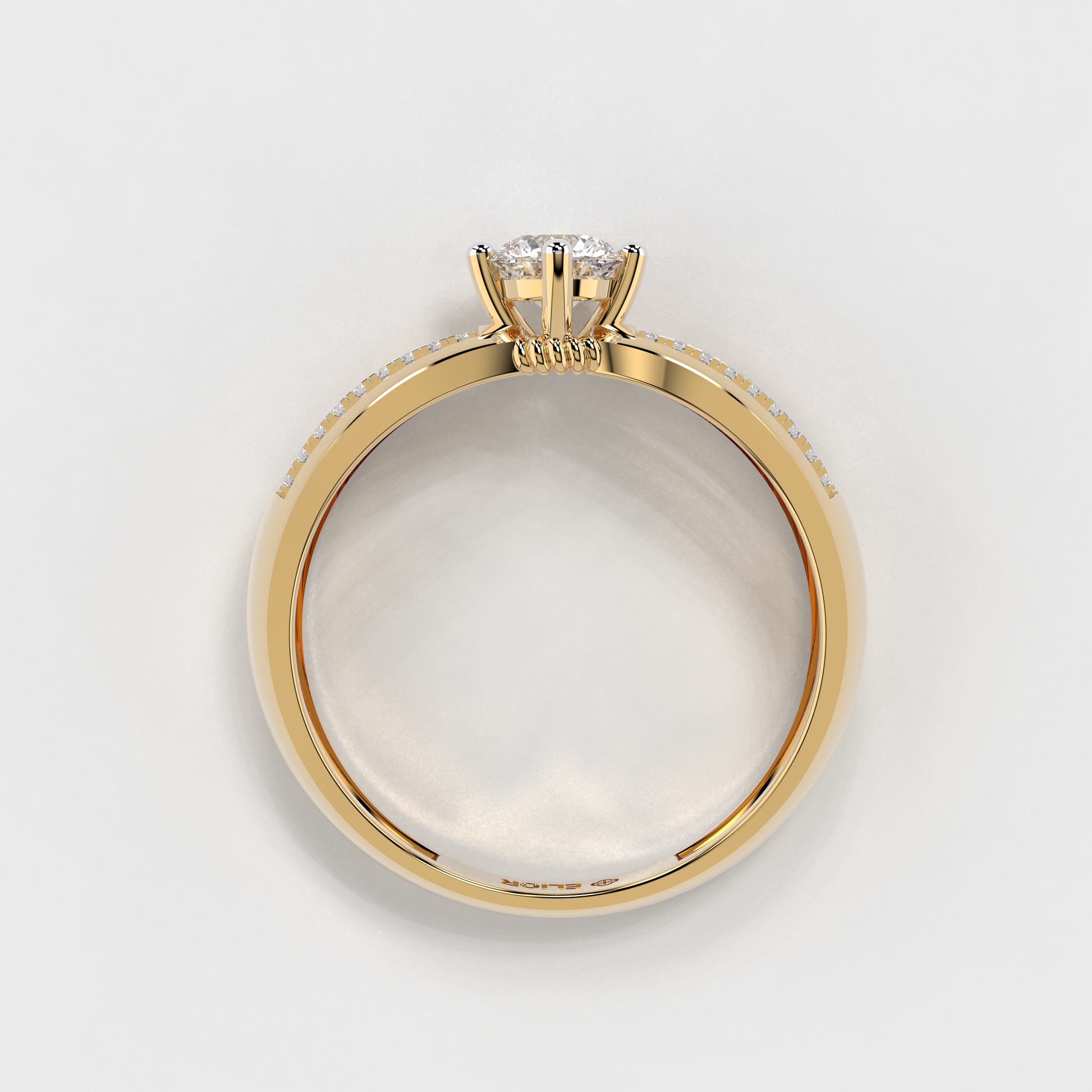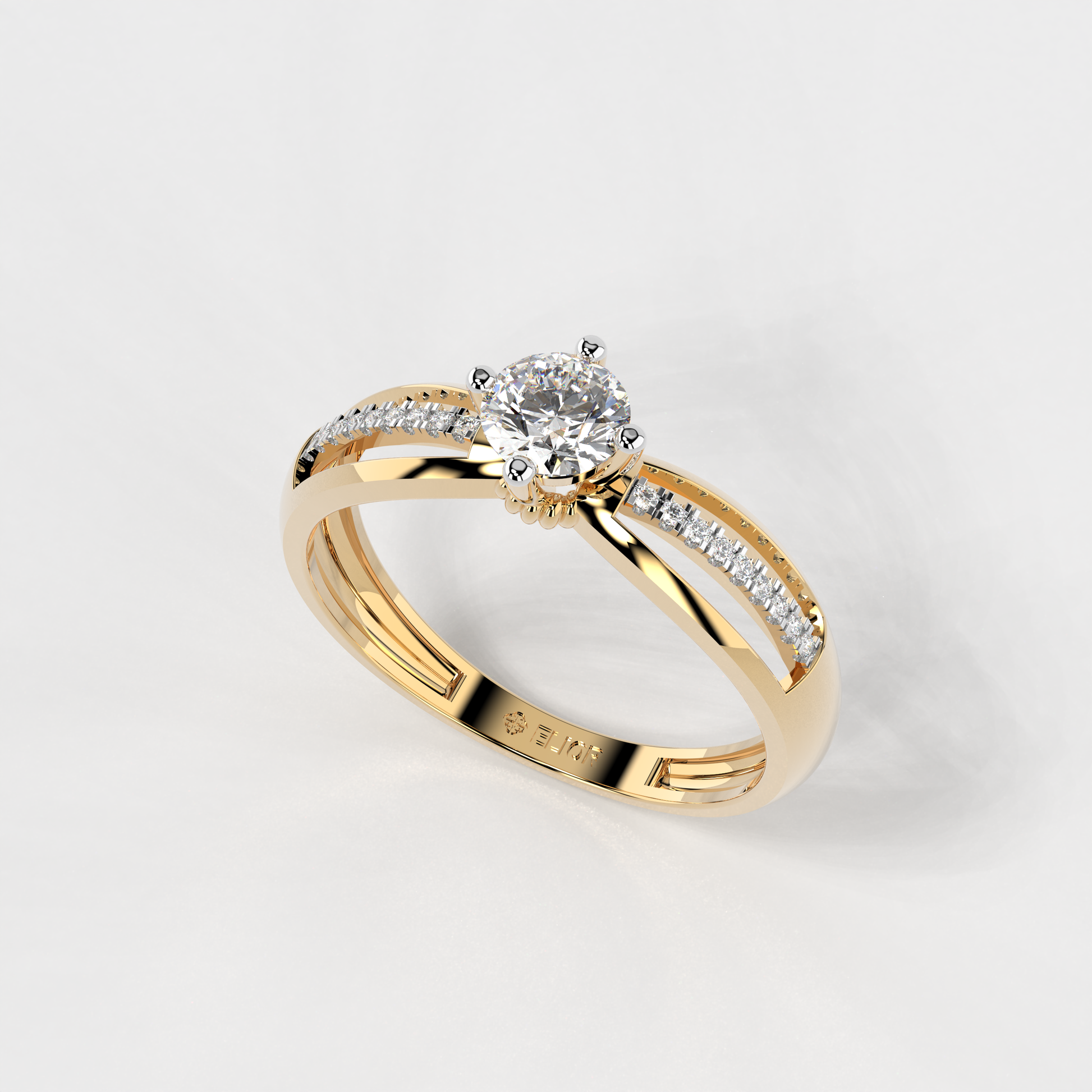 The 'Solitaire Spark Ring' by Elior Jewel is a testament to refined taste. It boasts a stunning central round-cut diamond that is both bold and classic, a gemstone that commands attention with its 0.34 carats of radiant luster. The band, lined with 18 smaller diamonds totaling 0.06 carats approximately, sweeps up elegantly to cradle the centerpiece. This design achieves a delicate balance between understated sophistication and conspicuous glamour, making the 'Solitaire Spark Ring' a perfect choice for those who seek to make a statement of elegance in their every gesture.