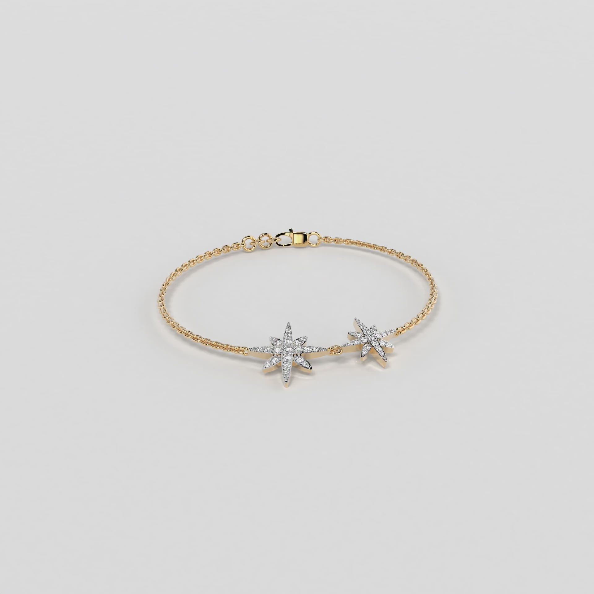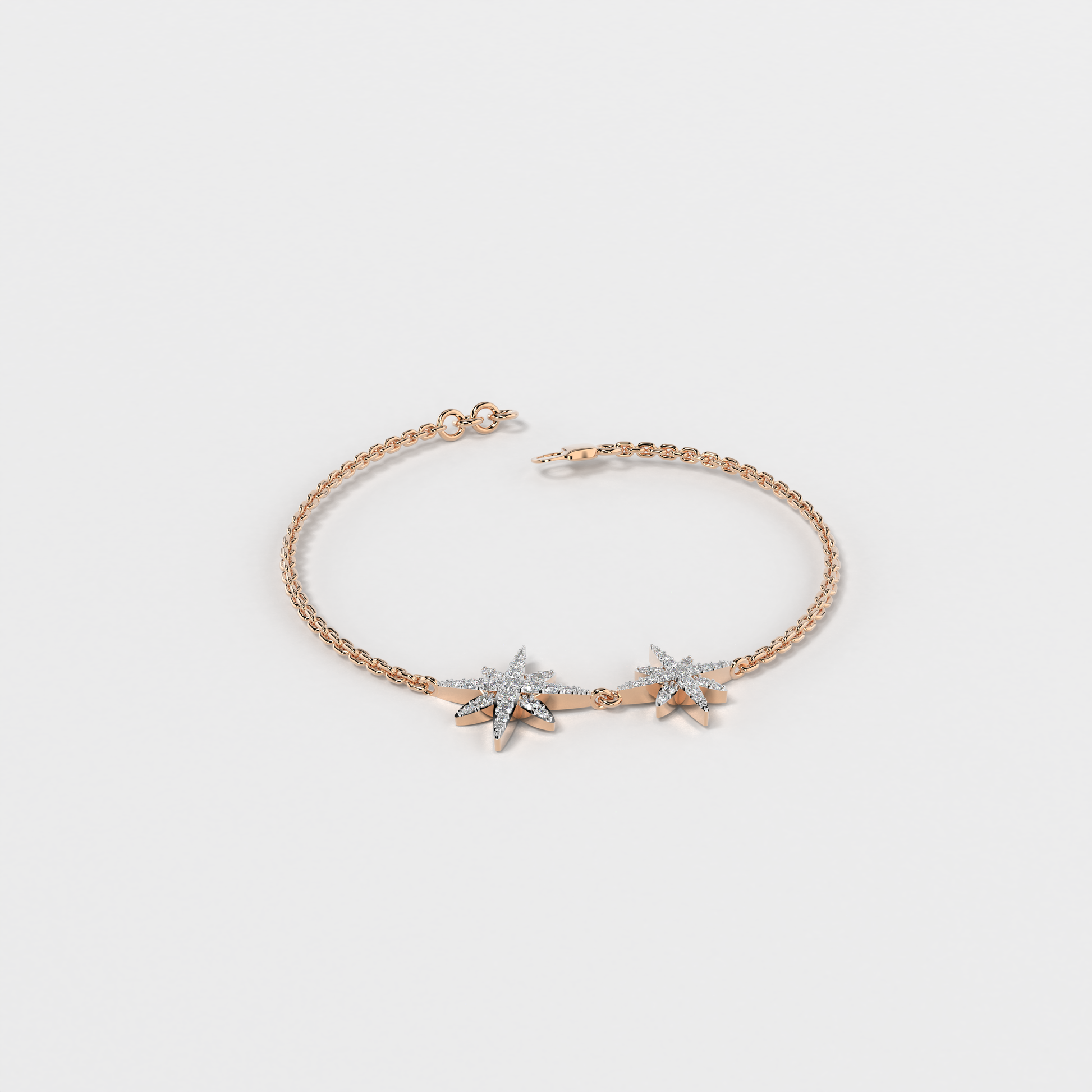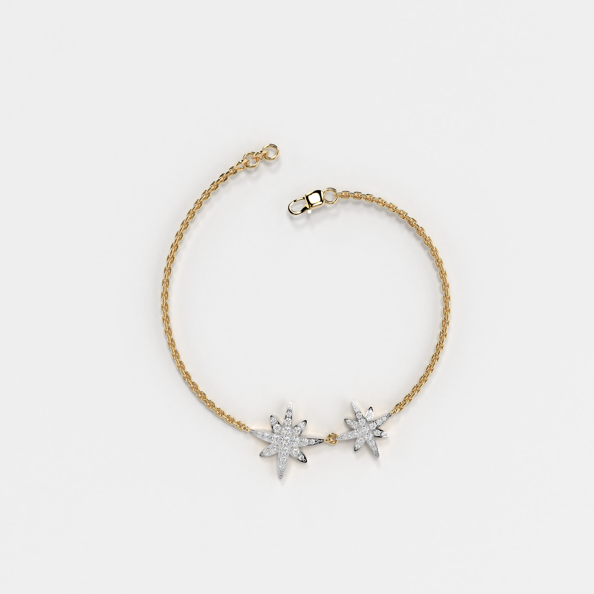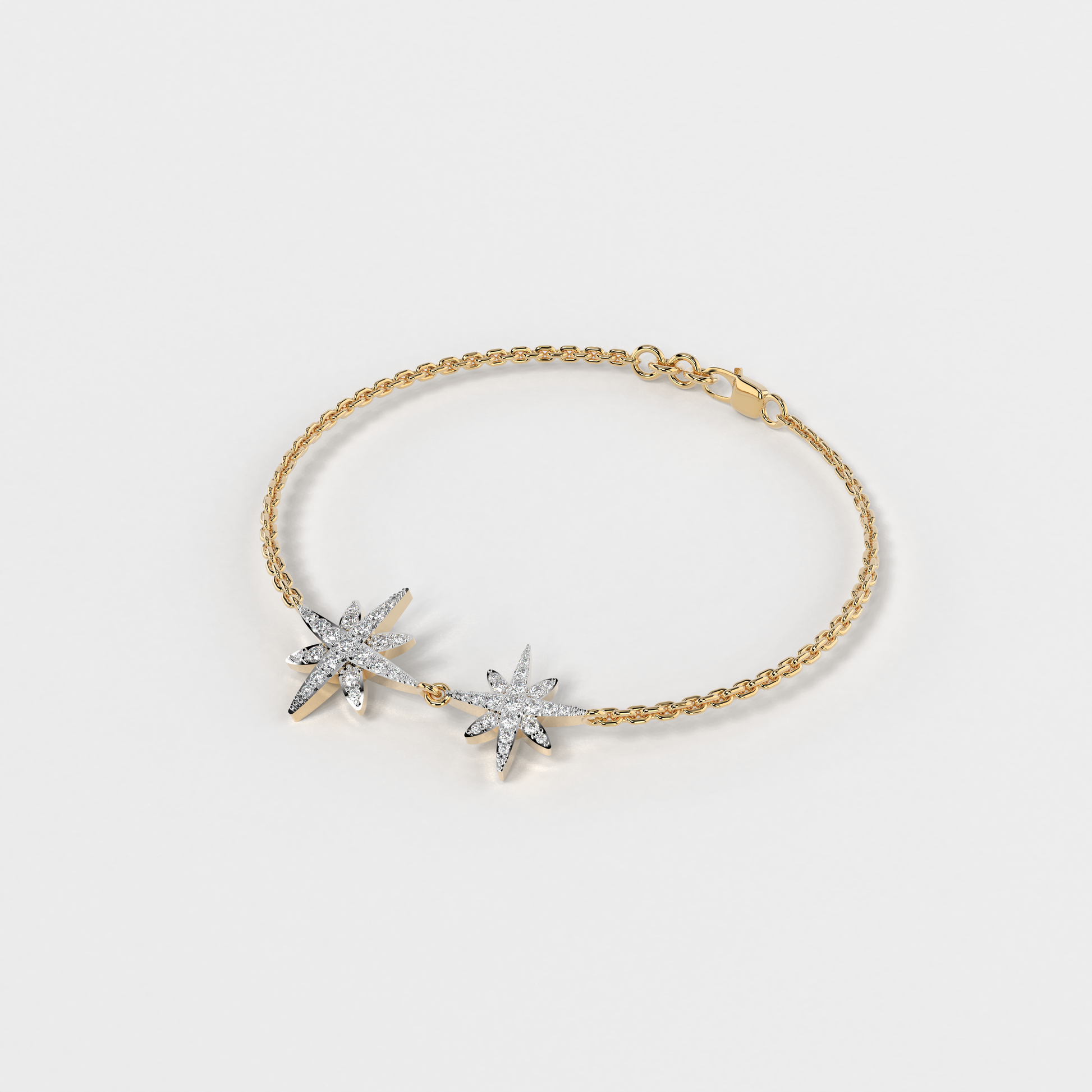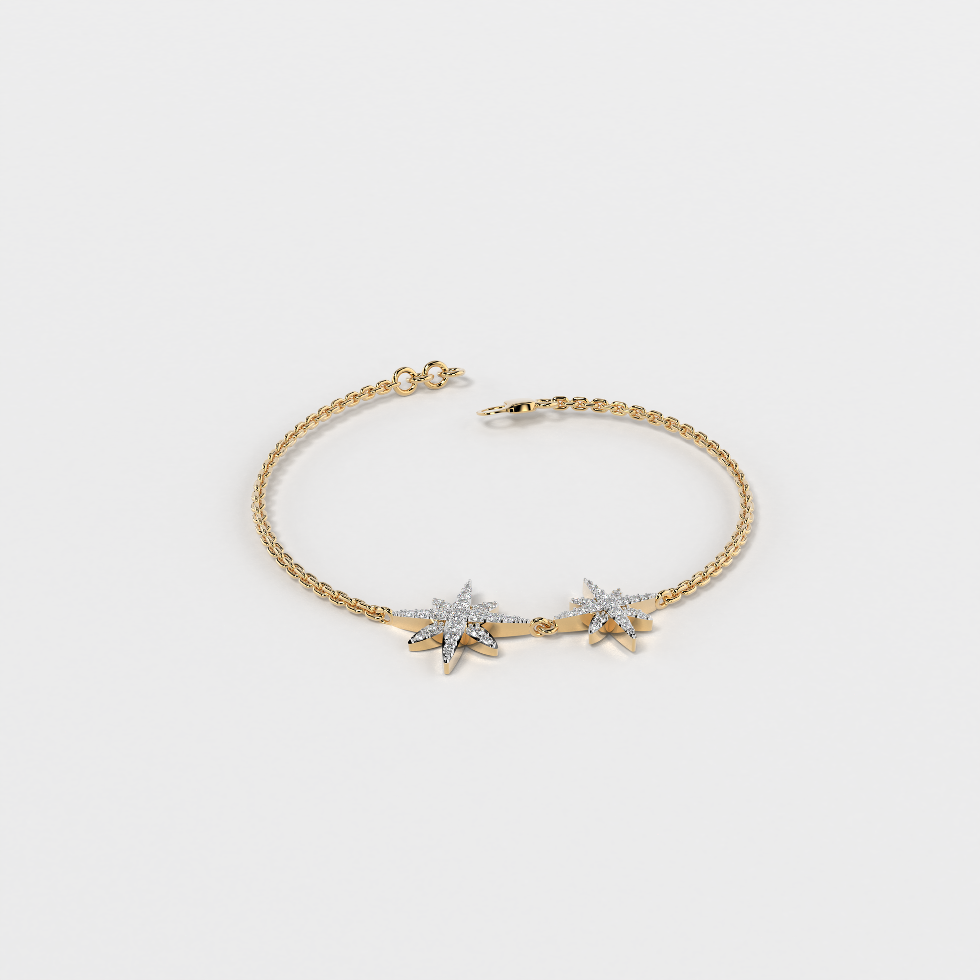 Embrace the allure of the night sky with the "Stellar Radiance Bracelet" from Elior Jewel, a design as mesmerizing as a clear, starlit evening. Crafted with precision, this bracelet captivates with its modern, edgy design featuring sparkling star-shaped motifs. Each star on the bracelet is meticulously set with brilliant diamonds, arranged to showcase a radiant glow that mimics the celestial wonders of the cosmos. The stars are connected by a delicate gold chain, ensuring that the bracelet sits elegantly on the wrist. The "Stellar Radiance Bracelet" is not only a symbol of beauty and elegance but also a testament to superior craftsmanship. This piece is designed for those who dare to shine brightly, perfect for adding a touch of glamour to any evening look or elevating day wear with a hint of celestial sparkle.
