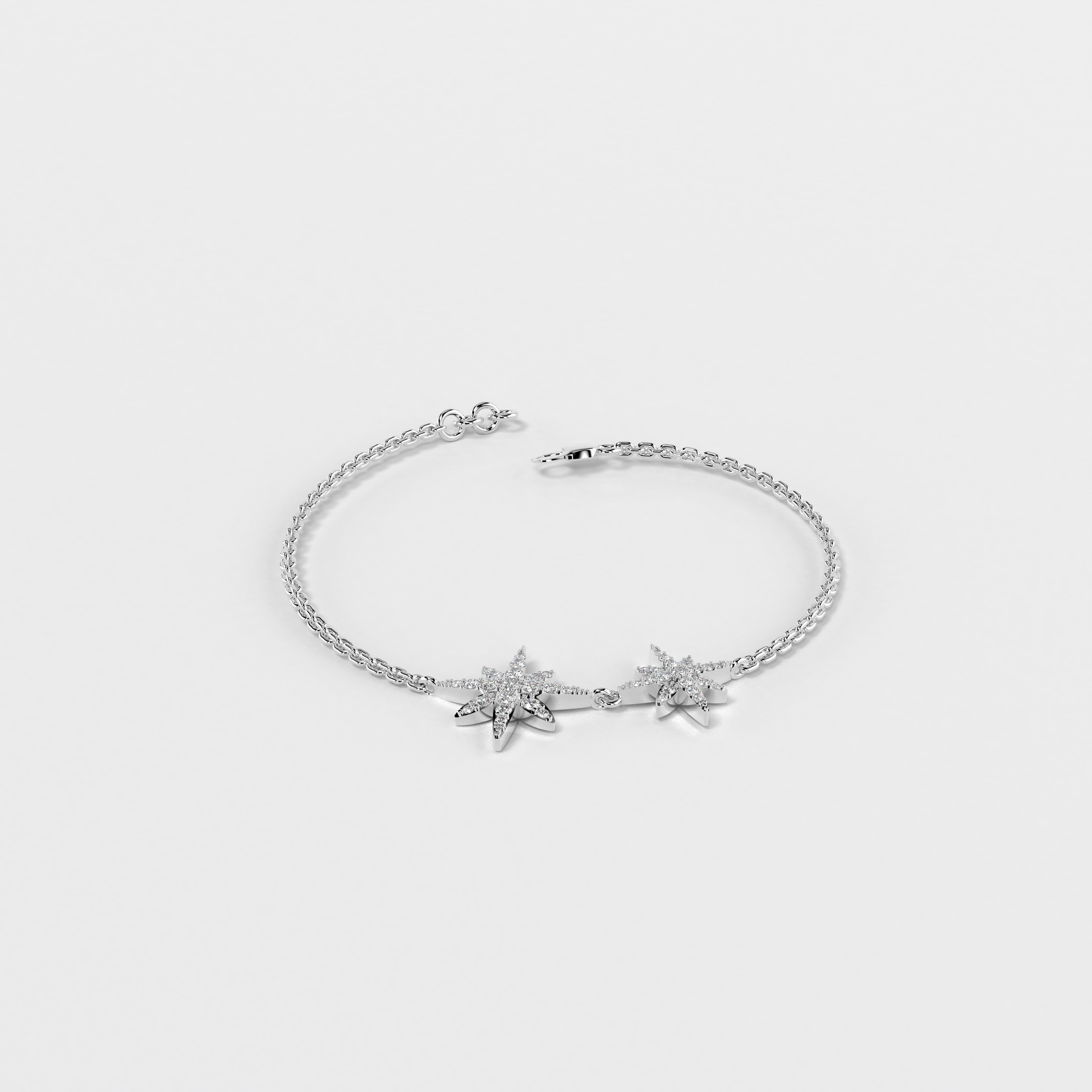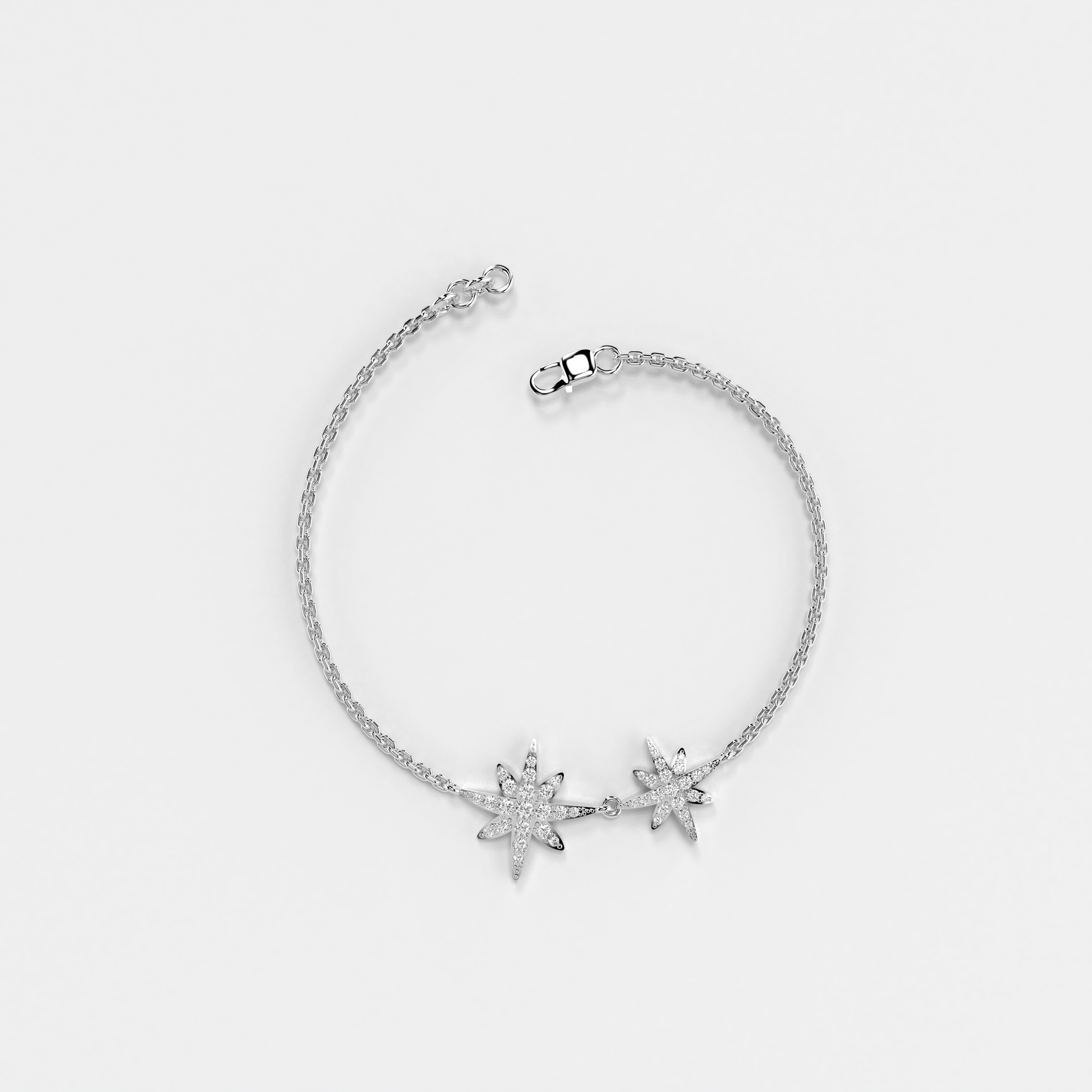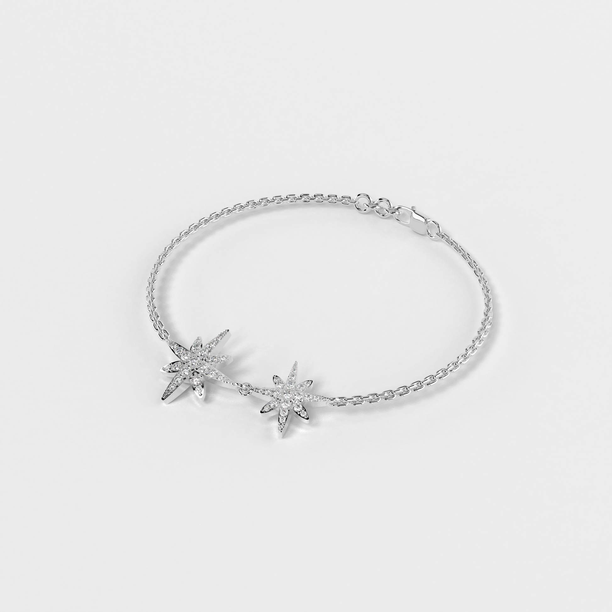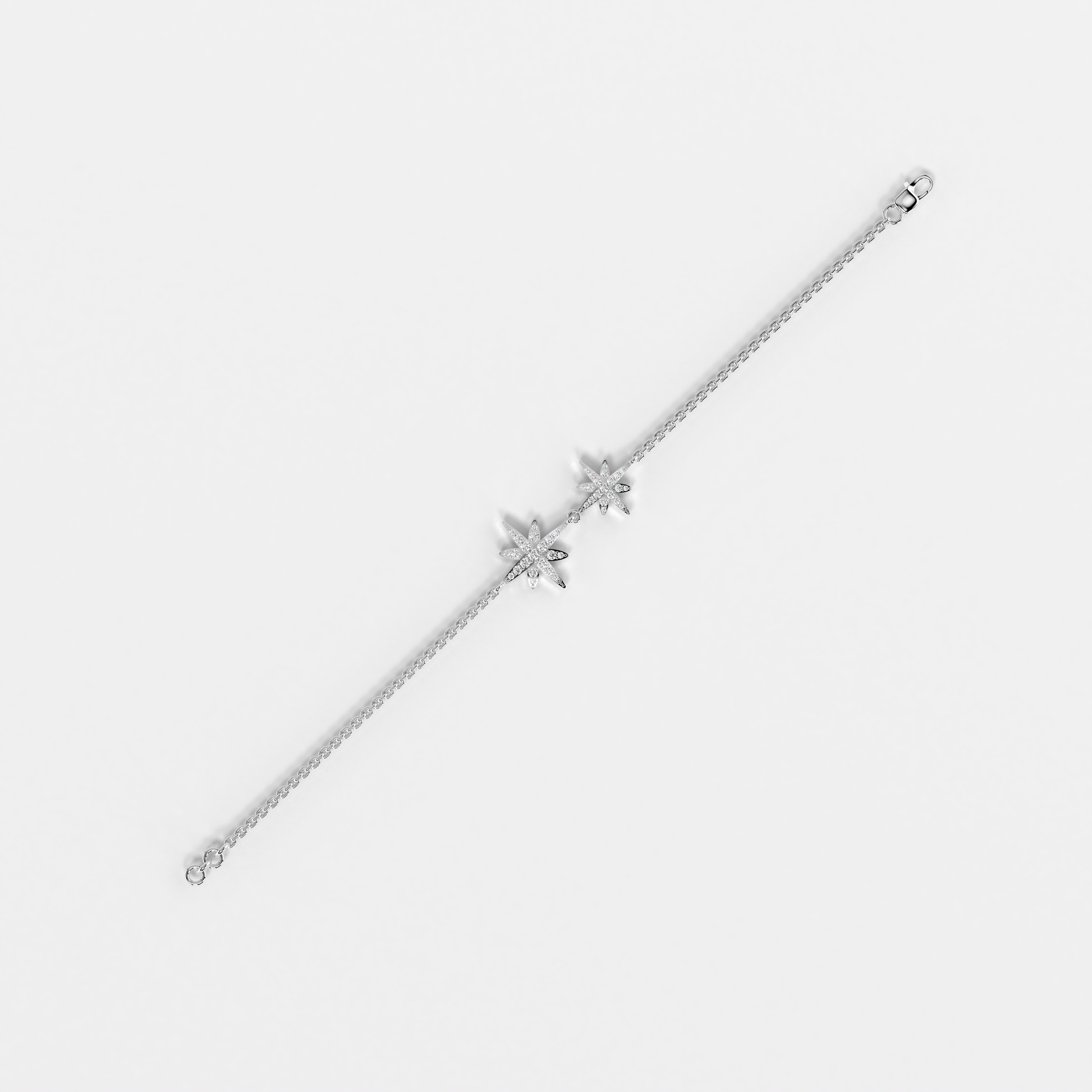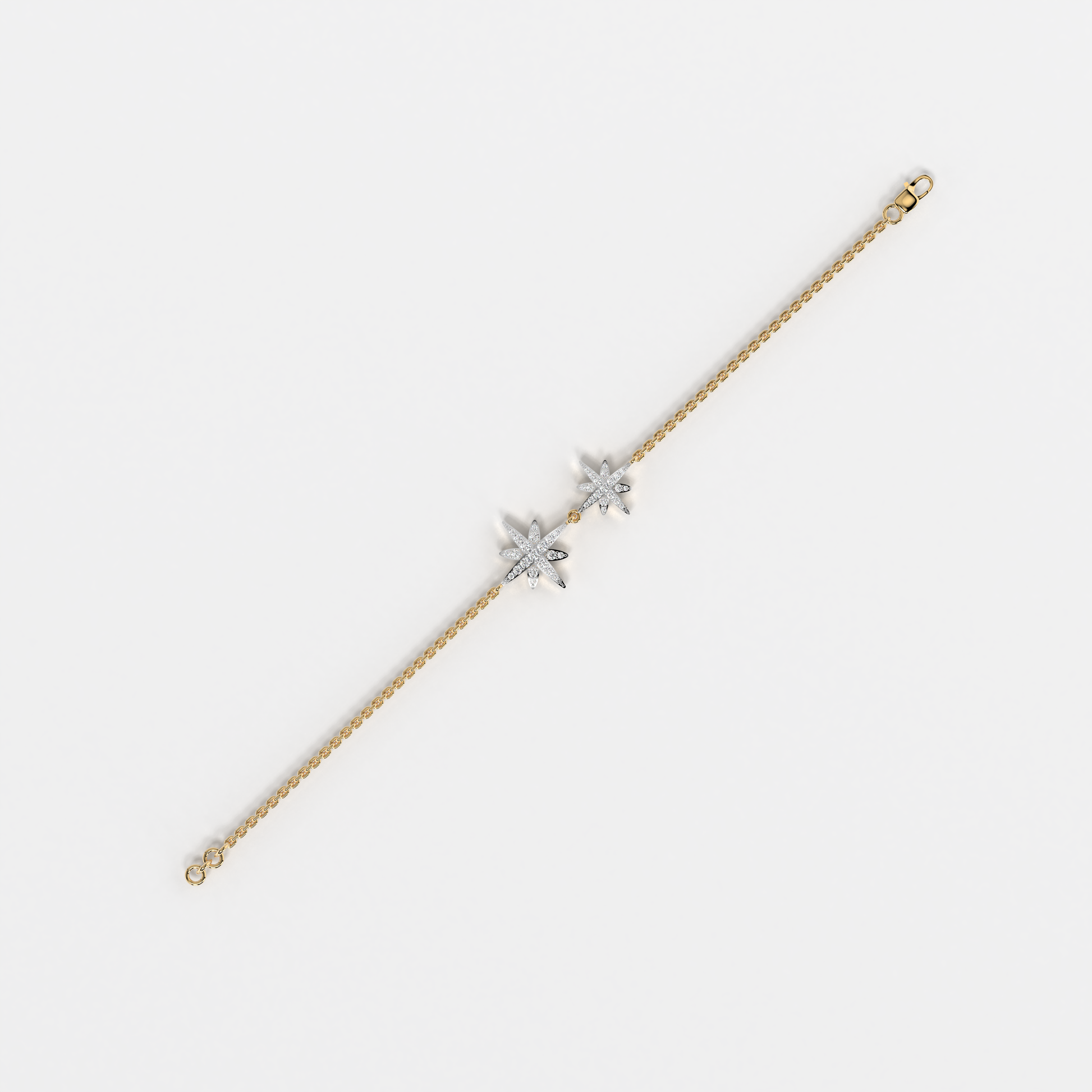 Embrace the allure of the night sky with the "Stellar Radiance Bracelet" from Elior Jewel, a design as mesmerizing as a clear, starlit evening. Crafted with precision, this bracelet captivates with its modern, edgy design featuring sparkling star-shaped motifs. Each star on the bracelet is meticulously set with brilliant diamonds, arranged to showcase a radiant glow that mimics the celestial wonders of the cosmos. The stars are connected by a delicate gold chain, ensuring that the bracelet sits elegantly on the wrist. The "Stellar Radiance Bracelet" is not only a symbol of beauty and elegance but also a testament to superior craftsmanship. This piece is designed for those who dare to shine brightly, perfect for adding a touch of glamour to any evening look or elevating day wear with a hint of celestial sparkle.