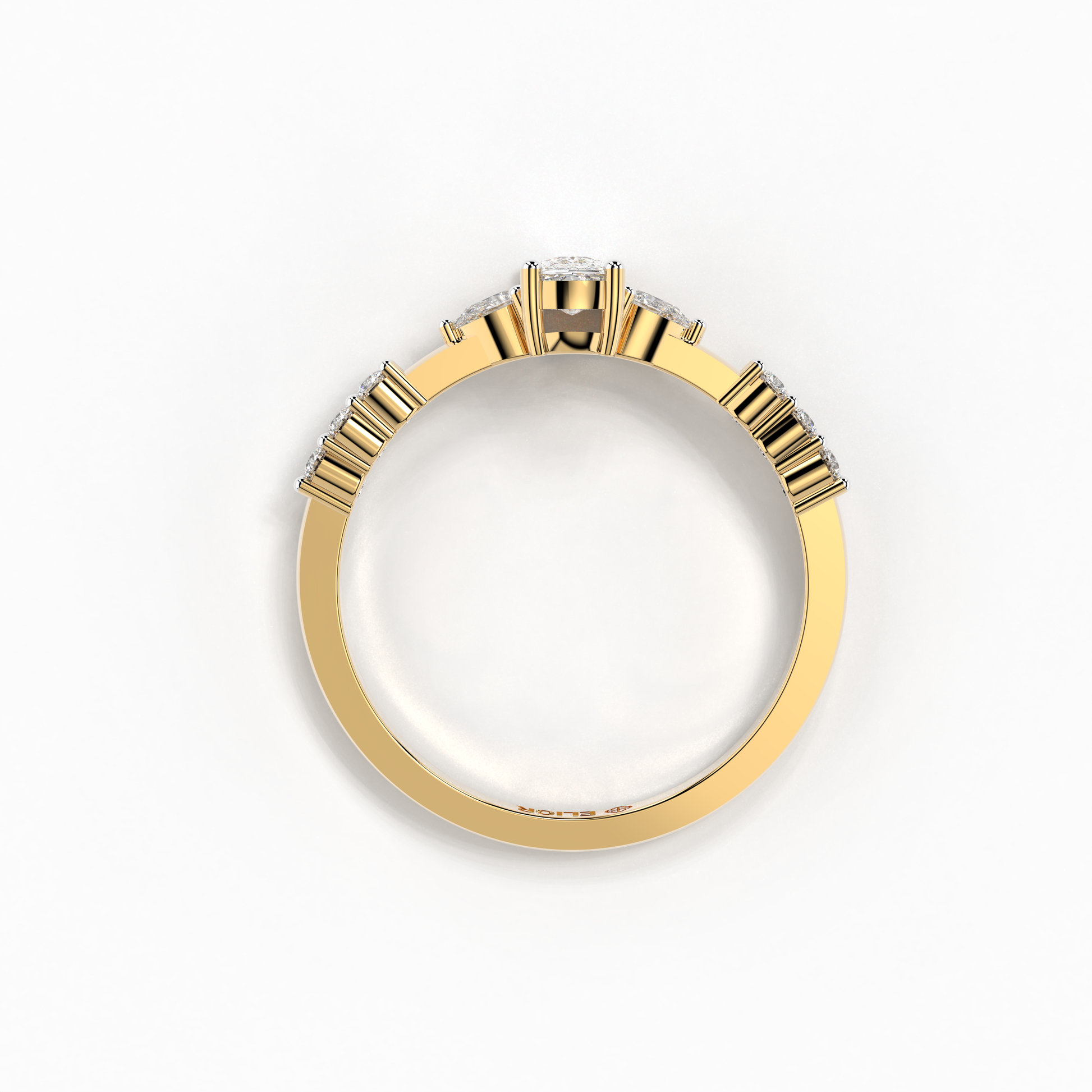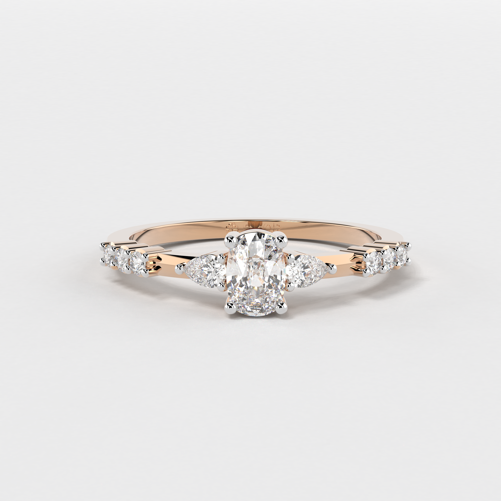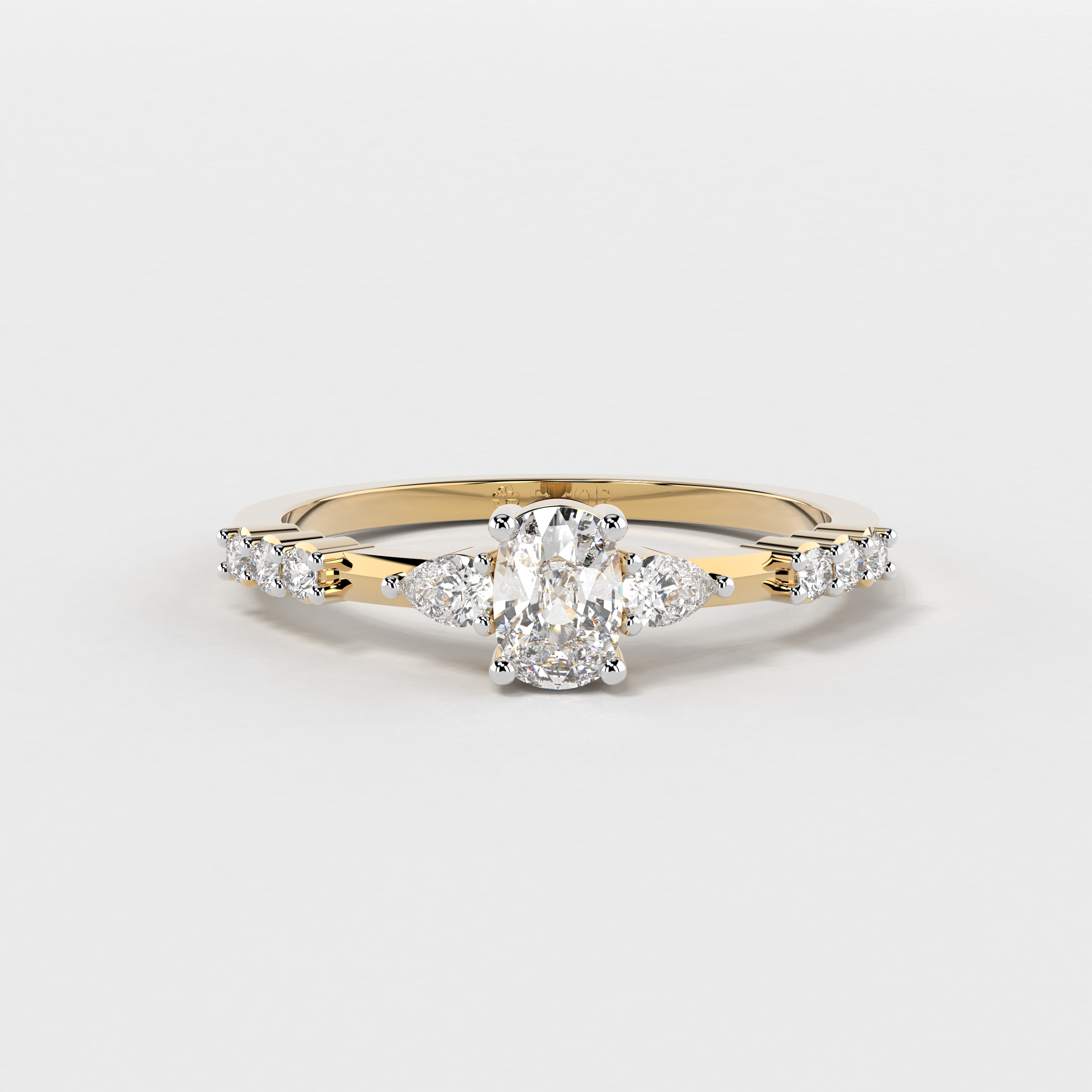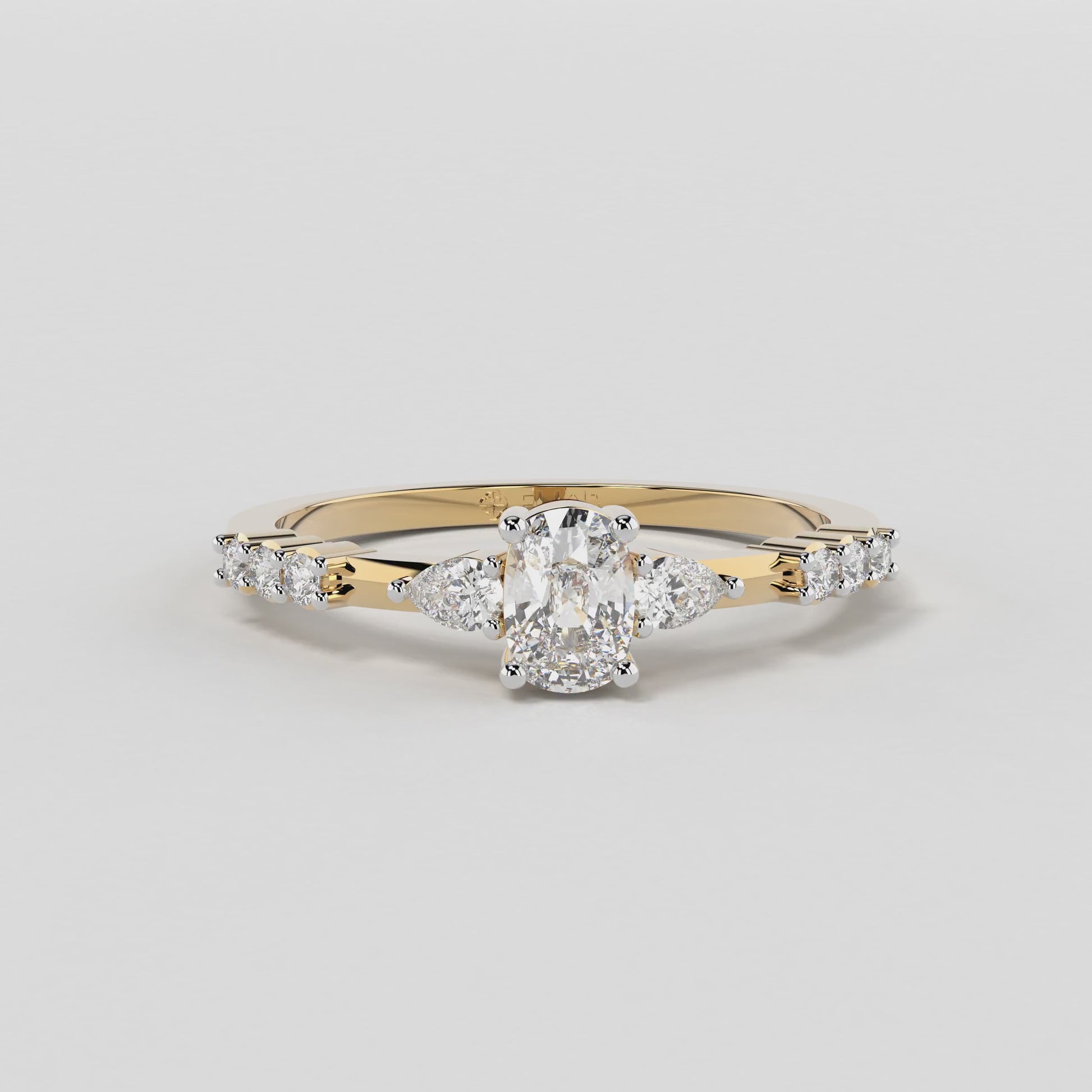 Elior Jewel's 'Trilogy Cushion Ring' presents a captivating fusion of classic charm and modern design. This ring centers around a magnificent cushion-cut diamond, weighing 0.38 carats approximately, flanked by two elegant pear-shaped diamonds of 0.09 carats, each adding a symmetrical grace to the central stone's brilliance. Completing the ensemble, six round-cut diamonds, totaling 0.08 carats approximately, line the band, lending a timeless allure with a contemporary edge. The 'Trilogy Cushion Ring' is a celebration of love's past, present, and future, making it a perfect symbol for those treasured moments.