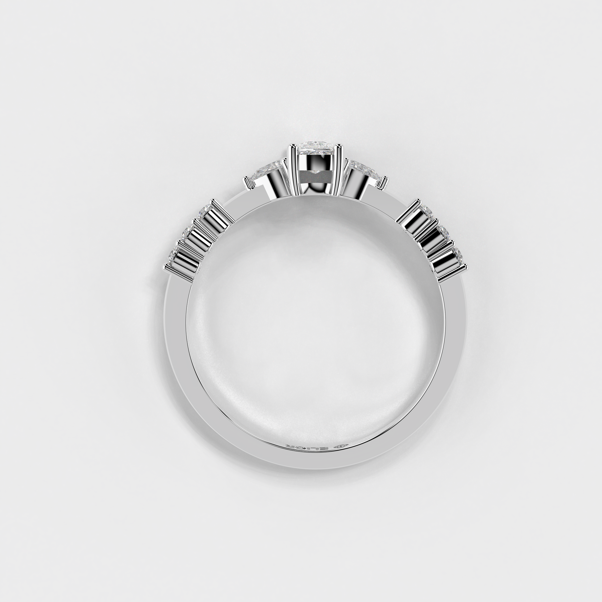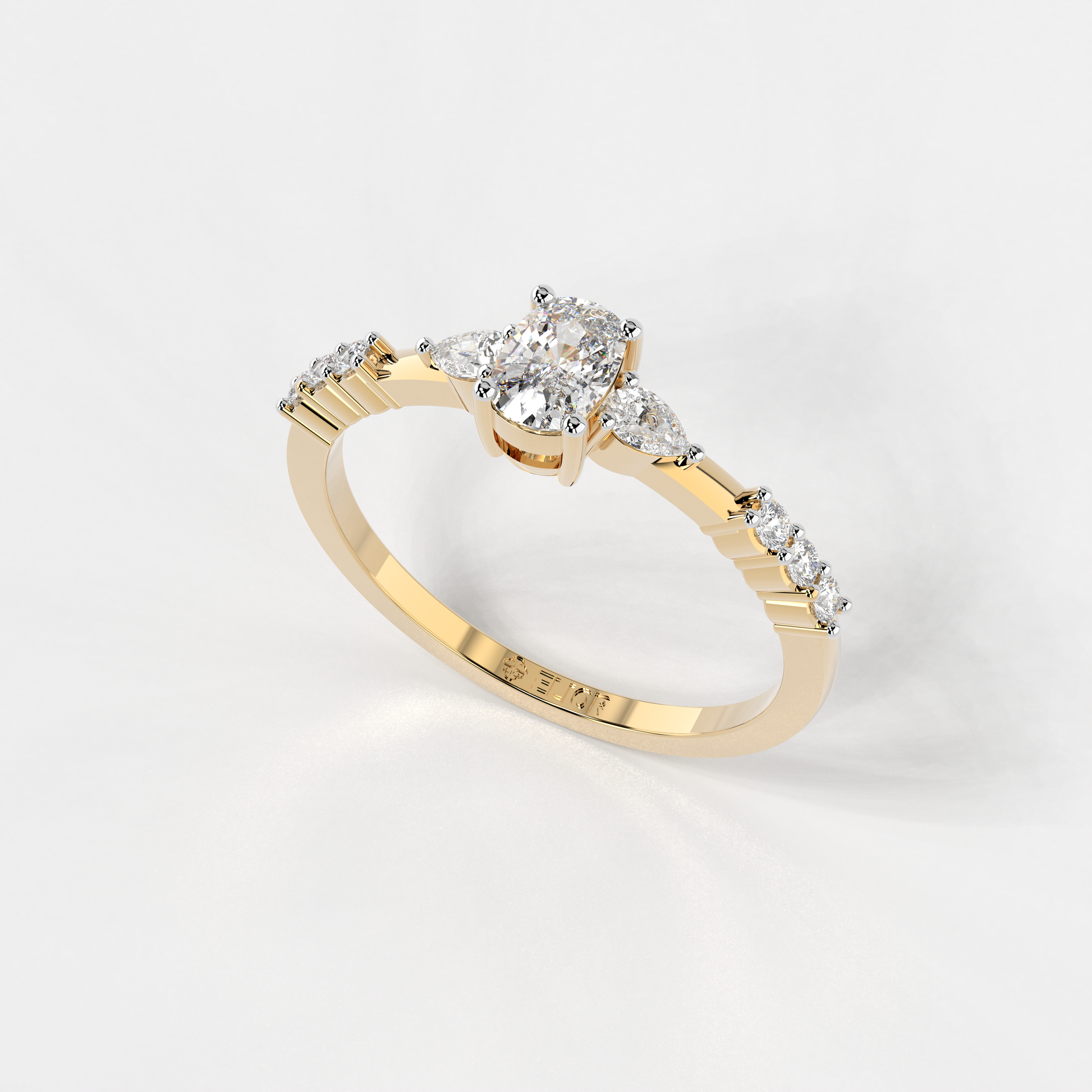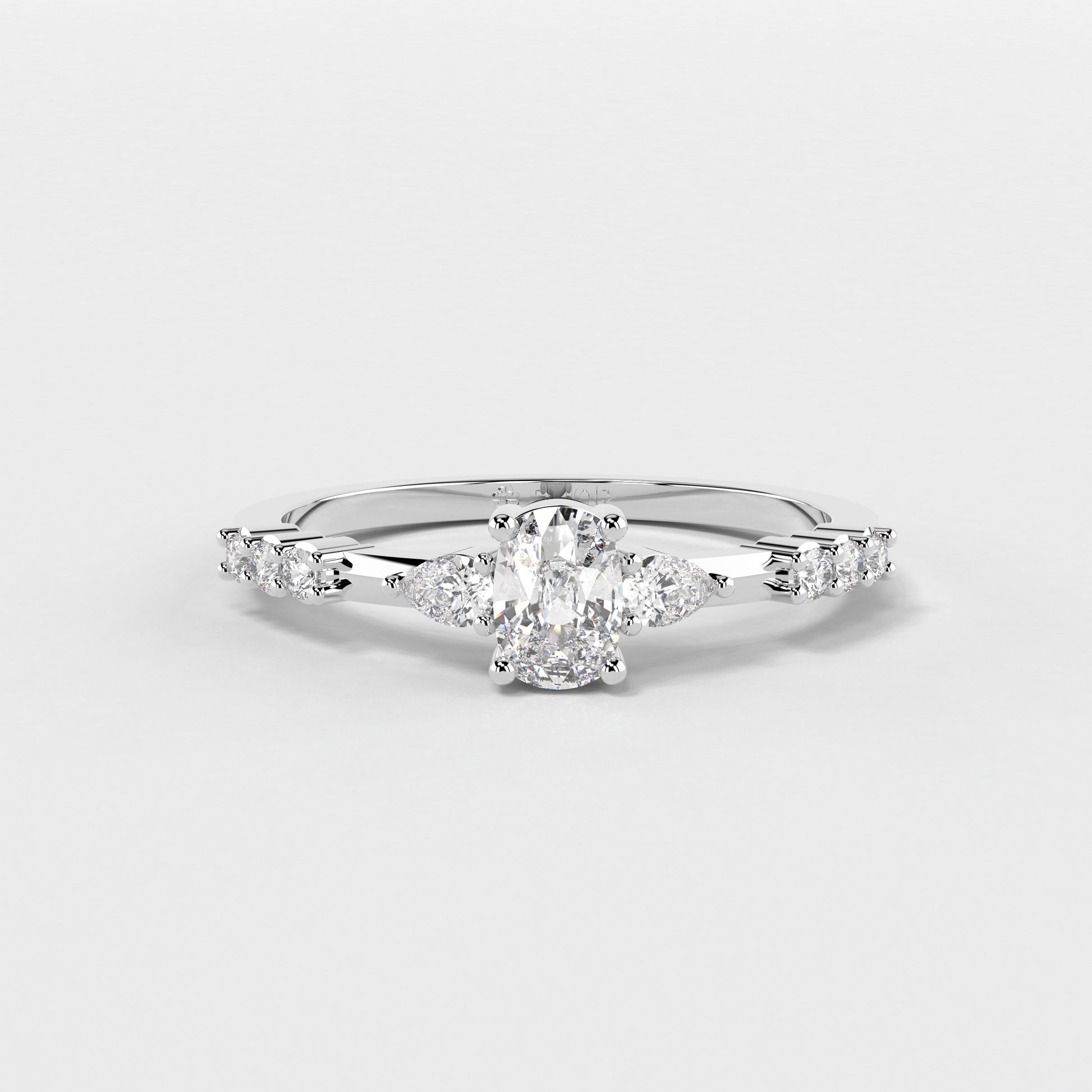 Elior Jewel's 'Trilogy Cushion Ring' presents a captivating fusion of classic charm and modern design. This ring centers around a magnificent cushion-cut diamond, weighing 0.38 carats approximately, flanked by two elegant pear-shaped diamonds of 0.09 carats, each adding a symmetrical grace to the central stone's brilliance. Completing the ensemble, six round-cut diamonds, totaling 0.08 carats approximately, line the band, lending a timeless allure with a contemporary edge. The 'Trilogy Cushion Ring' is a celebration of love's past, present, and future, making it a perfect symbol for those treasured moments.