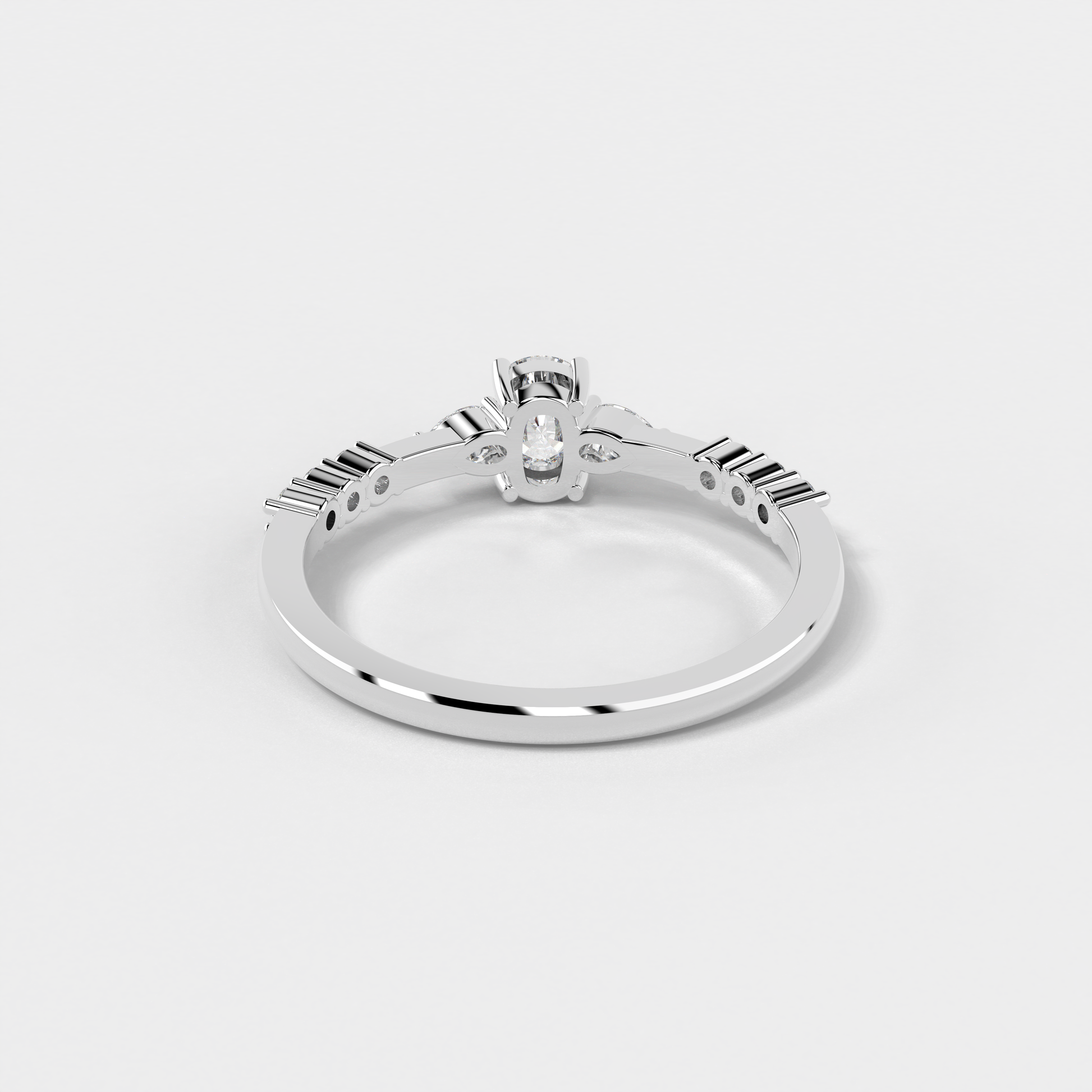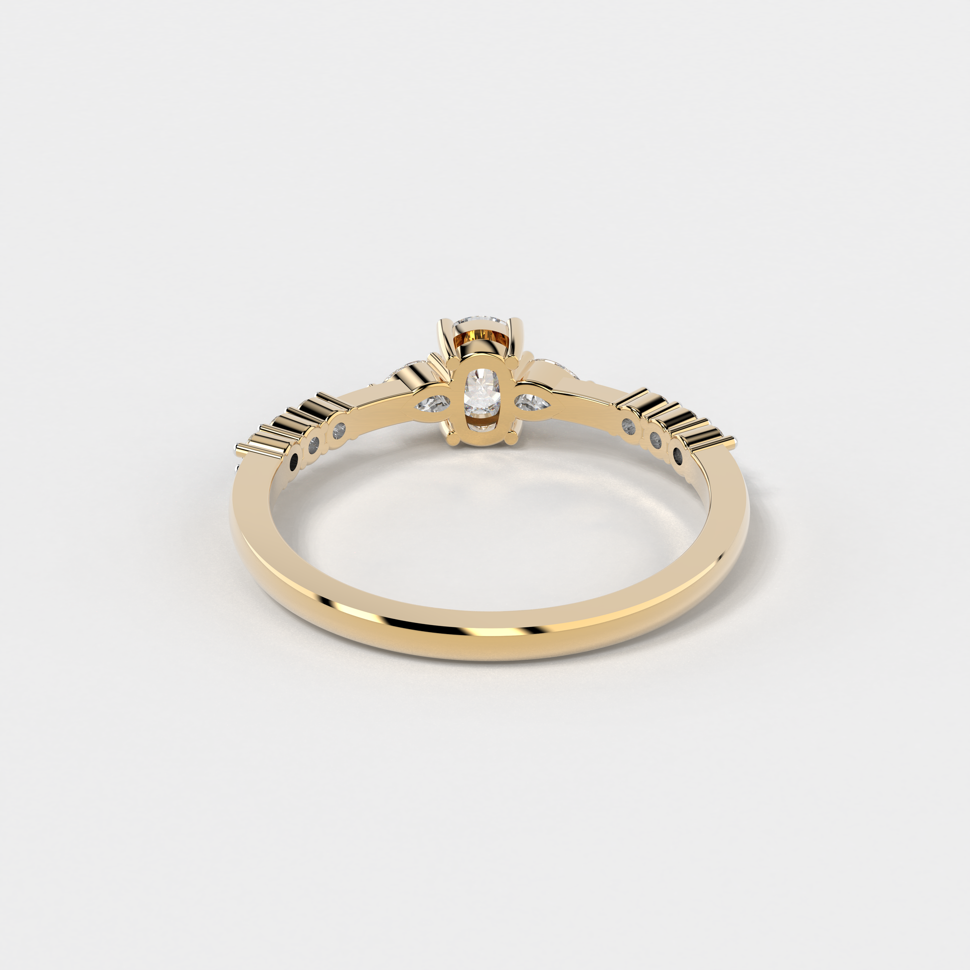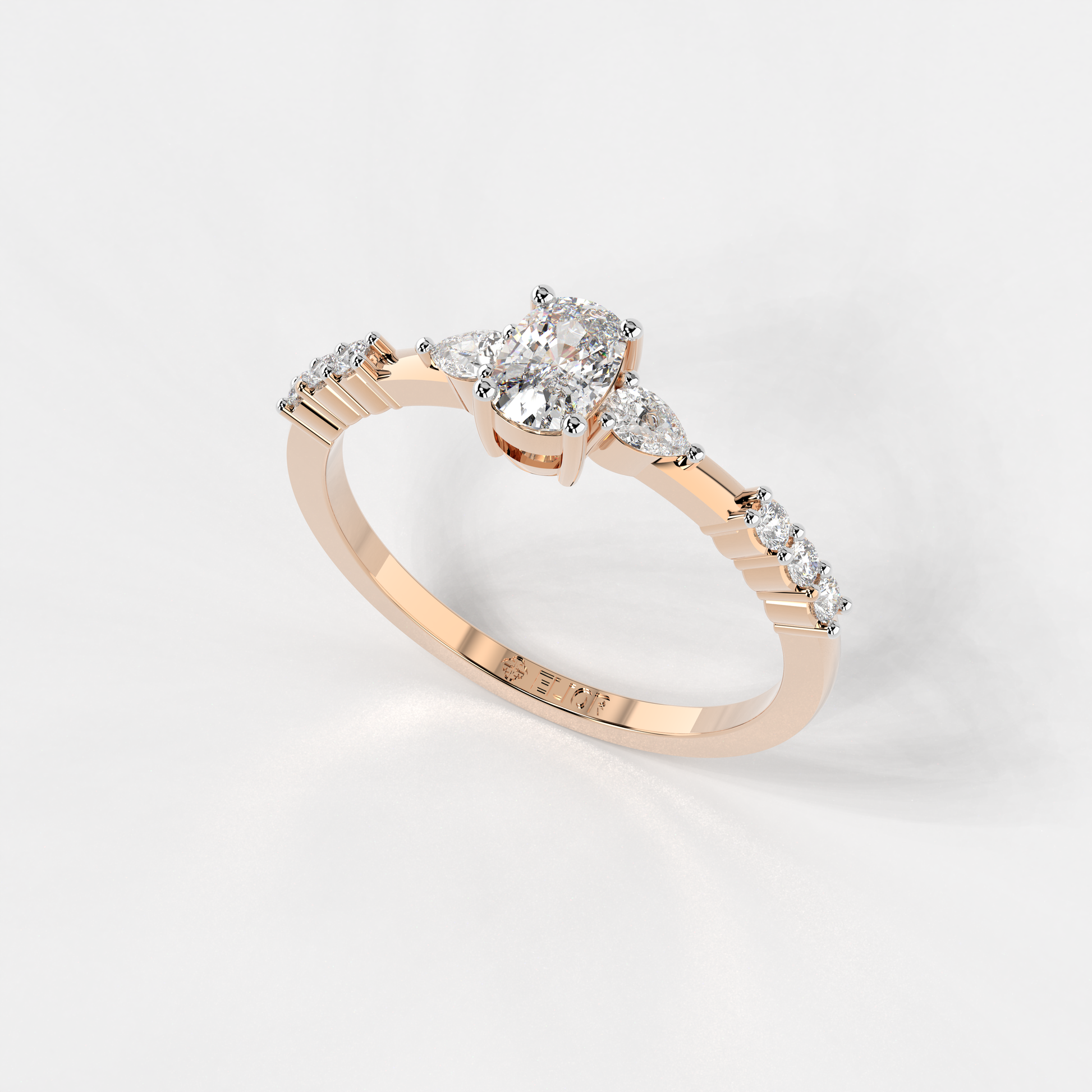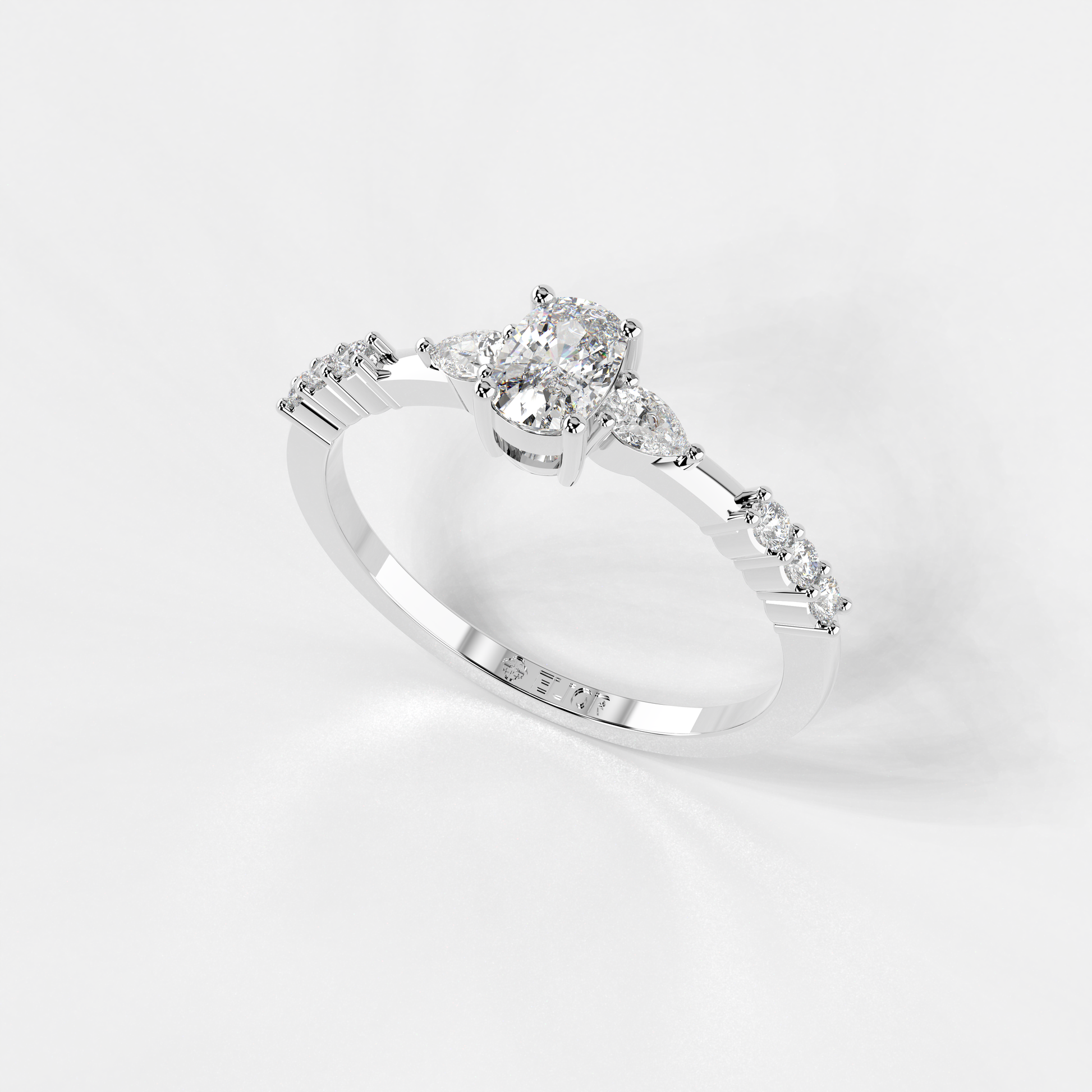 Elior Jewel's 'Trilogy Cushion Ring' presents a captivating fusion of classic charm and modern design. This ring centers around a magnificent cushion-cut diamond, weighing 0.38 carats approximately, flanked by two elegant pear-shaped diamonds of 0.09 carats, each adding a symmetrical grace to the central stone's brilliance. Completing the ensemble, six round-cut diamonds, totaling 0.08 carats approximately, line the band, lending a timeless allure with a contemporary edge. The 'Trilogy Cushion Ring' is a celebration of love's past, present, and future, making it a perfect symbol for those treasured moments.