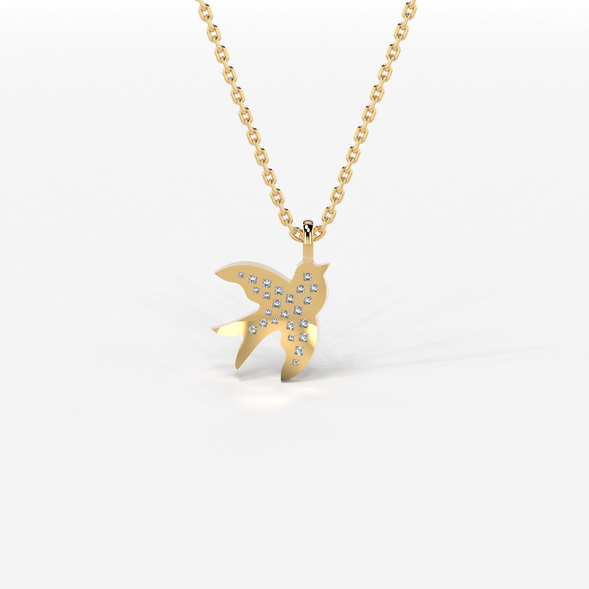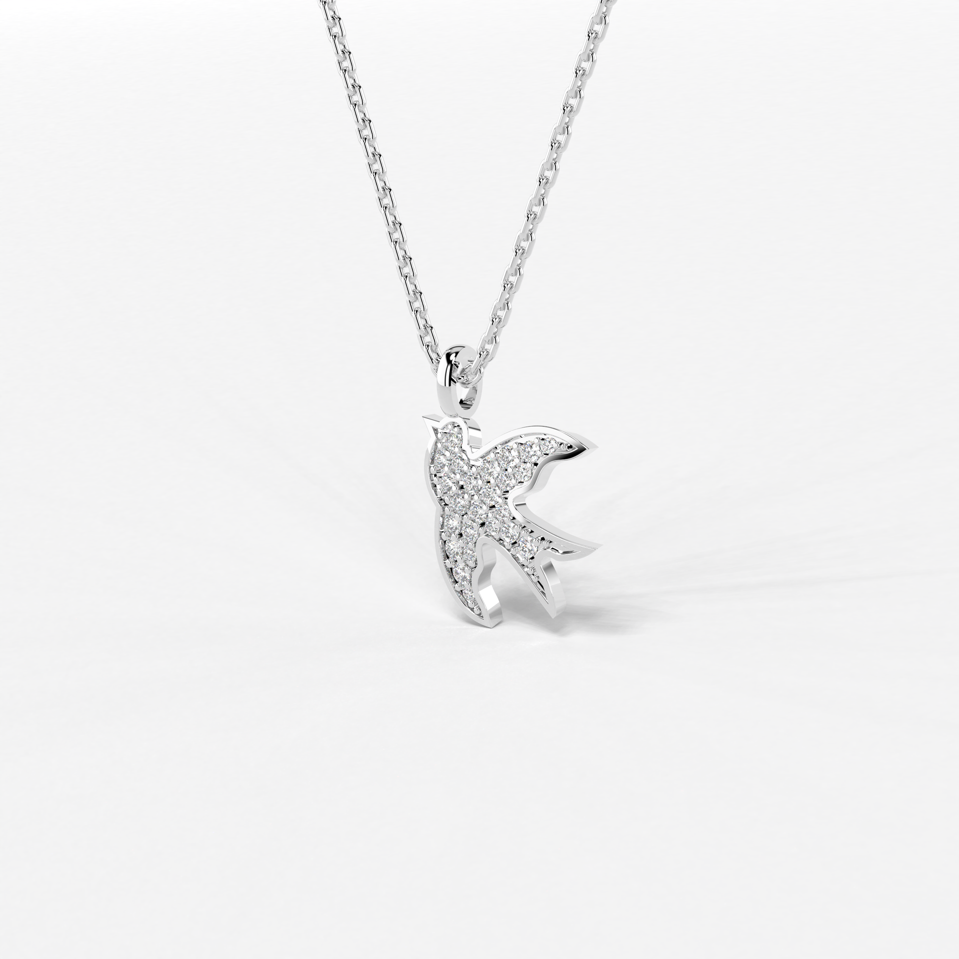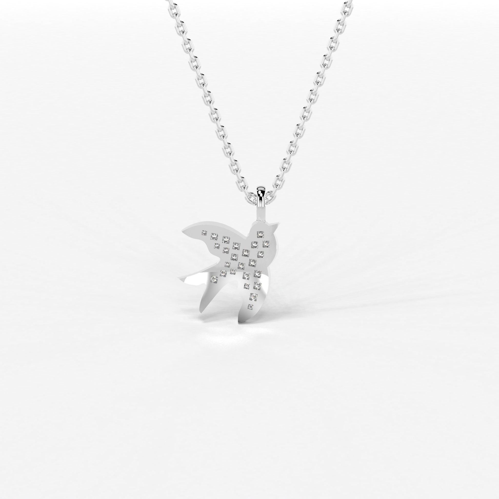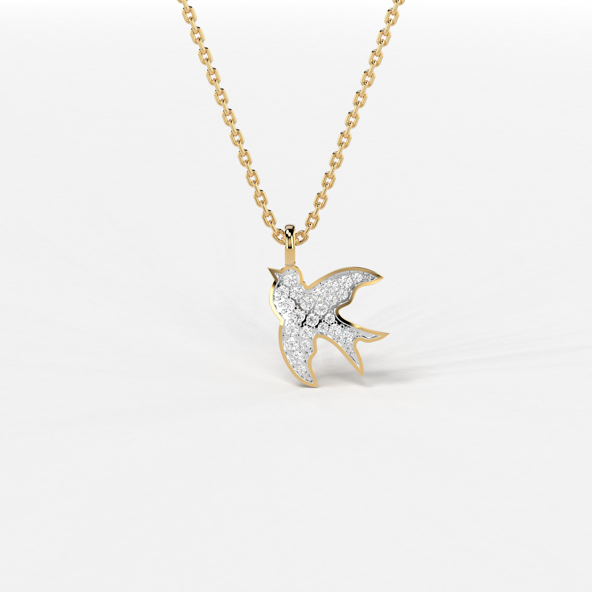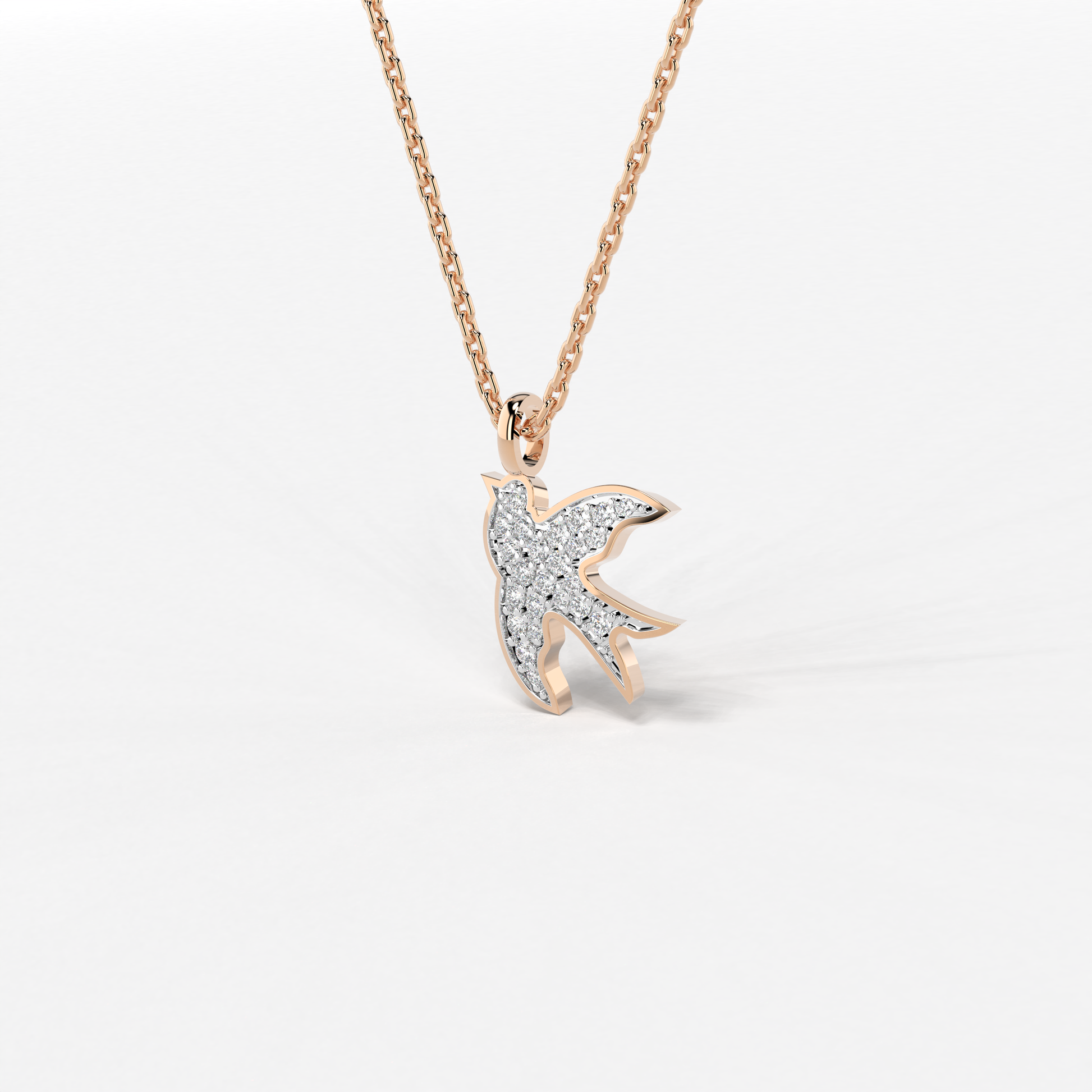 Soar into the day with the "Wings of Dawn Diamond Pendant" from Elior Jewel, a piece that celebrates the beauty of new beginnings and the freedom of flight. This pendant is inspired by the first light of dawn casting its rays over a bird in ascent. Delicately capturing the essence of a bird’s wings mid-flutter, this pendant is intricately studded with 24 round-cut diamonds totaling 0.320 carats approximately. The diamonds are strategically set to highlight the wings’ natural movement, creating a sparkling effect that mirrors the morning sun's reflection on delicate feathers. Measuring 19.00 mm in width, the "Wings of Dawn Diamond Pendant" is a striking piece that balances poise and panache. It's a versatile accessory, equally suited to casual day wear or as a standout piece for evening events. This pendant is a tribute to the spirit of hope and the grace of nature's winged creatures, making it an inspiring addition to any jewelry collection.